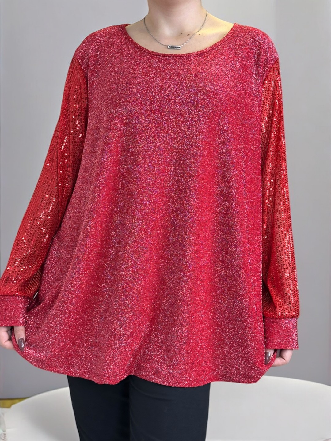 Εντυπωσίασε σε κάθε εμφάνισή σου με την Plus Size Μπλούζα Λούρεξ με λαμπερές παγέτες στα μανίκια. Συνδυάζει άνεση και στιλ, καθώς είναι κατασκευασμένη από 50% viscoza, 45% poliester και 5% elastan. One size που ταιριάζει σε όλες.