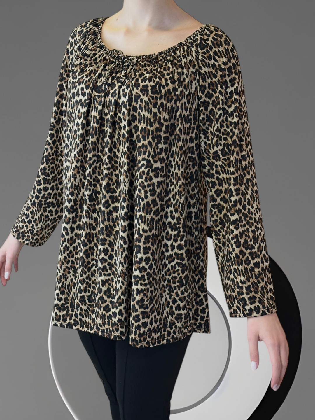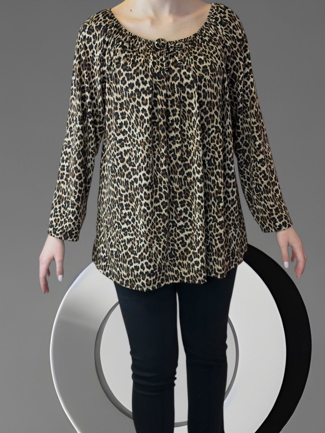 Απογείωσε το στυλ σου με αυτή τη λεοπαρ μπλούζα plus size. Μοναδικό, διαχρονικό κομμάτι που προσθέτει αυτόματα πολυτέλεια στην εμφάνισή σου. Διατίθεται σε one size για να ταιριάζει σε κάθε σωματότυπο.