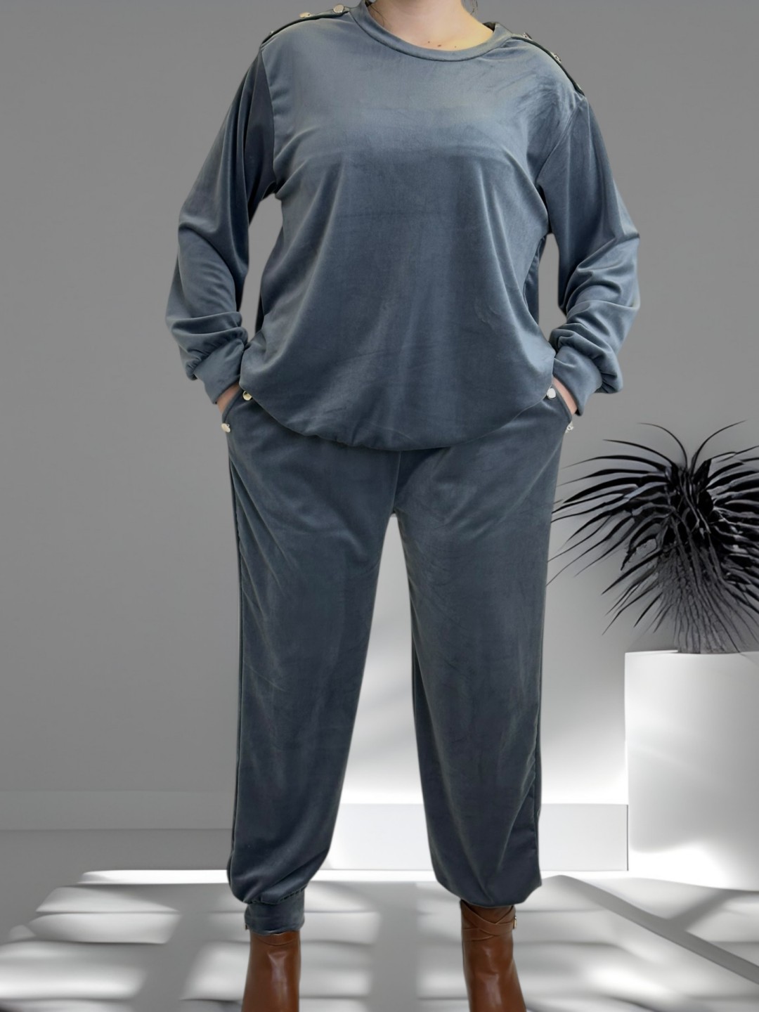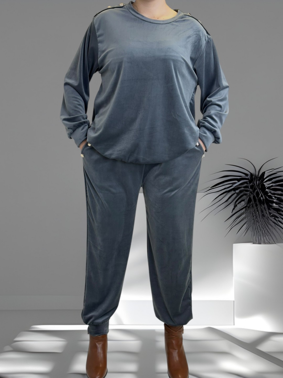 Φόρεσε αυτοπεποίθηση με το plus size βελούδινο σετ με διακοσμητικά κουμπιά. Άνετο και στυλάτο, ιδανικό για χαλάρωση και προσωπικές στιγμές. Διαθέσιμο σε one size.