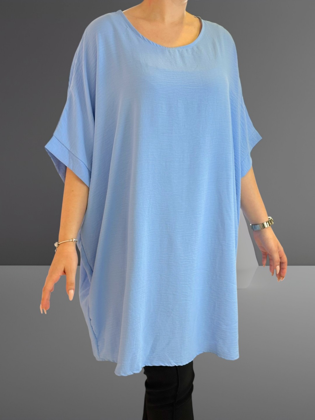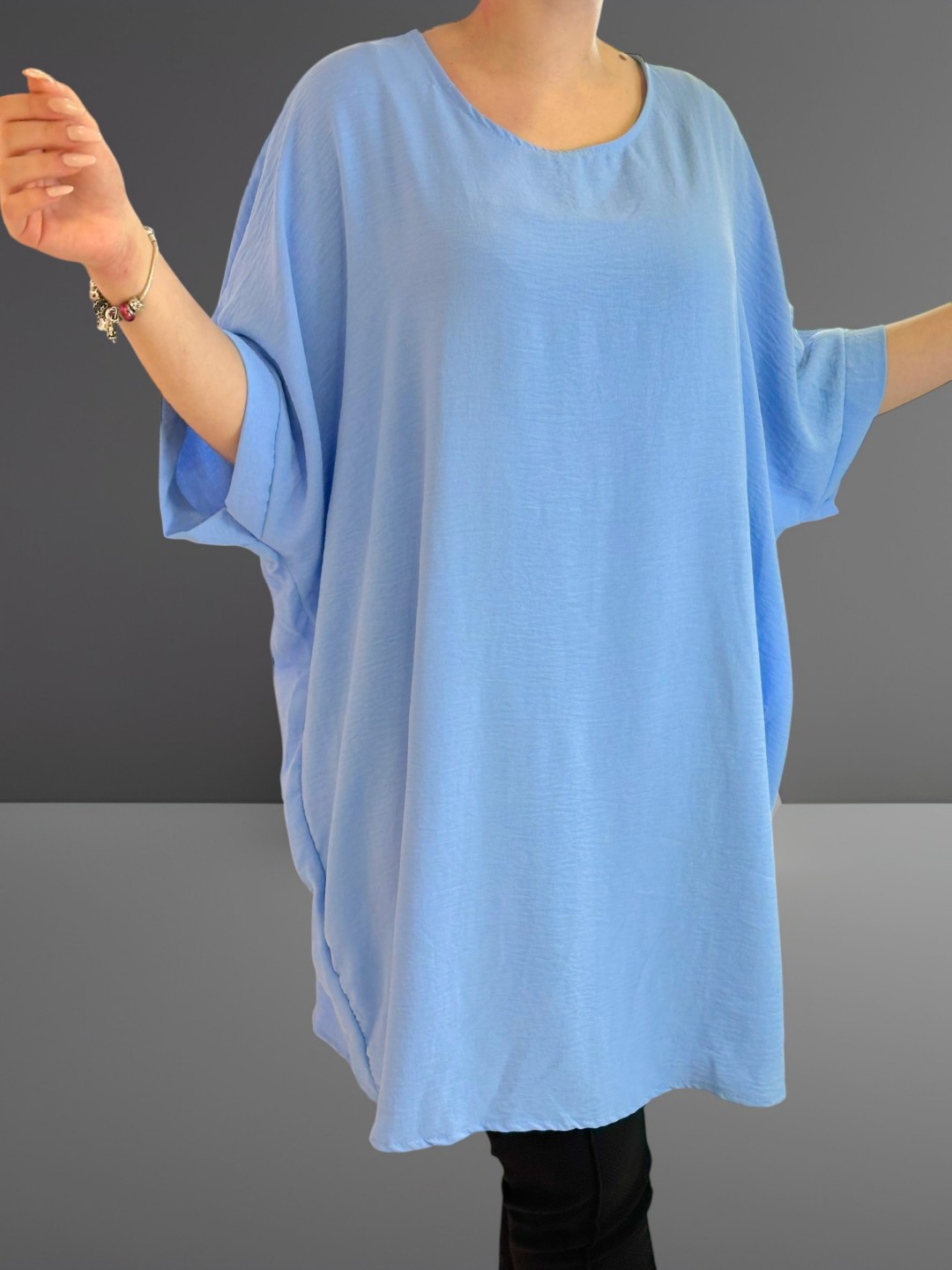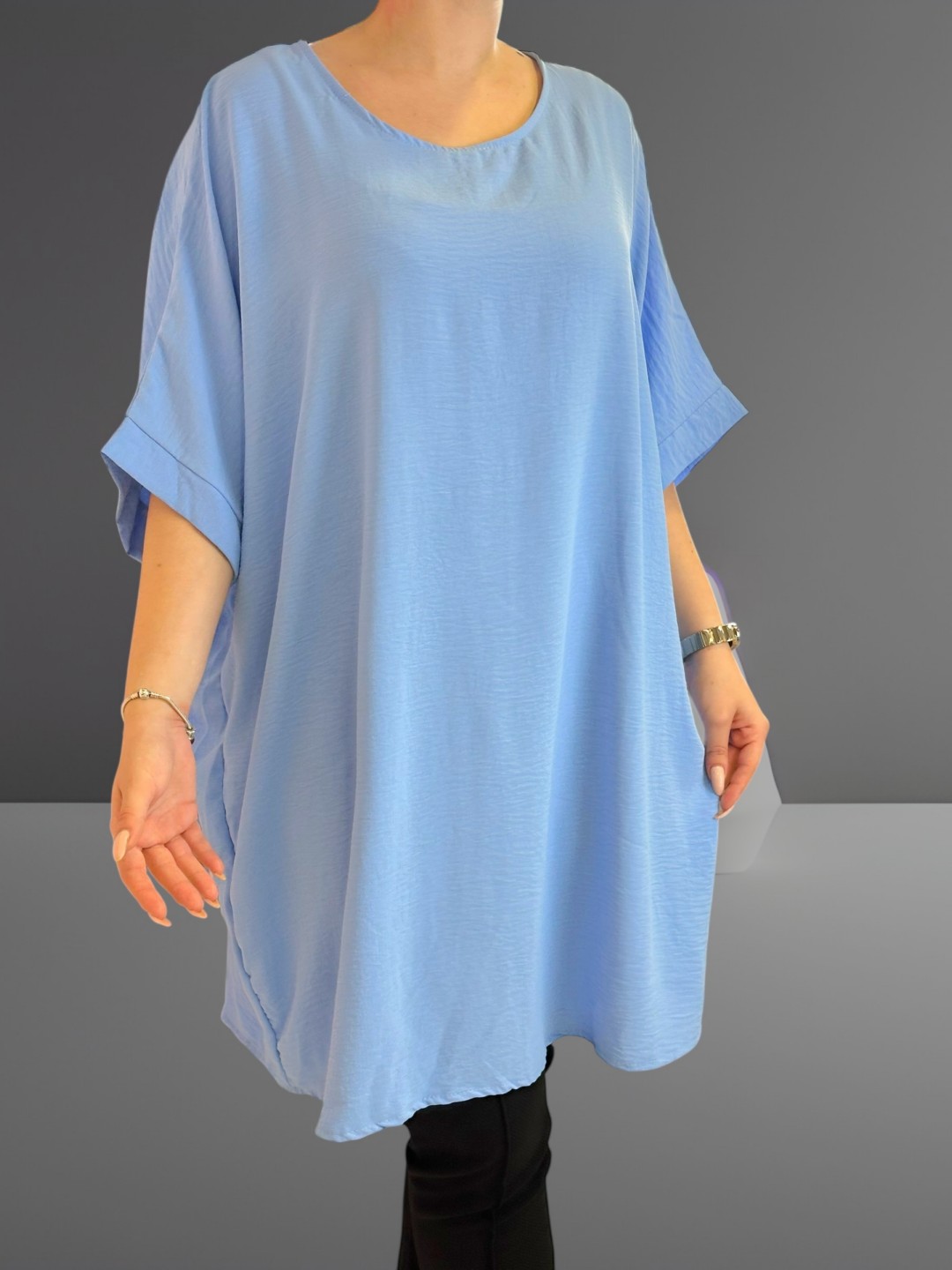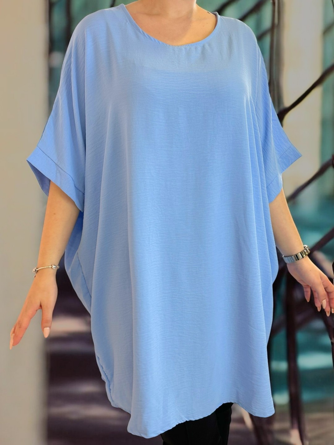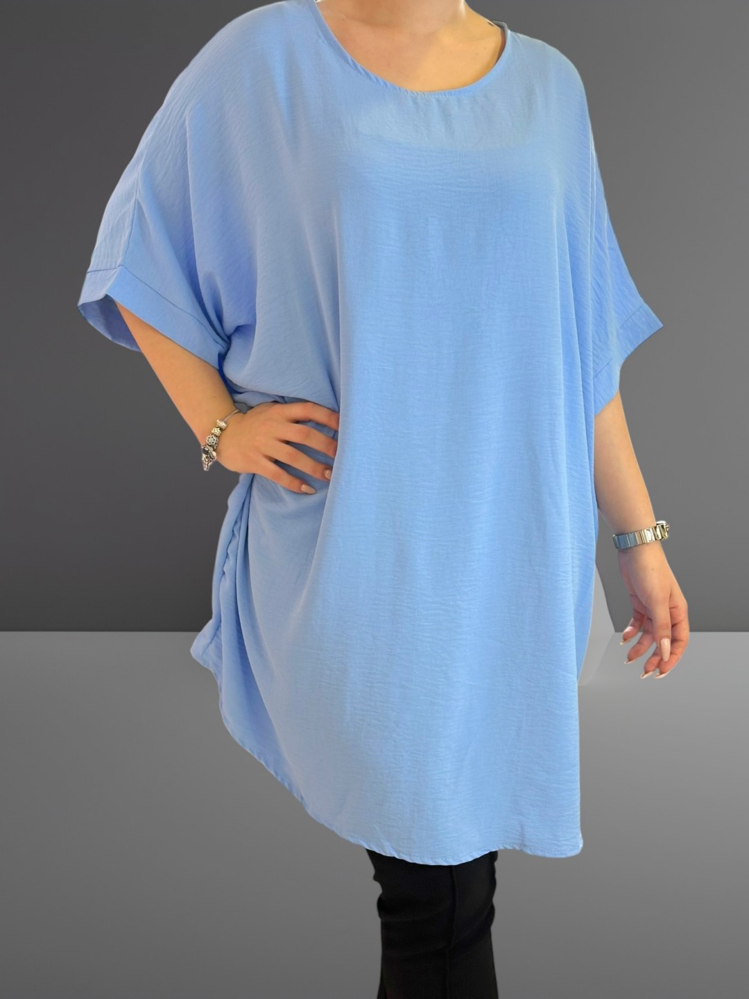 Αερινό plus size μπλουζοφόρεμα σε ύφασμα ζορζέτα, ιδανικό για κάθε σωματότυπο. Από 95% Βισκόζη και 5% ελαστάν, εξασφαλίζει άνεση και χάρη. Διαθέσιμο σε one size για ευκολοφόρετο, πάντα μοδάτο look.