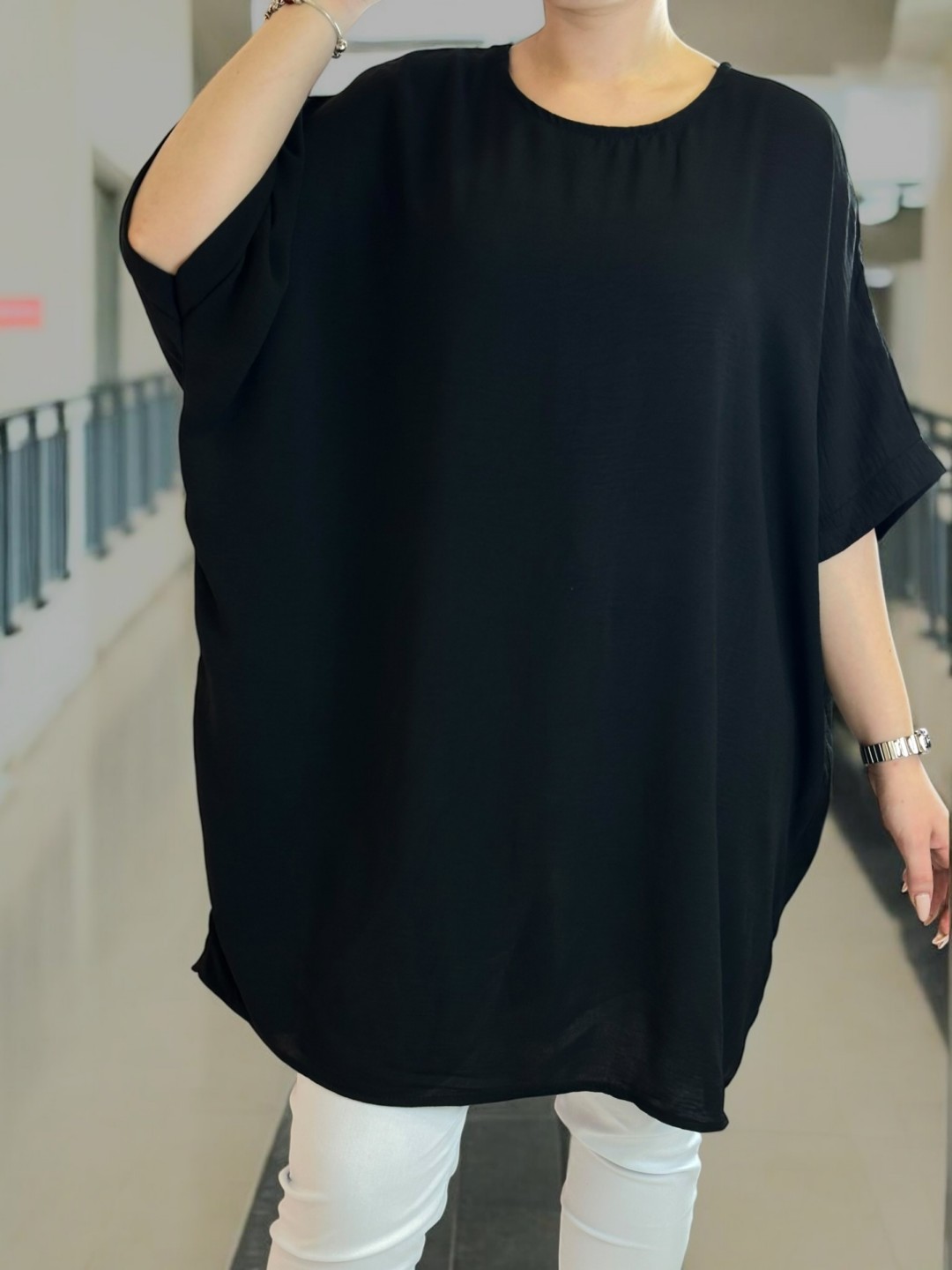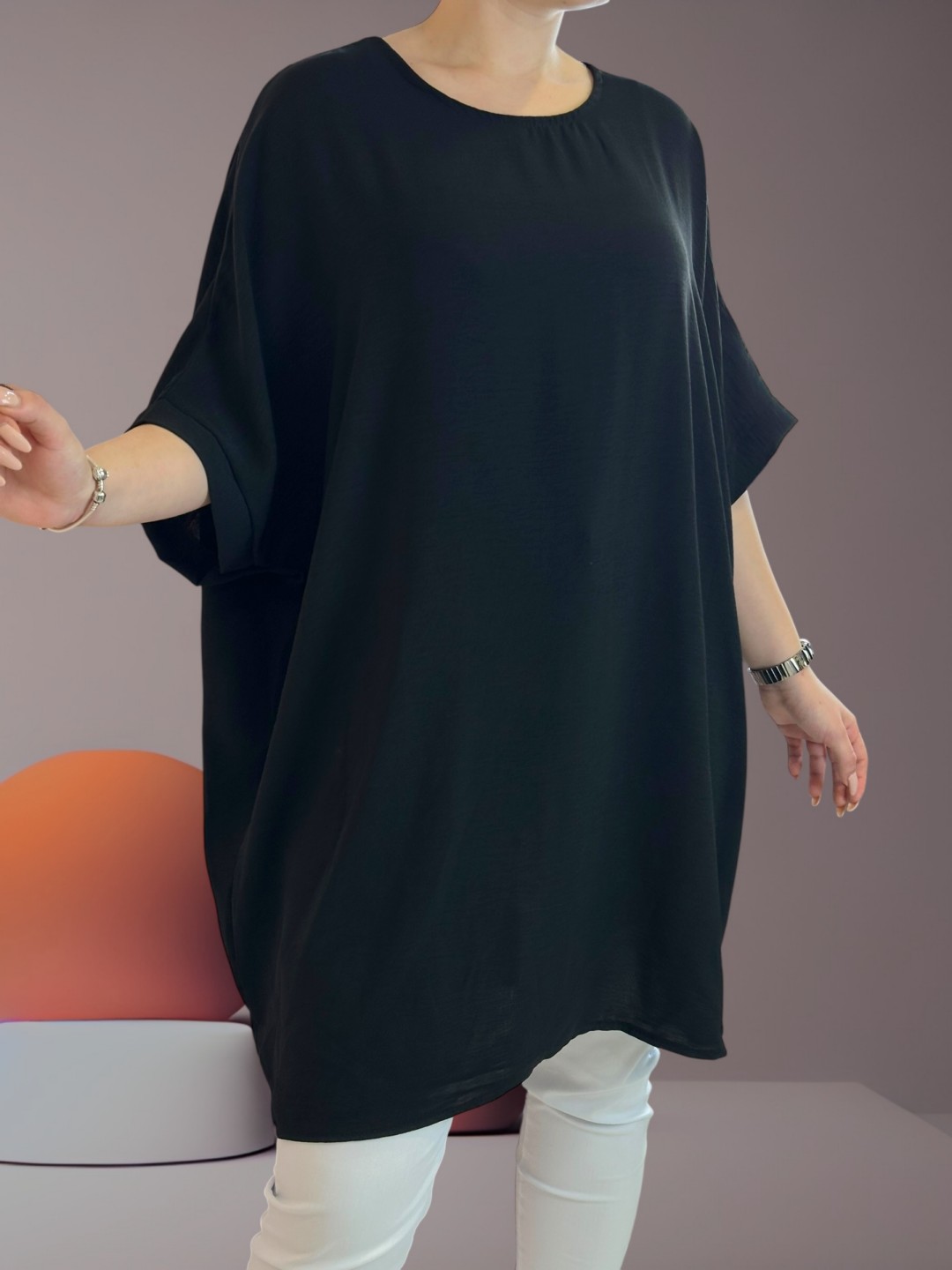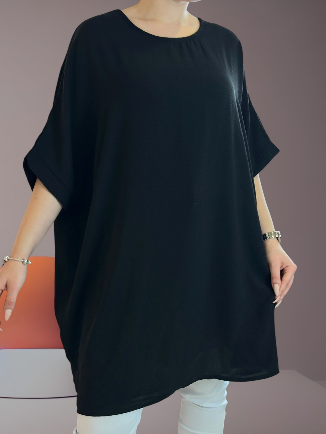 Ανανεώστε την γκαρνταρόμπα σας με αυτό το ευέλικτο μπλουζοφόρεμα σε ύφασμα ζορζέτα! Το plus size σχέδιο, σε μεγέθη One size, εγγυάται ότι ταιριάζει σε κάθε σωματότυπο. Με σύνθεση από 95% βισκόζη και 5% ελαστάν, σας προσφέρει άνεση και ελαστικότητα.