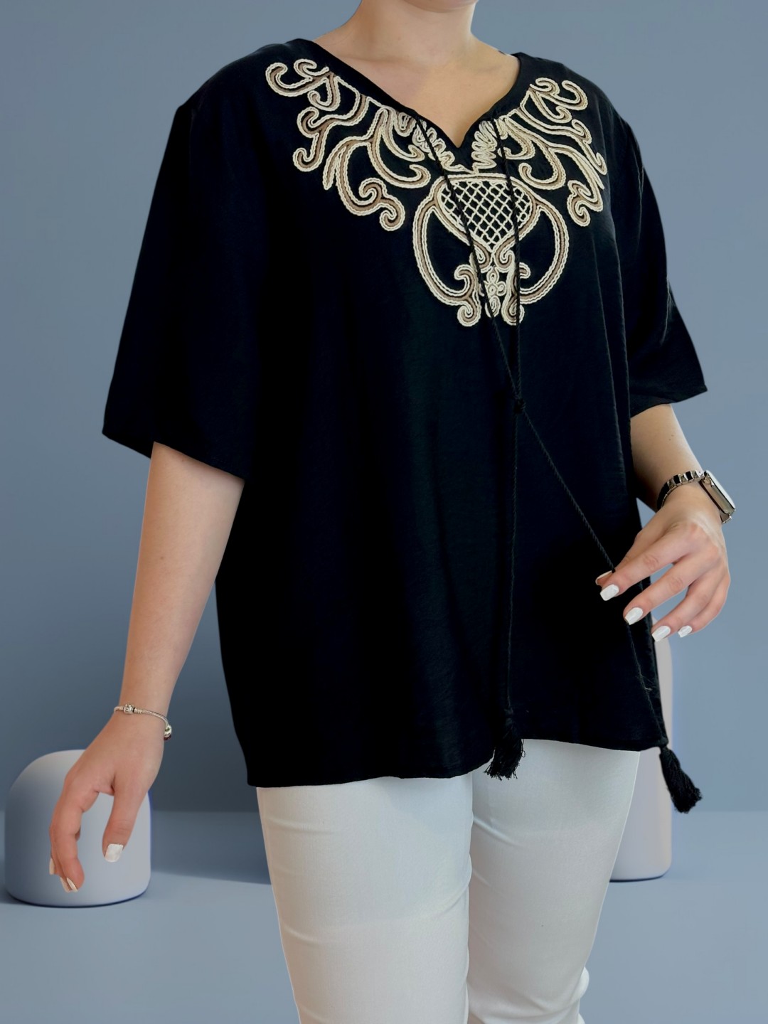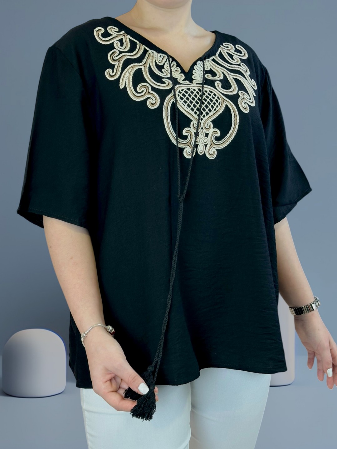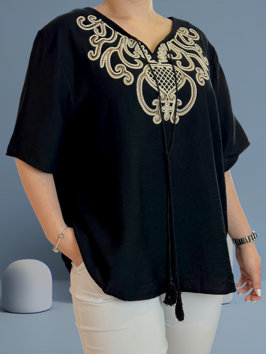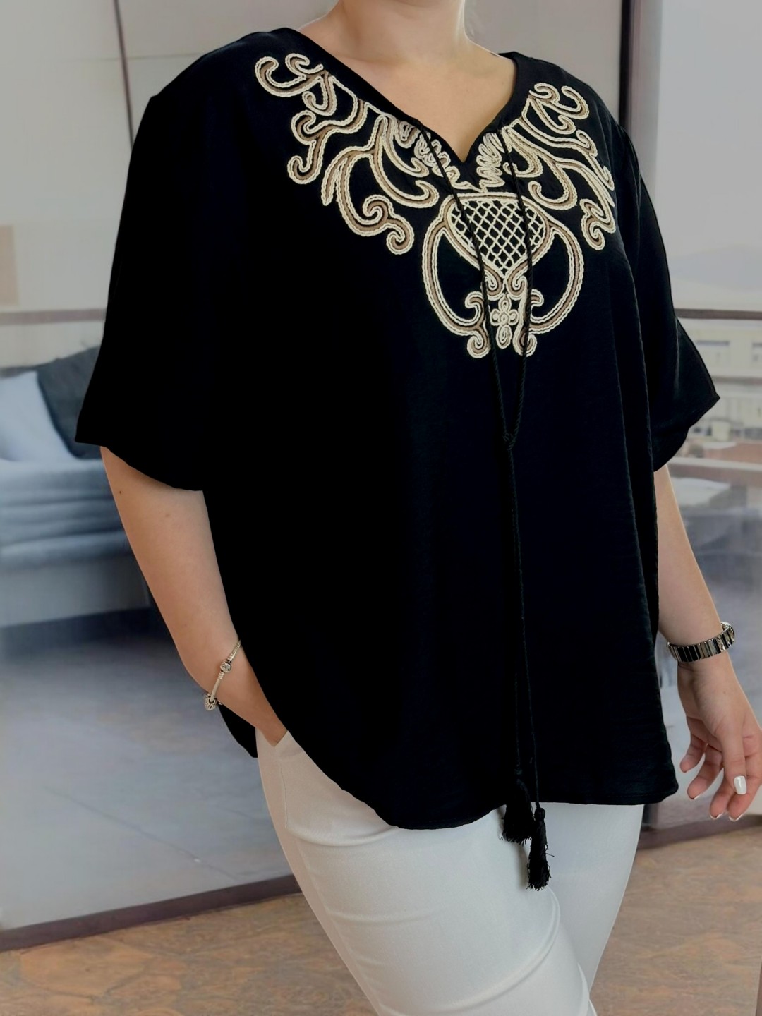 “Αποκτήστε τη boho μπλούζα με φουντίτσες, σχεδιασμένη για γυναίκες plus size. Έχει σύνθεση 35% Βισκόζη, 40% βαμβάκι, 10% ελαστάνη, 15% modal. Διατίθεται σε One size. Ξεχωρίστε με στυλ!”