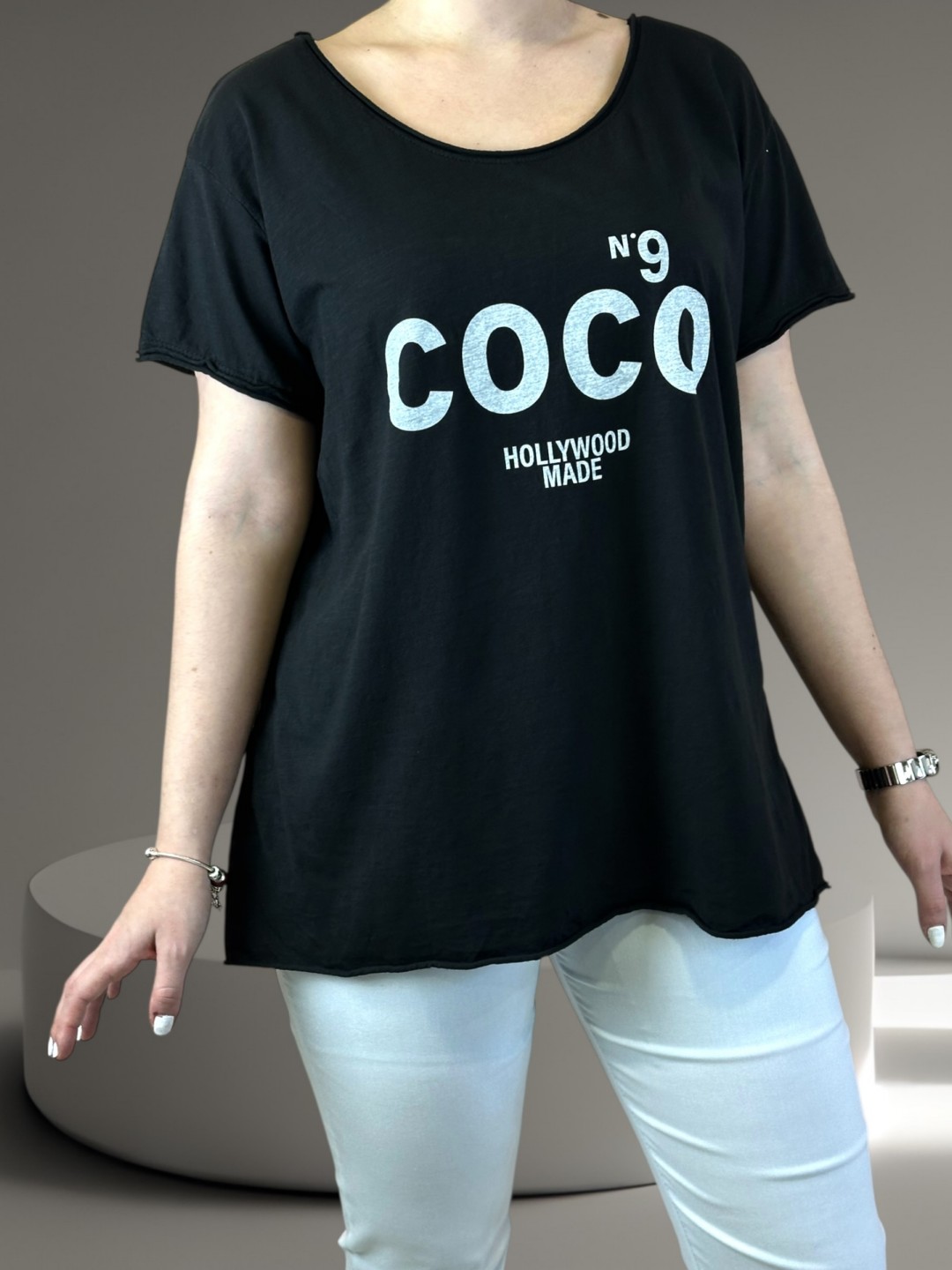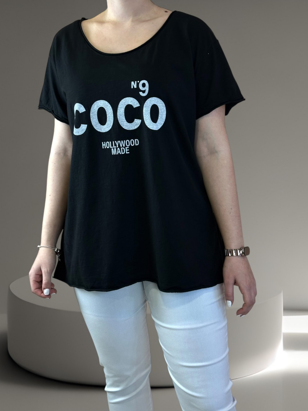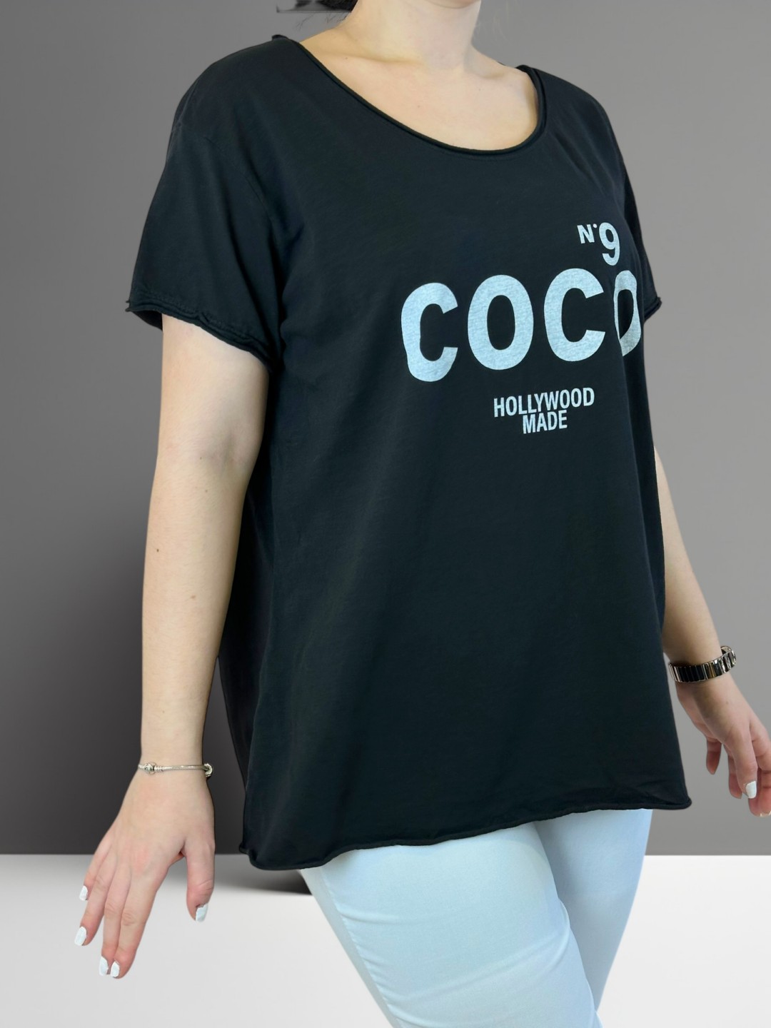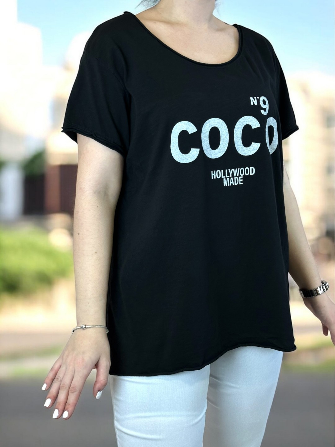 Απογείωσε τη γυναικεία σου εμφάνιση με την Chic μπλούζα με COCO print! Ελαφριά και απαλή, κατασκευασμένη από 100% βαμβάκι, ιδανική για κάθε look. Διαθέσιμη σε plus size, για τέλεια εφαρμογή!