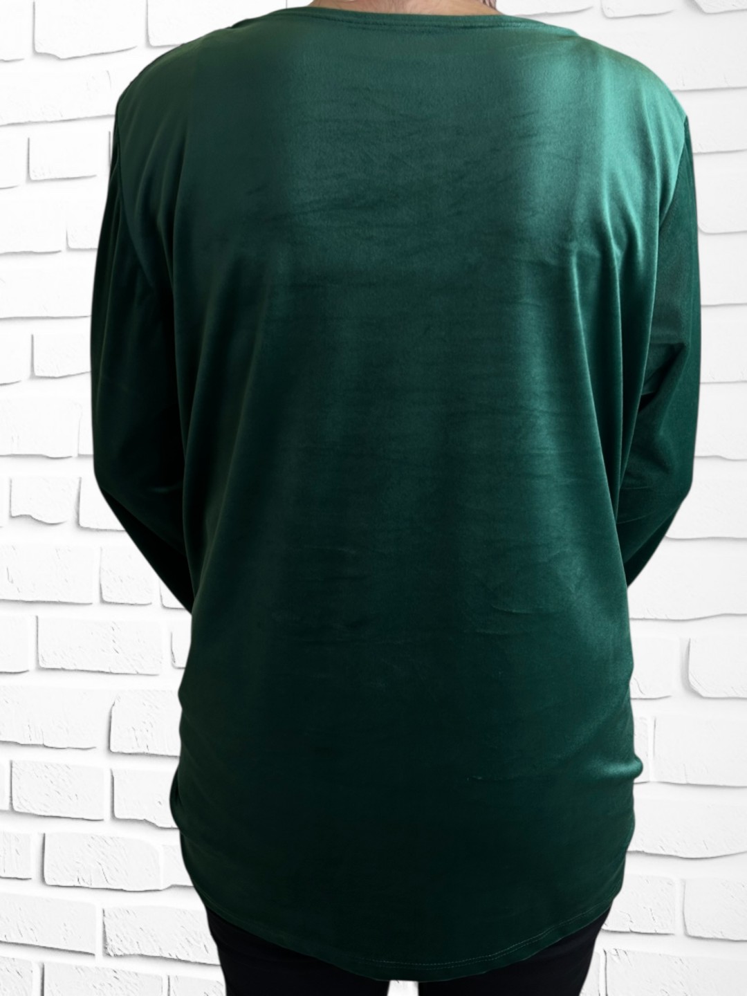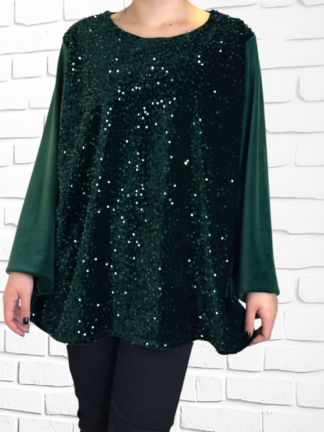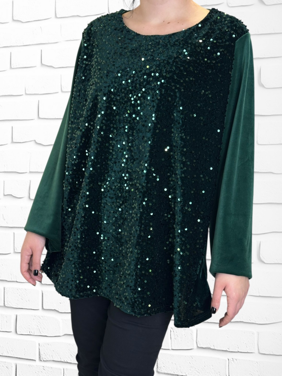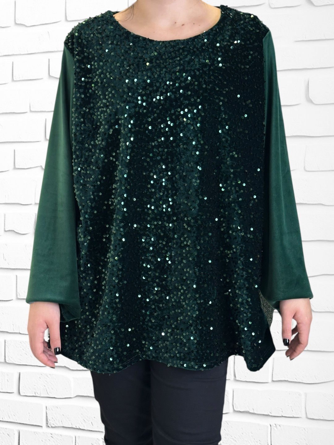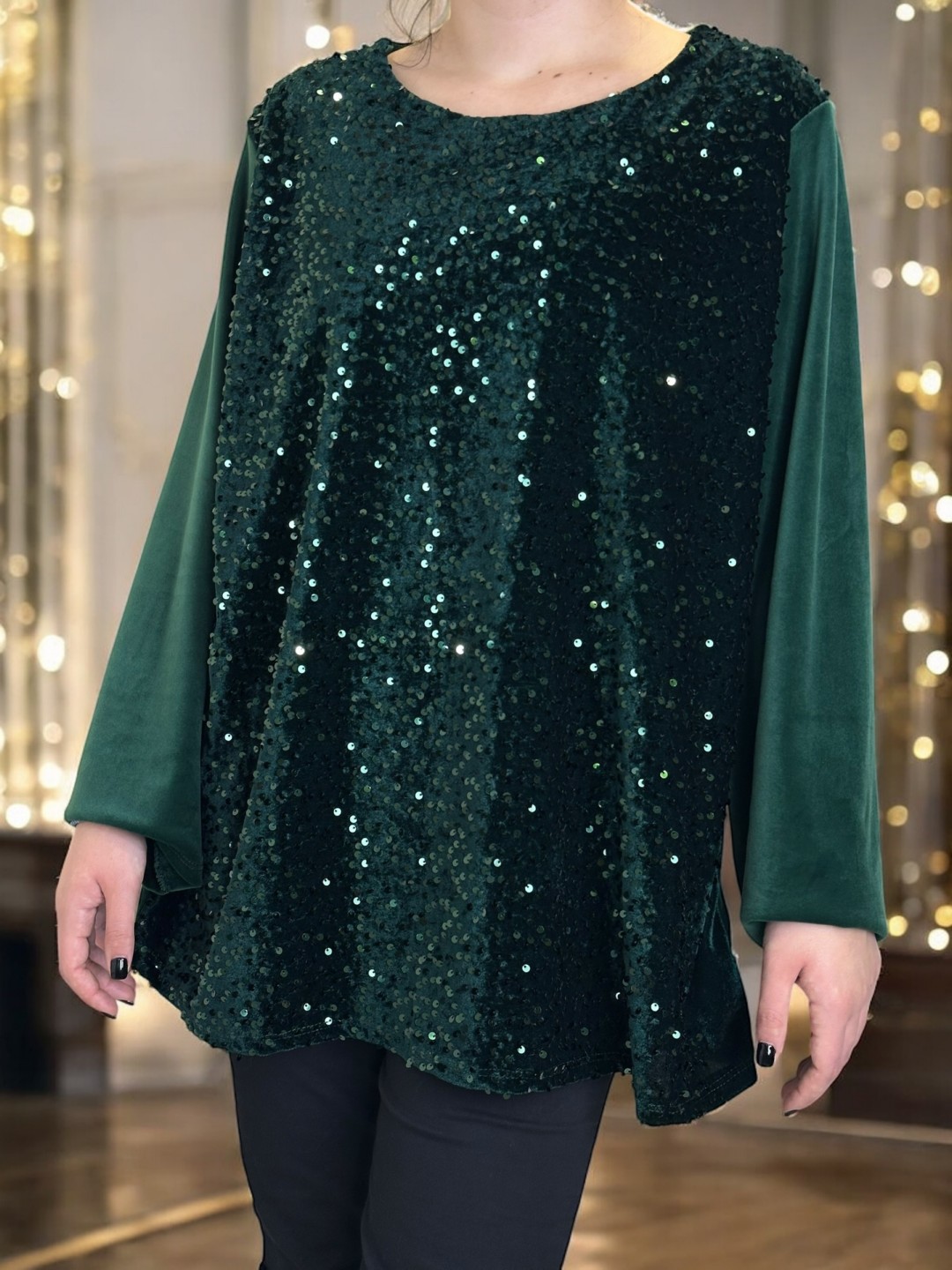 Αναδείξτε την υπέροχη πλευρά σας με αυτή την μοναδική μπλούζα plus size. Διαθέτει μπροστινή παγιέτα για λίγη λάμψη, ενώ η σύνθεσή της από 50% viscoza και 50% poliester προσφέρει άνεση και εφαρμογή που ταιριάζει σε όλες, με την ευελιξία του μεγεθών “One size.