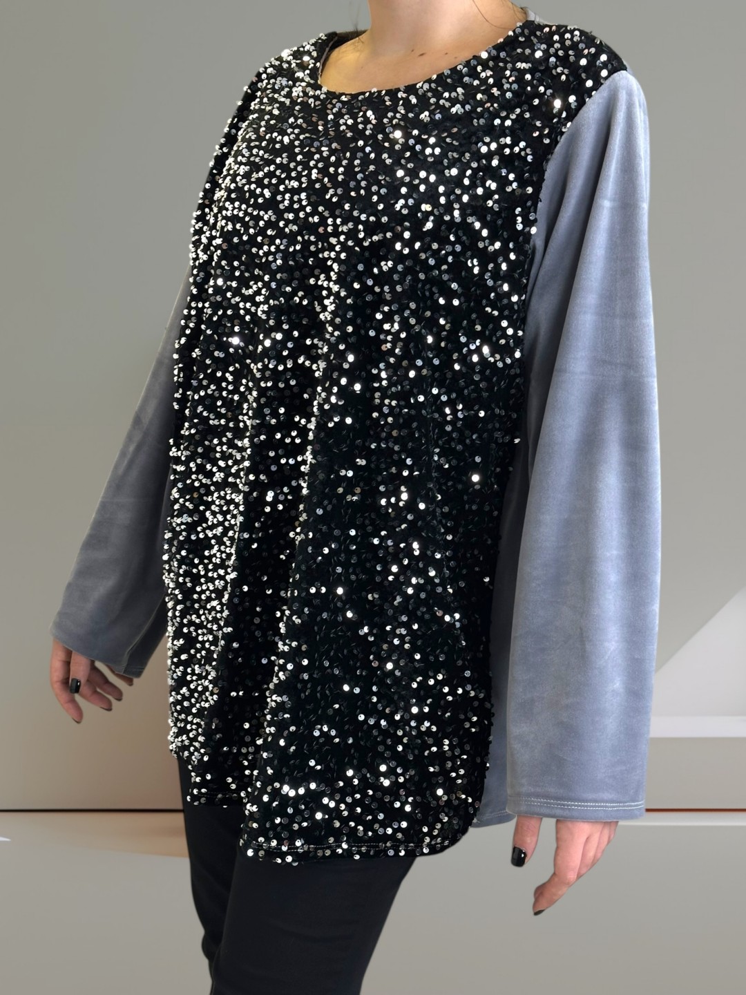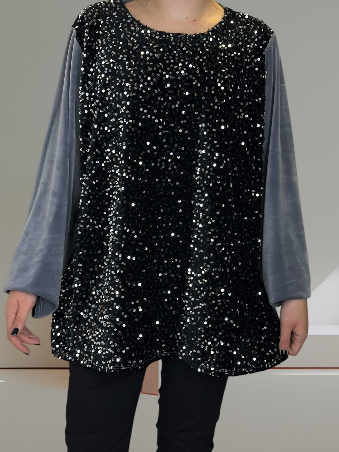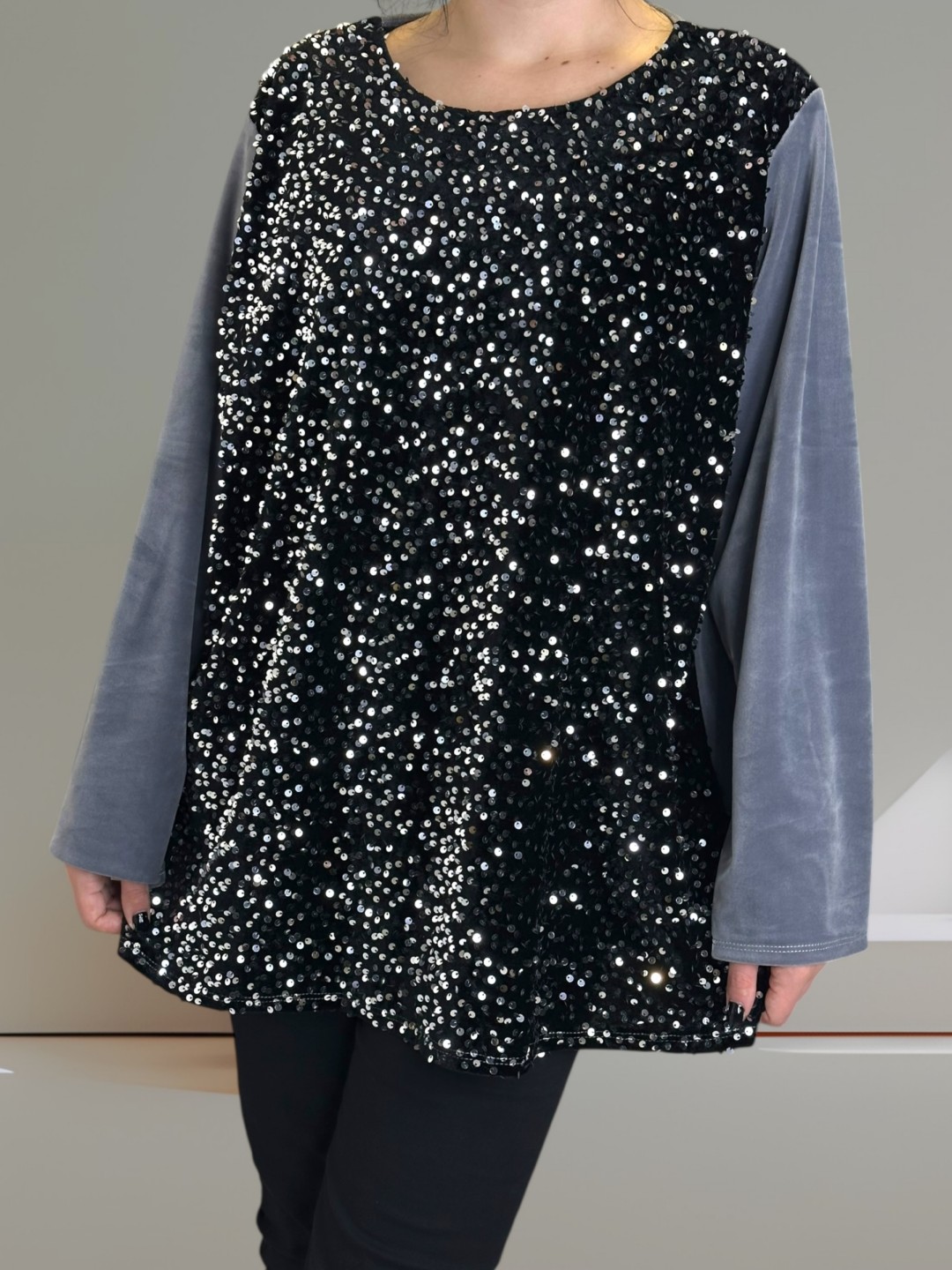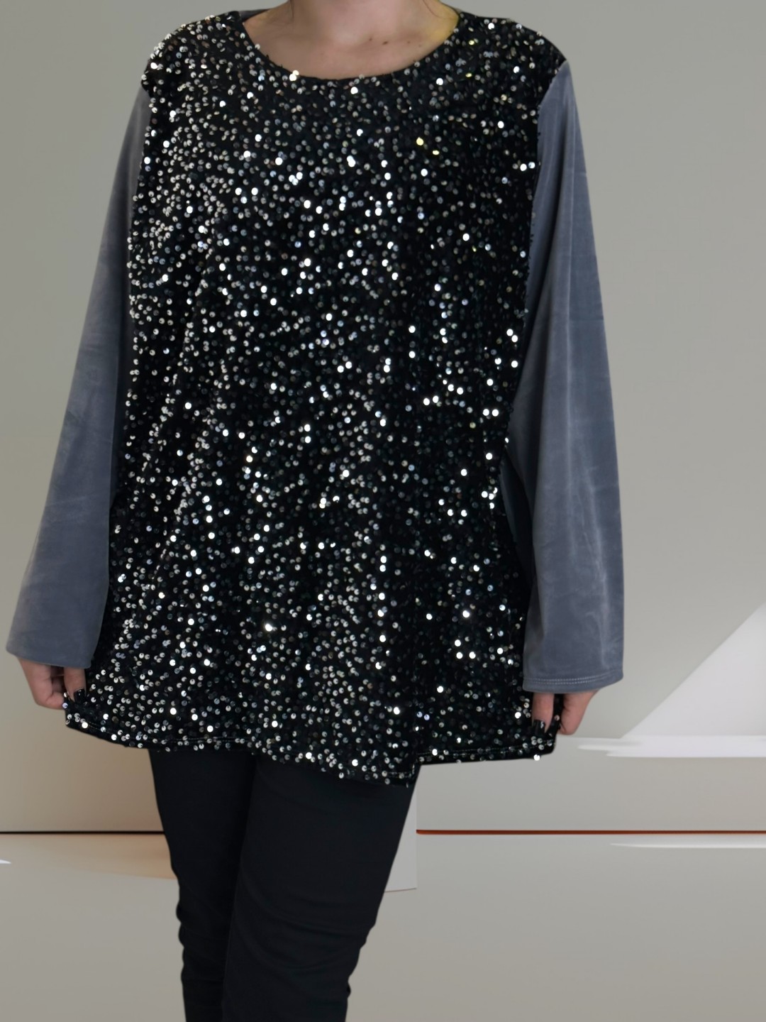 Αυτή η εκθαμβωτική μπλούζα plus size με λαμπερή μπροστινή παγιέτα συνδυάζει άνεση και κομψότητα. Από 50% viscoza και 50% πολυεστέρα, προσφέρει μια ιδιαίτερη εφαρμογή που θα αγκαλιάζει κάθε σχήμα σώματος. One size μέγεθος που ταιριάζει σε όλους.