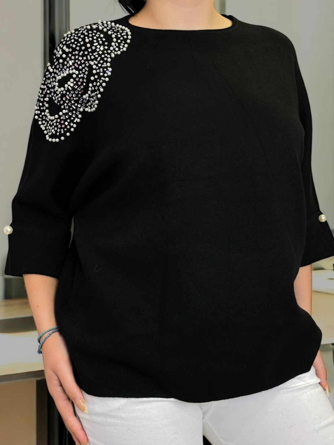 Αποκτήστε αυτήν την πανέμορφη plus size μπλούζα με λαμπερή λεπτομέρεια από στρας στον ώμο, προσθέτοντας μια glam πινελιά στη γκαρνταρόμπα σας. Ιδανική για όλες τις περιστάσεις, είναι σχεδιασμένη με άνετη φαρδιά γραμμή που ταιριάζει σε όλους. Διαθέσιμη στο μέγεθος One size.