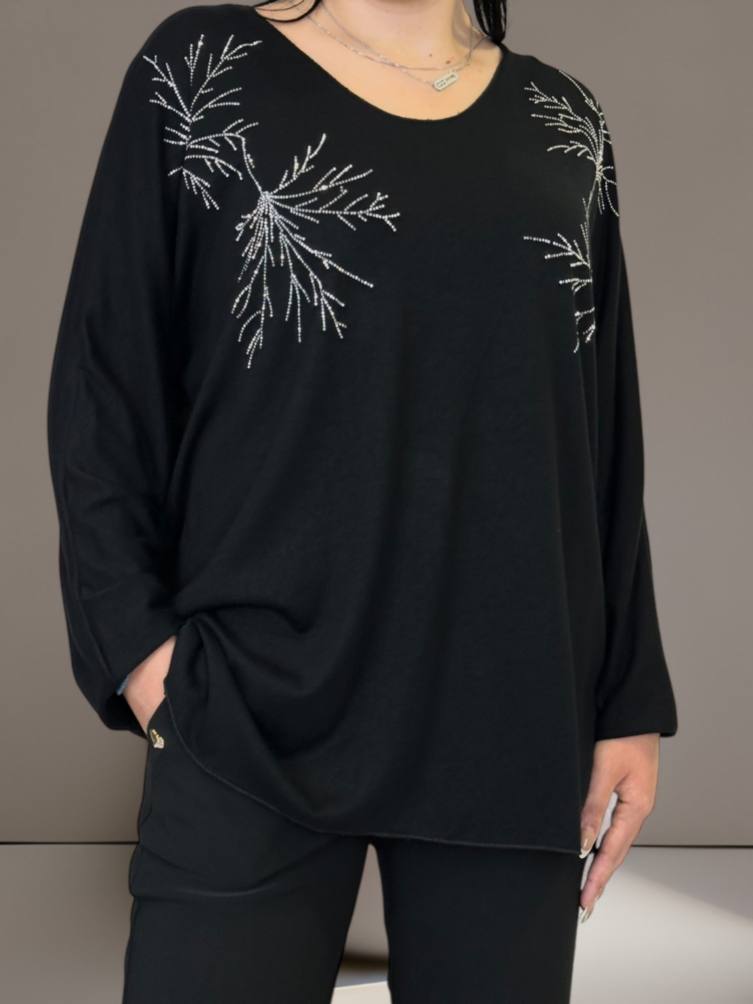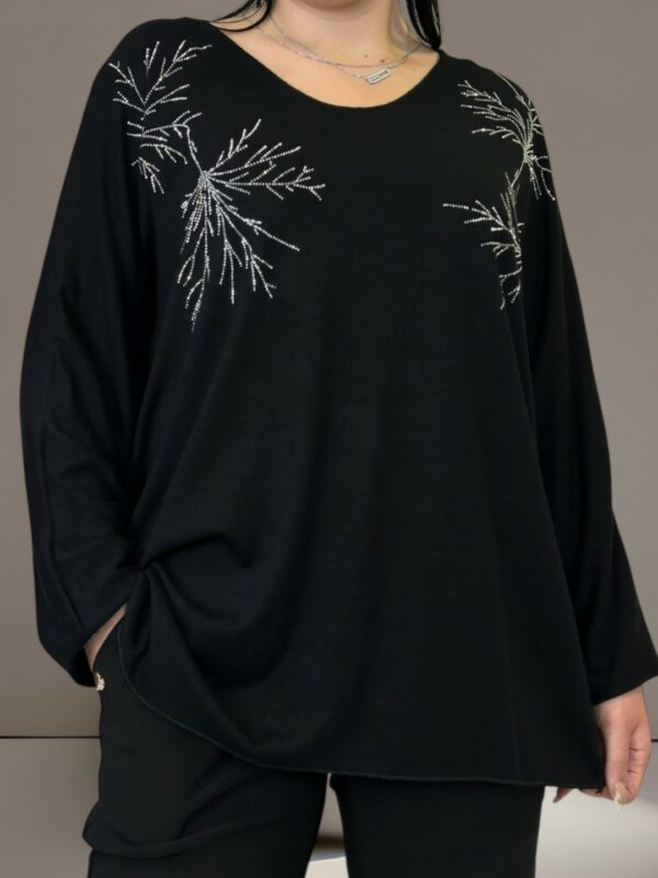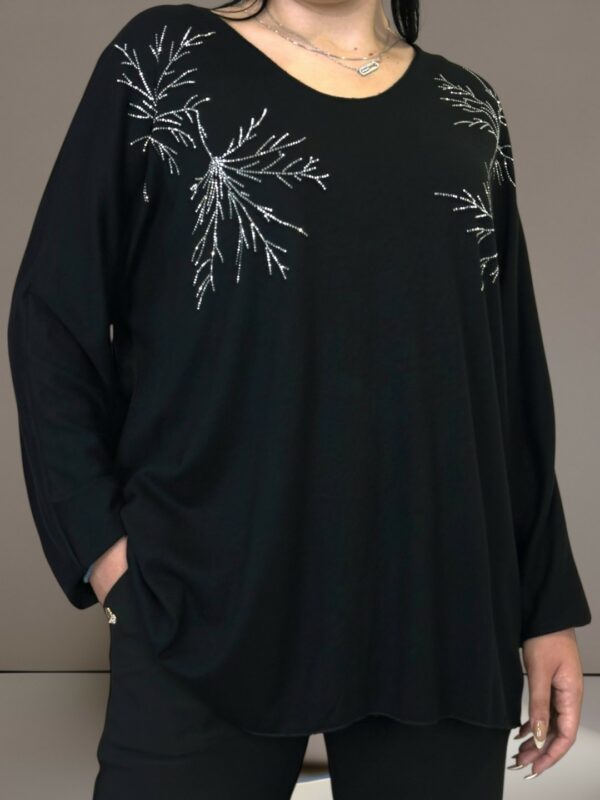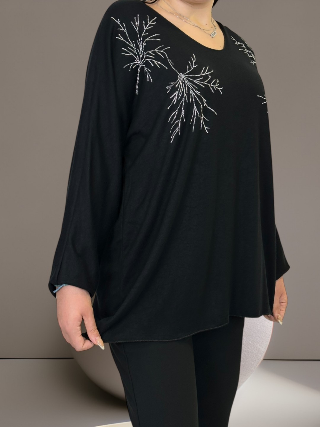 Αναδείξτε την κομψότητα σας με τη μπλούζα με λαμπερούς ώμους plus size. Κατασκευασμένη από 50% ακρυλικό, 25% βισκόζη, 20% πολυεστέρα και 5% ελαστάν, έχει τέλεια εφαρμογή και σας προσφέρει άνεση όλη την ημέρα. Το One size καλύπτει όλα τα μεγέθη.