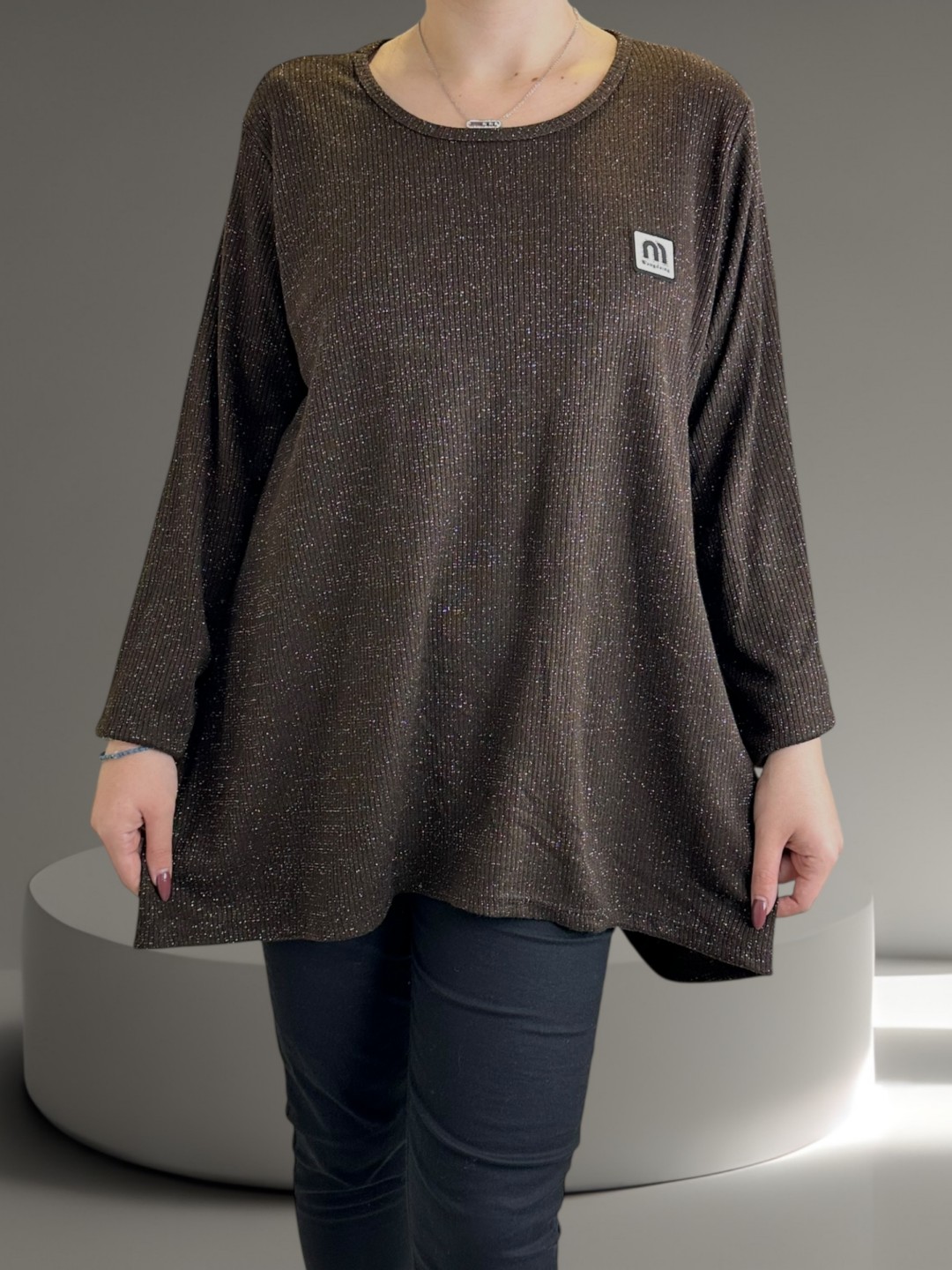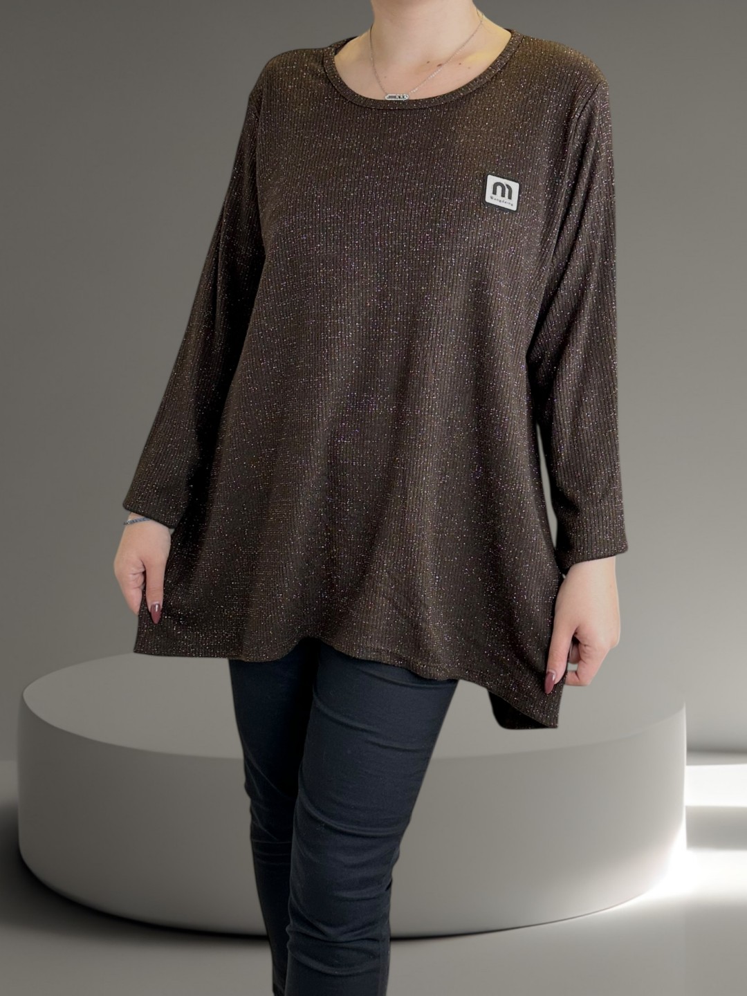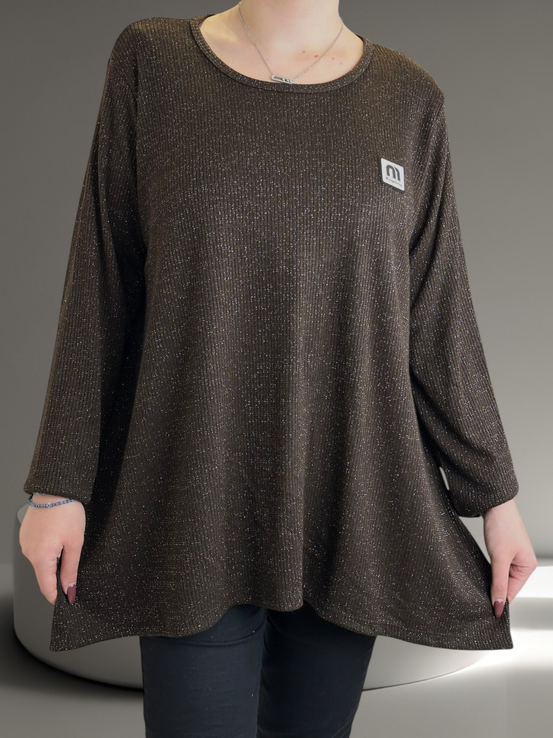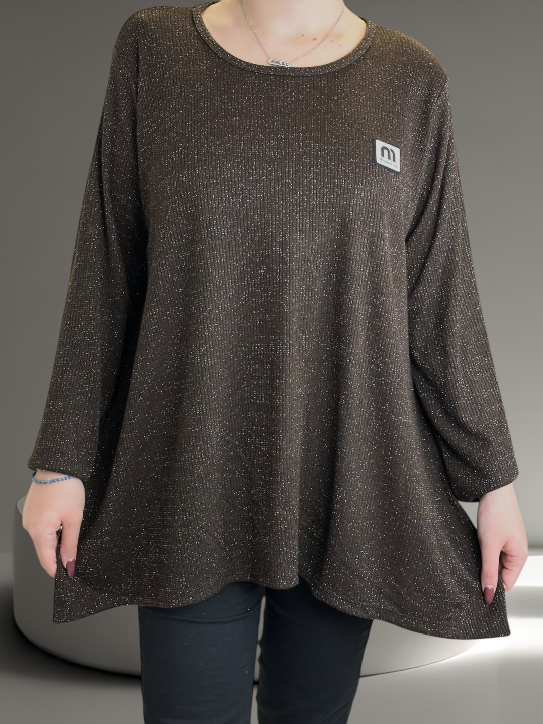 Αναδείξτε τη γοητεία σας με αυτή τη λαμπερή μπλούζα με ασημί κλωστή! Είναι σχεδιασμένη σε plus size μεγέθη και διαθέτει ελκυστικό σχέδιο μύτες. Αποτελείται από 95% βισκόζη και 5% ελαστάν, προσφέροντας άνεση και εφαρμογή. Διατίθεται σε One Size.