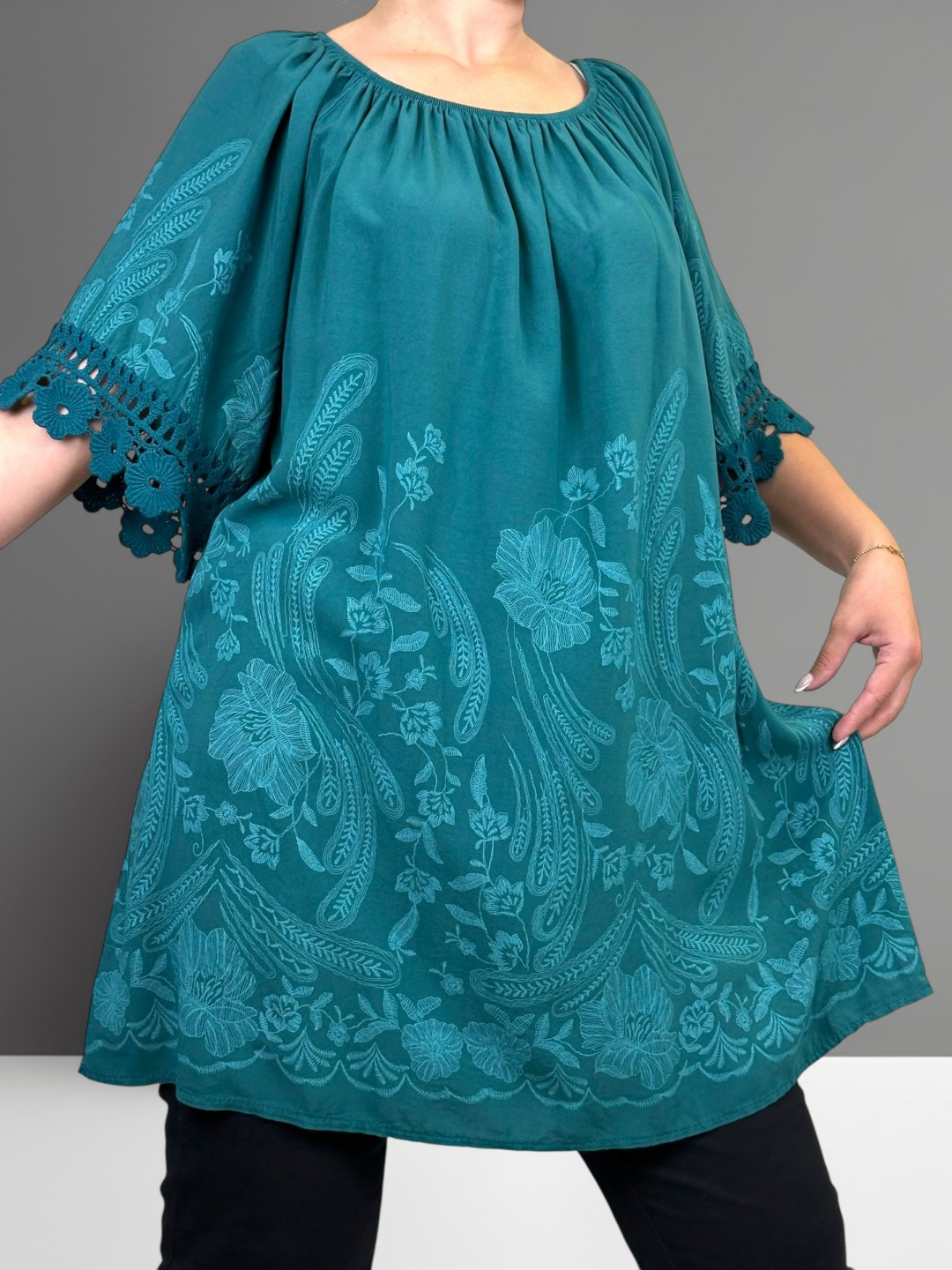 Αποκτήστε αυτή τη στιλάτη μπλούζα plus size με λάστιχο στους ώμους, ιδανική για άνετη καθημερινή εμφάνιση! Είναι φτιαγμένη από 100% viscoze για μέγιστη άνεση και φρεσκάδα. Είναι διαθέσιμη σε μέγεθος One size, εξασφαλίζοντας τέλεια εφαρμογή για όλες τις σιλουέτες.