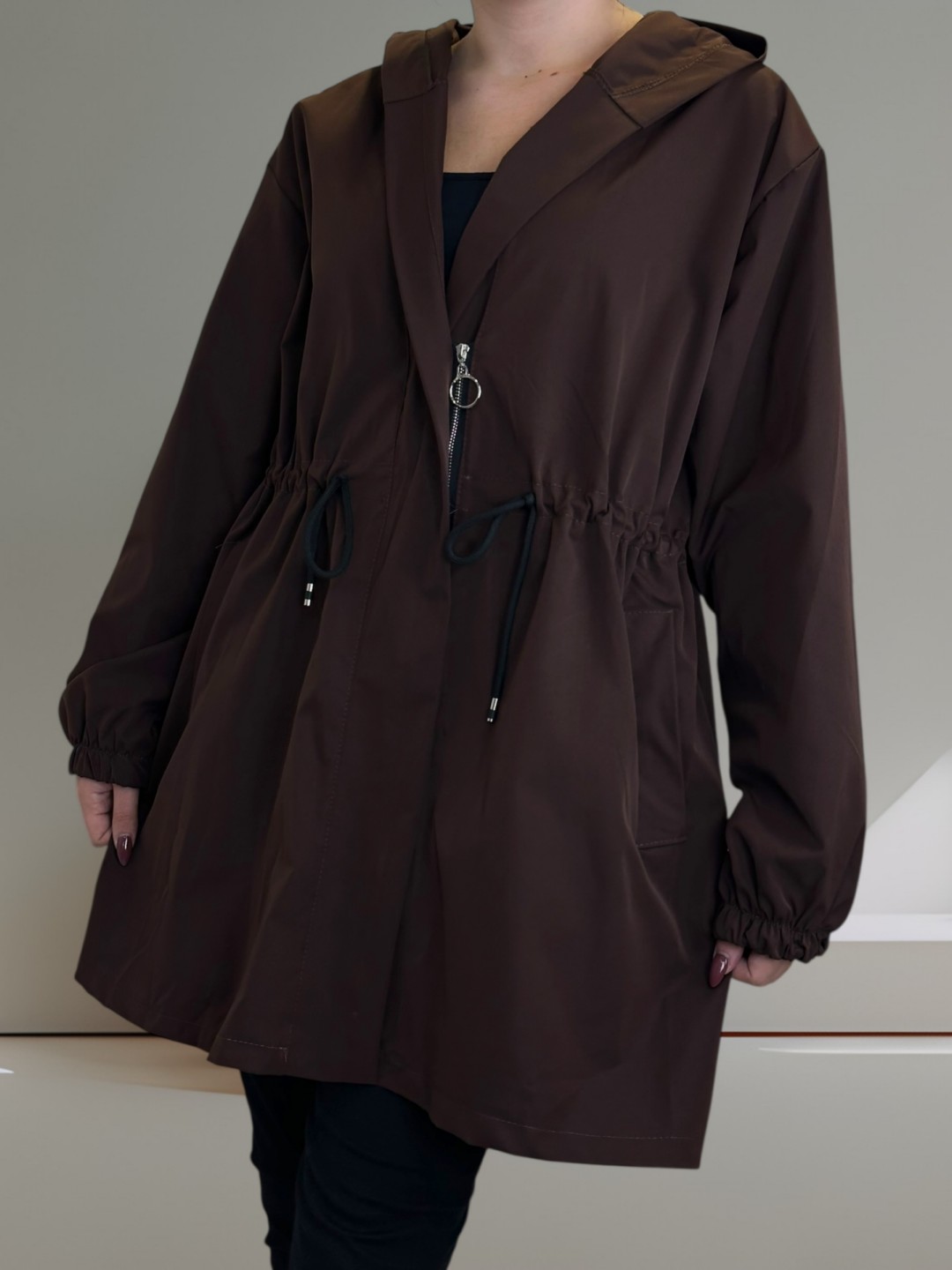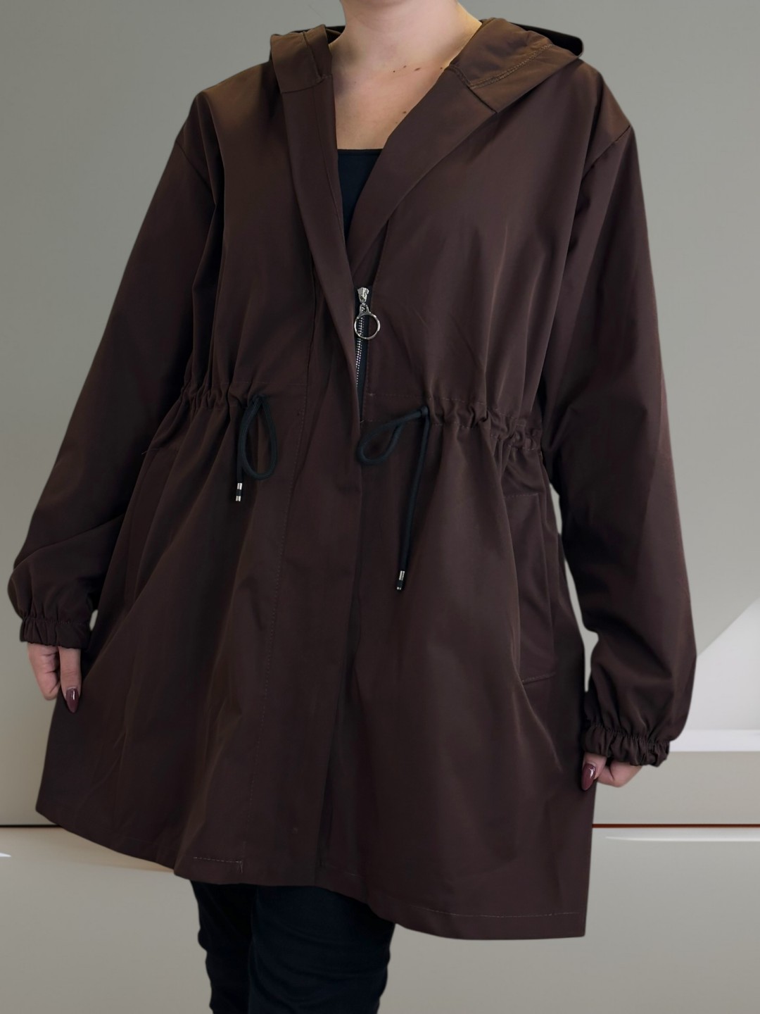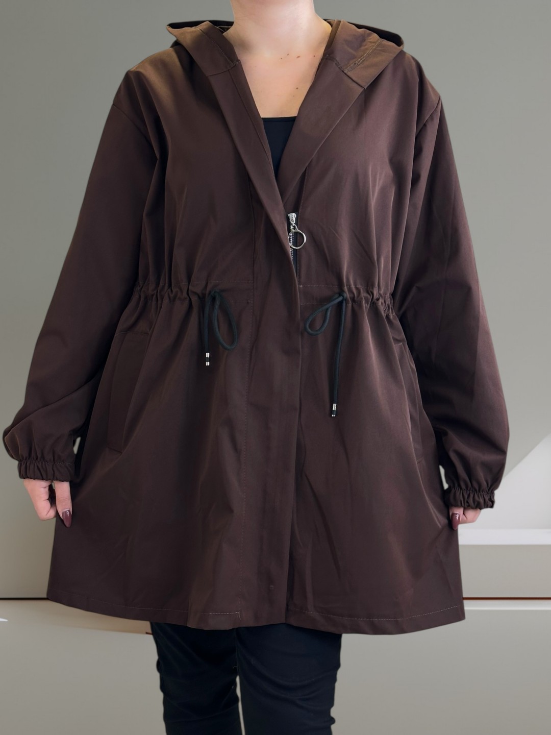 Ευέλικτη καπαρντίνα plus size, ιδανική για όλη τη μέρα. Με κουκούλα για προστασία από την βροχή και σύνθεση από poliester, viscoze και cottone για άνεση. Διαθέσιμη σε One size.
