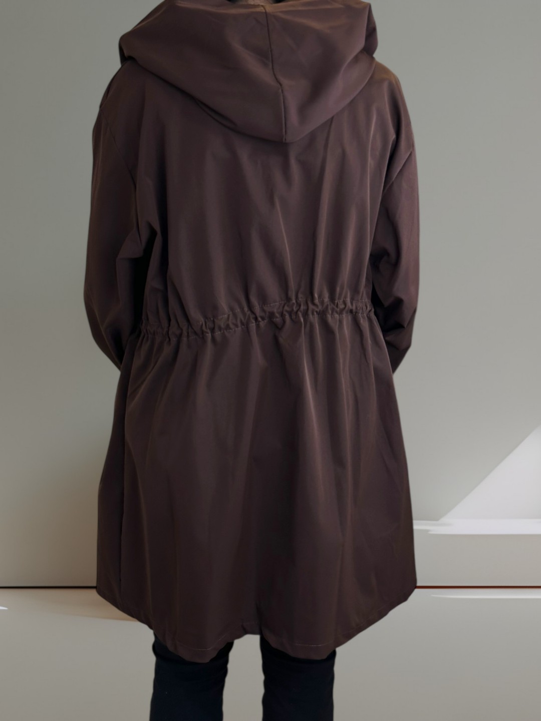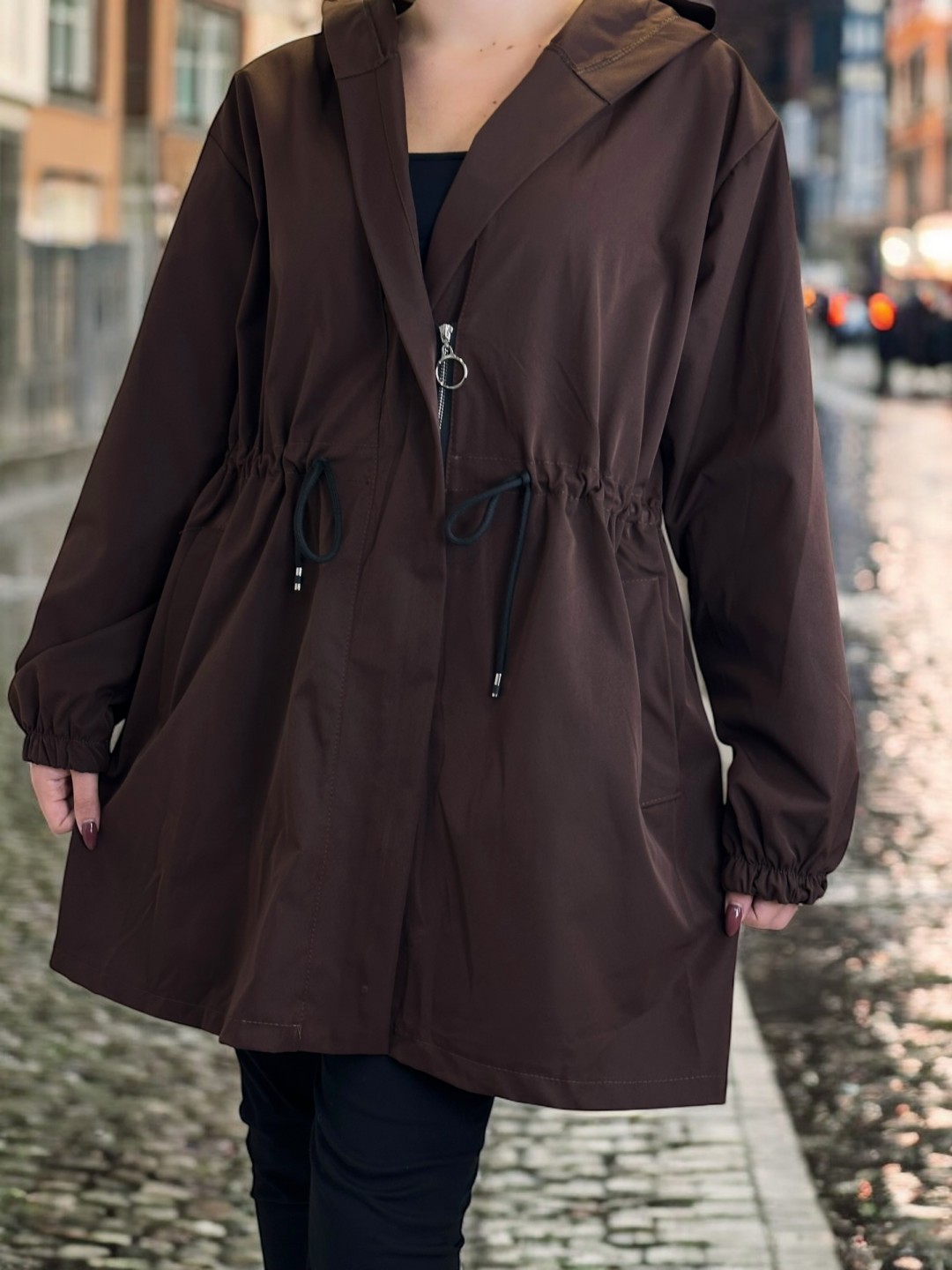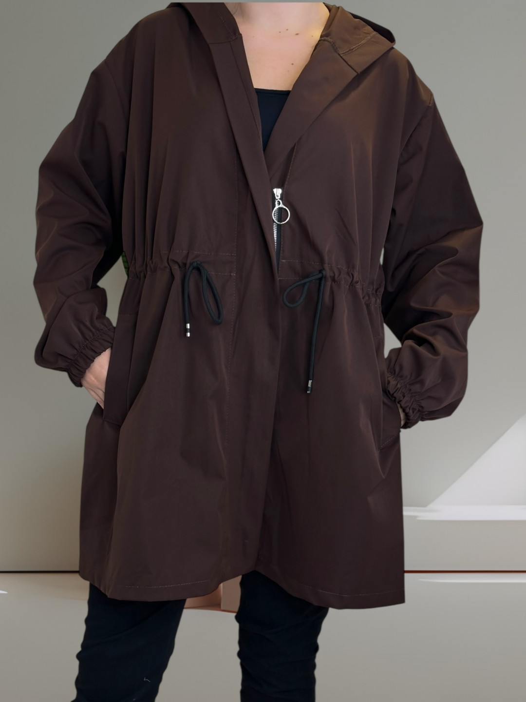 Ευέλικτη καπαρντίνα plus size, ιδανική για όλη τη μέρα. Με κουκούλα για προστασία από την βροχή και σύνθεση από poliester, viscoze και cottone για άνεση. Διαθέσιμη σε One size.