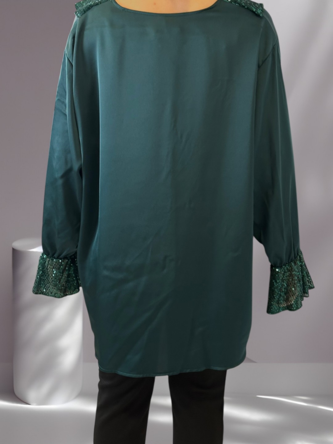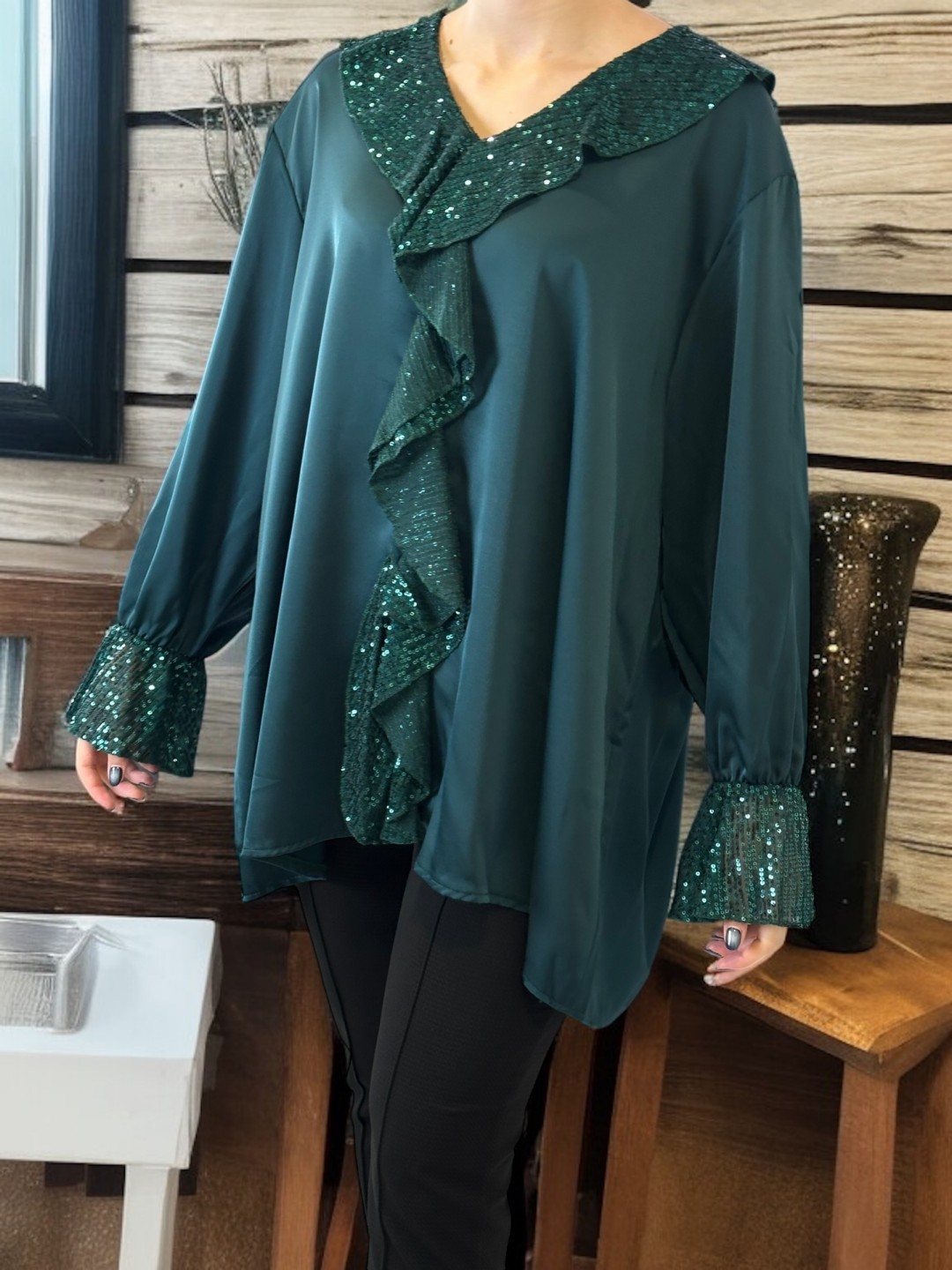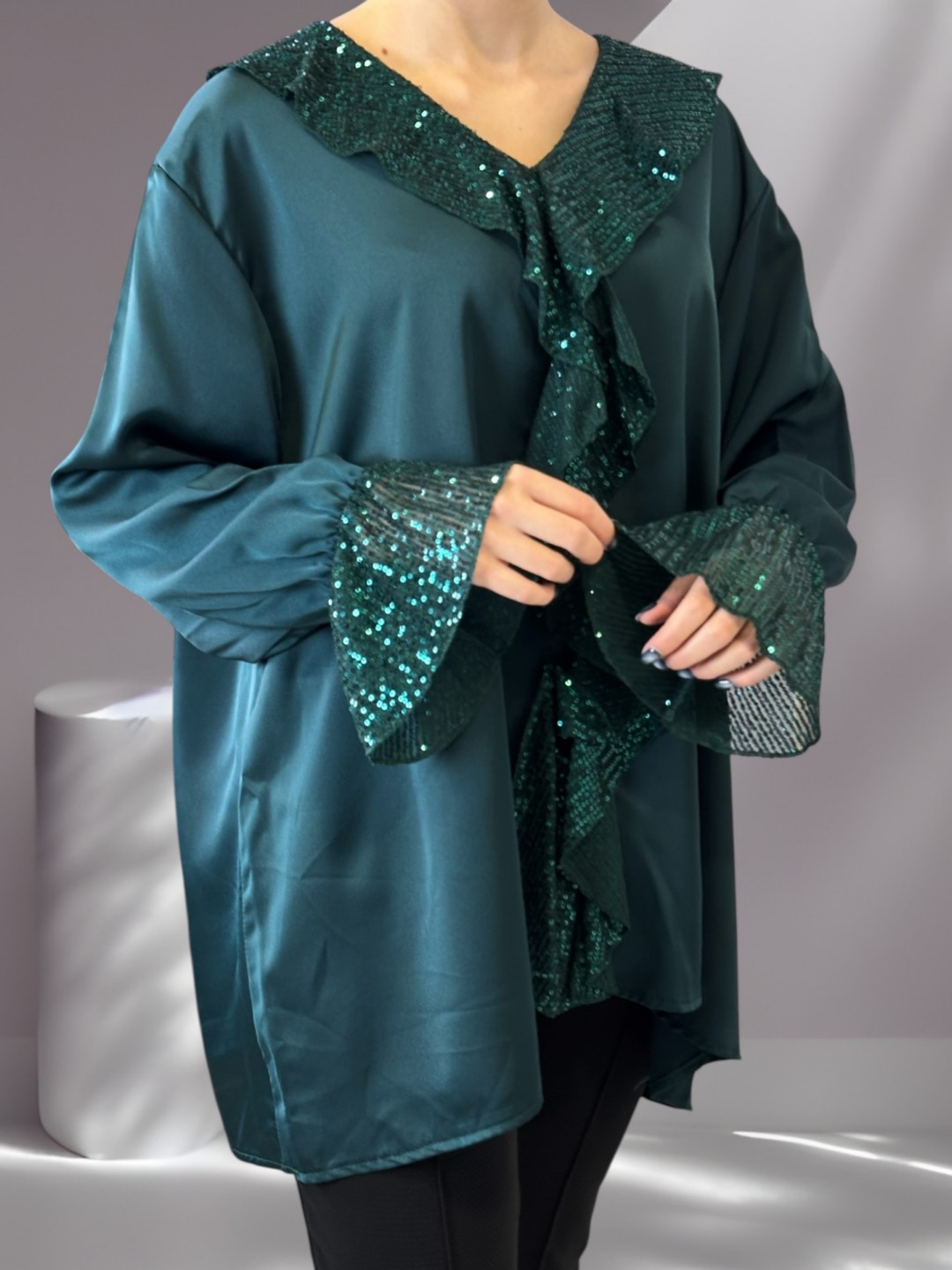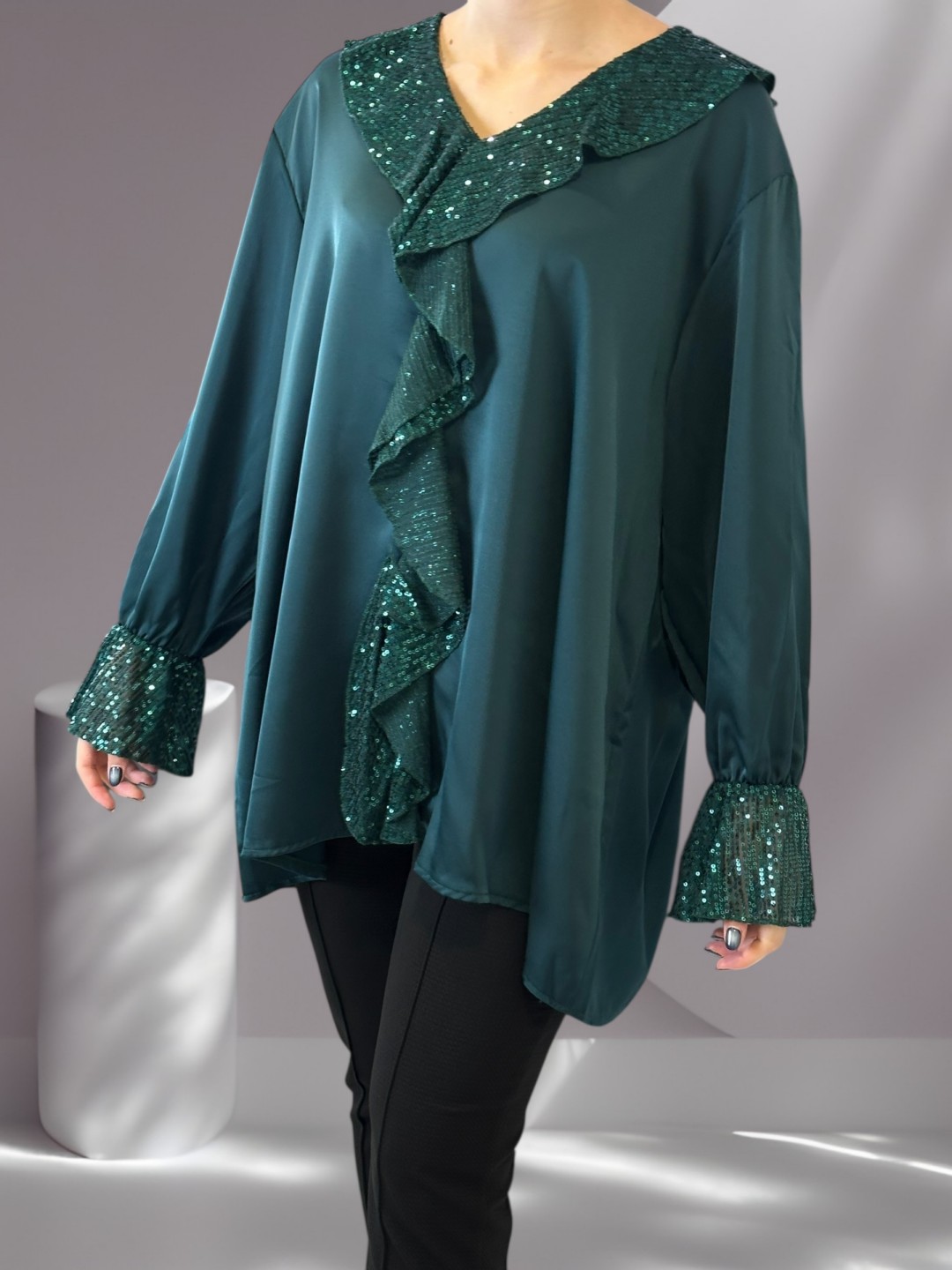 Chic Σατέν Μπλούζα με Βολάν Διακοσμημένο με Παγιέτες