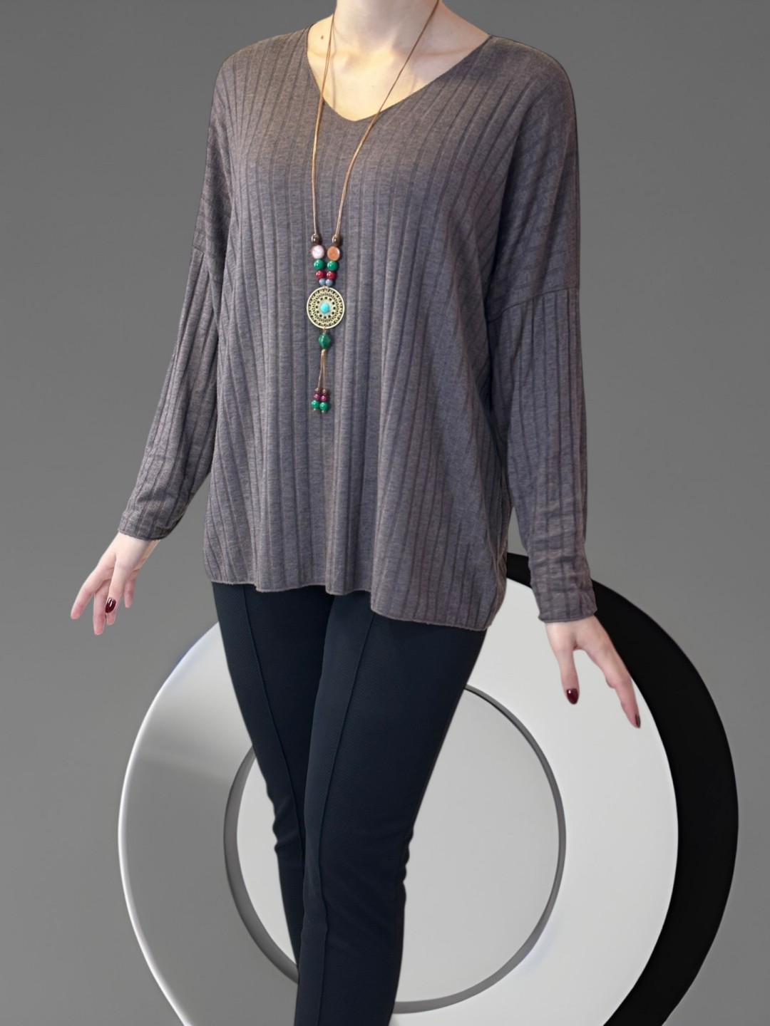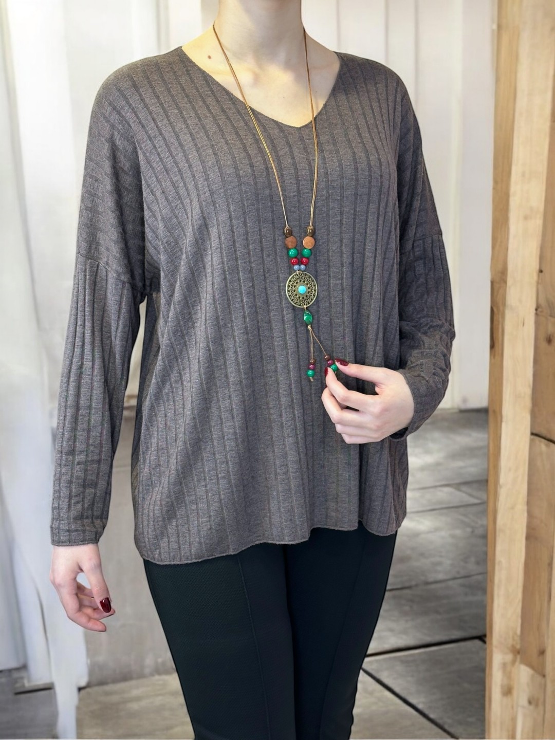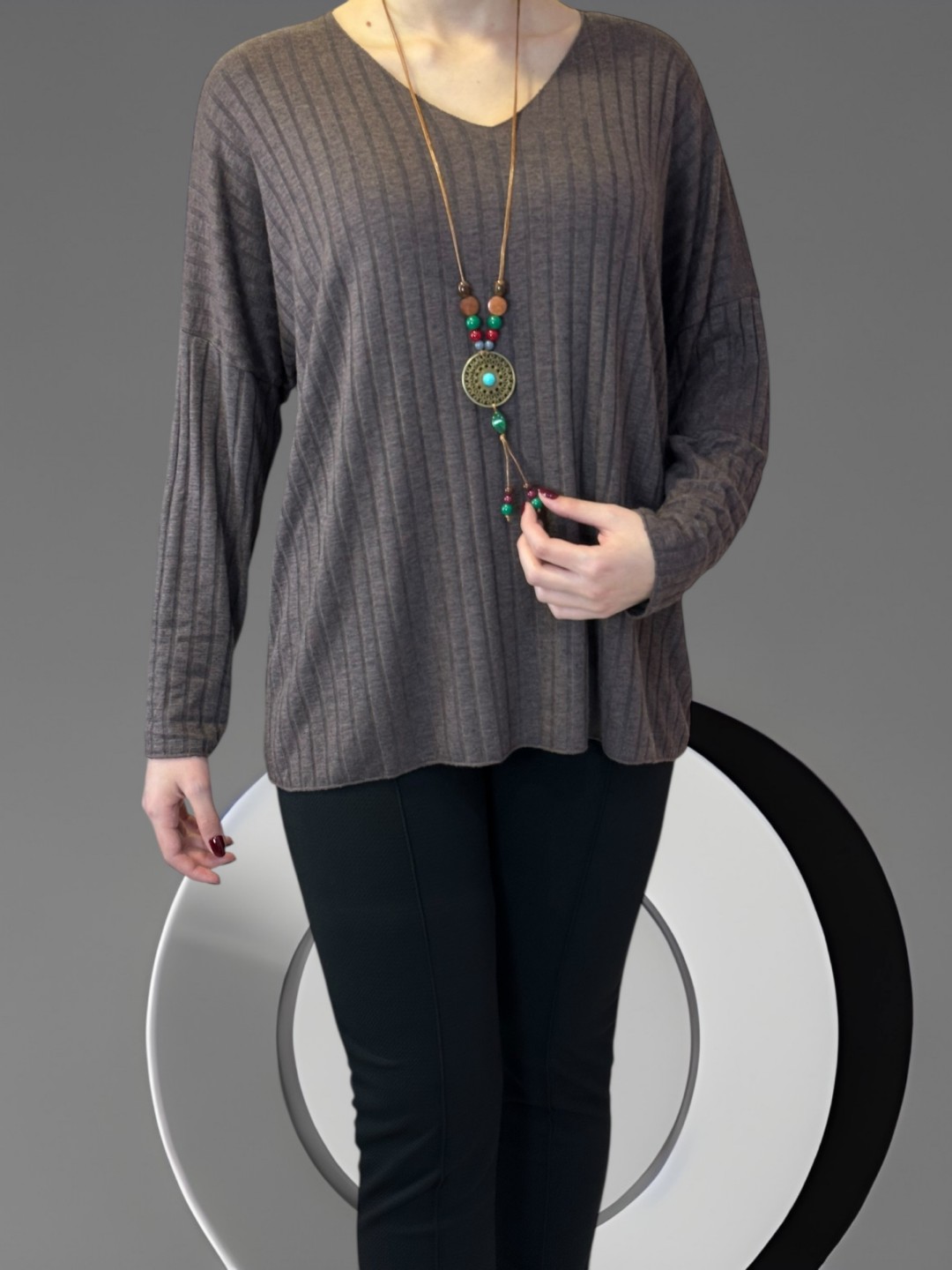 Ελαστική Ριμπ Μπλούζα με Διακοσμητικό Κολιέ