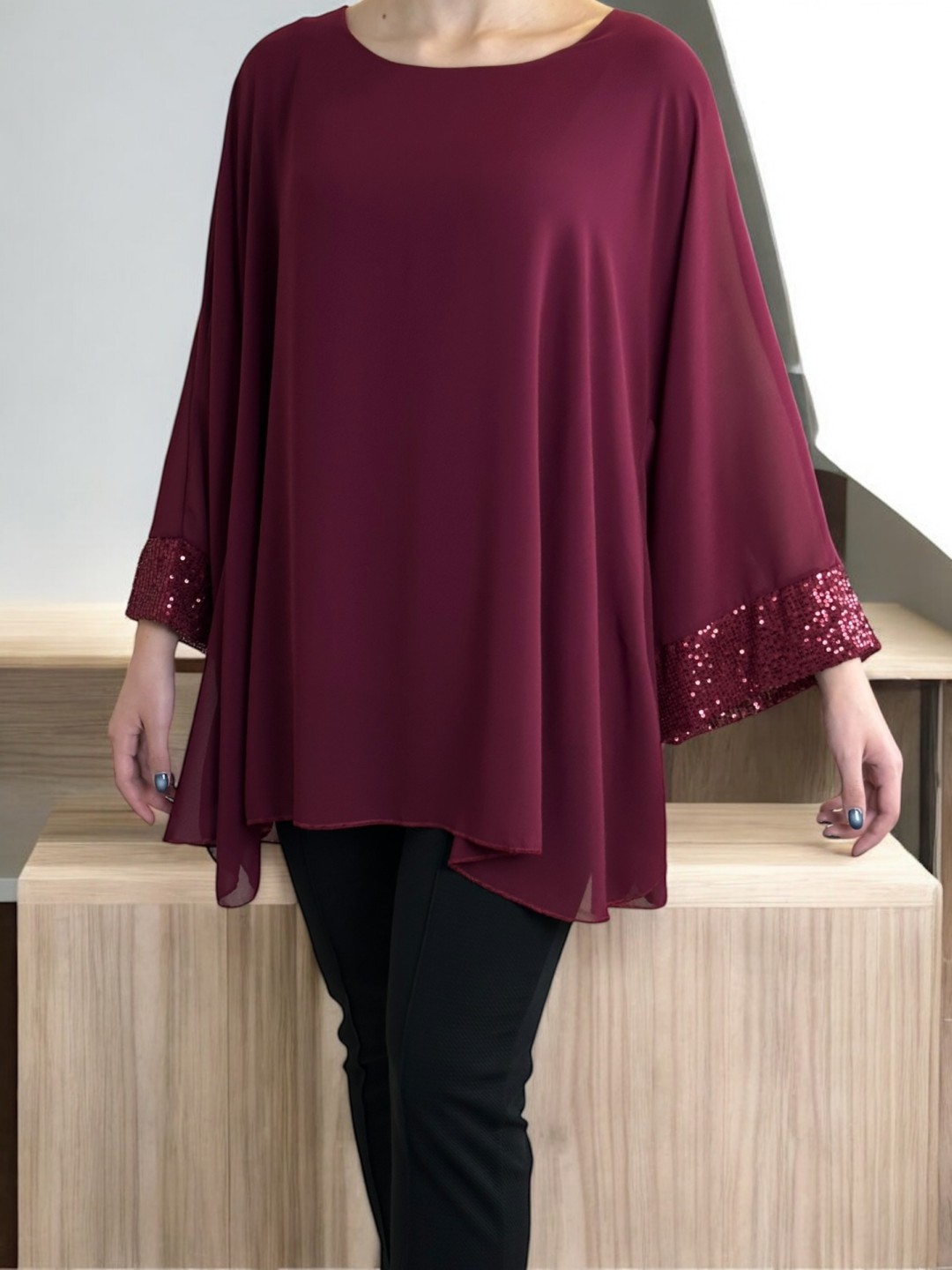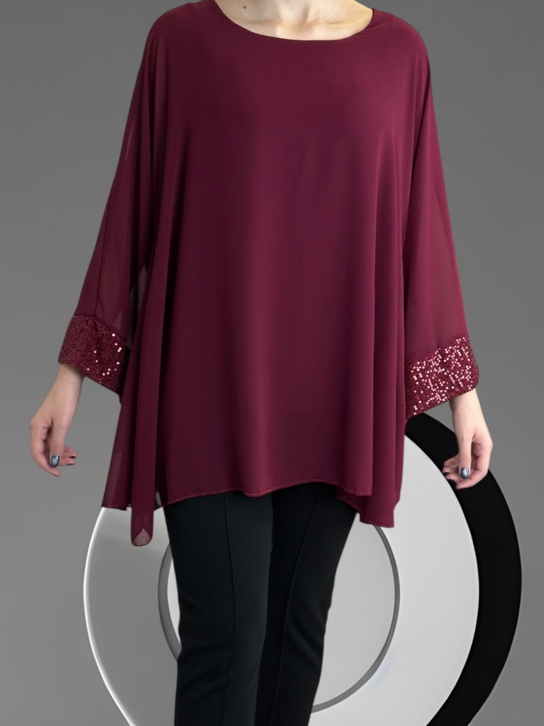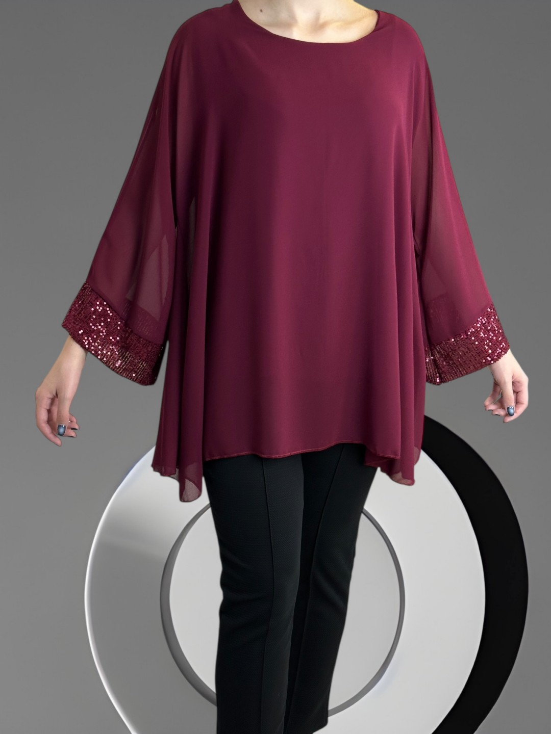 Κάντε δική σας την Elegant Μπλούζα από Μουσελίνα με Λαμπερές Παγιέτες, σε plus size. Φτιαγμένη από πολυεστέρα και βισκόζη σε ίσα ποσοστά, σκοπεύει να κάνει την εμφάνισή σας ακόμα πιο λαμπερή! Διατίθεται σε one size.