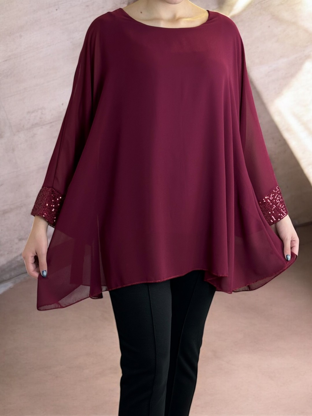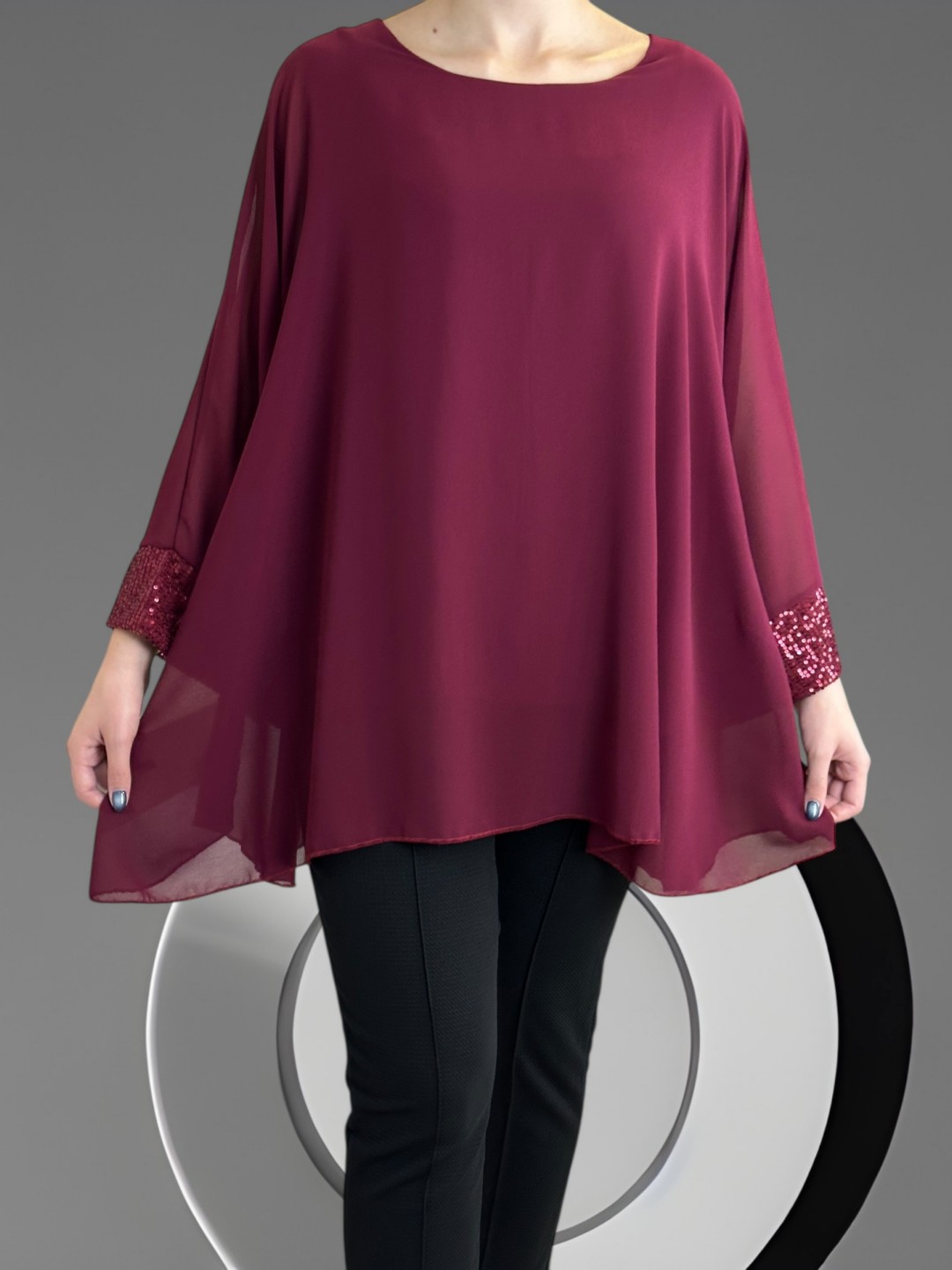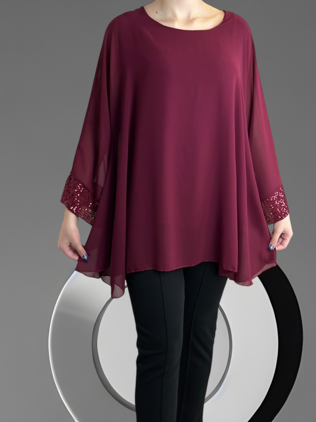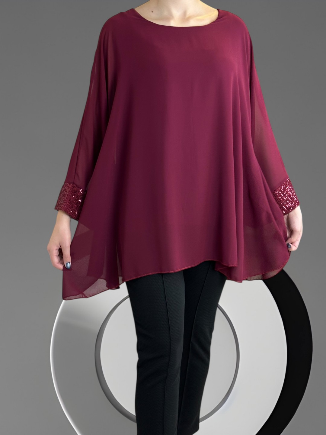 Κάντε δική σας την Elegant Μπλούζα από Μουσελίνα με Λαμπερές Παγιέτες, σε plus size. Φτιαγμένη από πολυεστέρα και βισκόζη σε ίσα ποσοστά, σκοπεύει να κάνει την εμφάνισή σας ακόμα πιο λαμπερή! Διατίθεται σε one size.