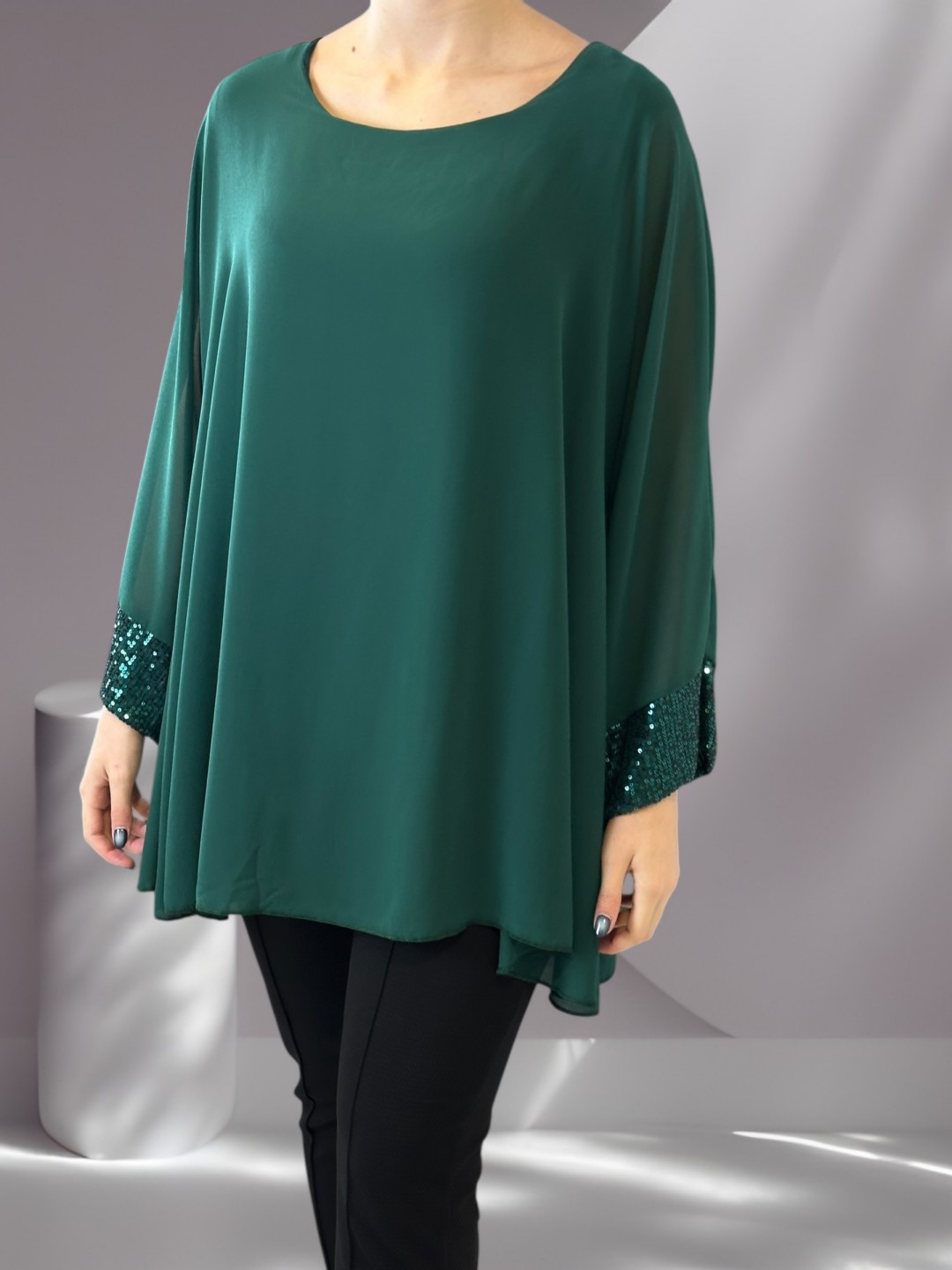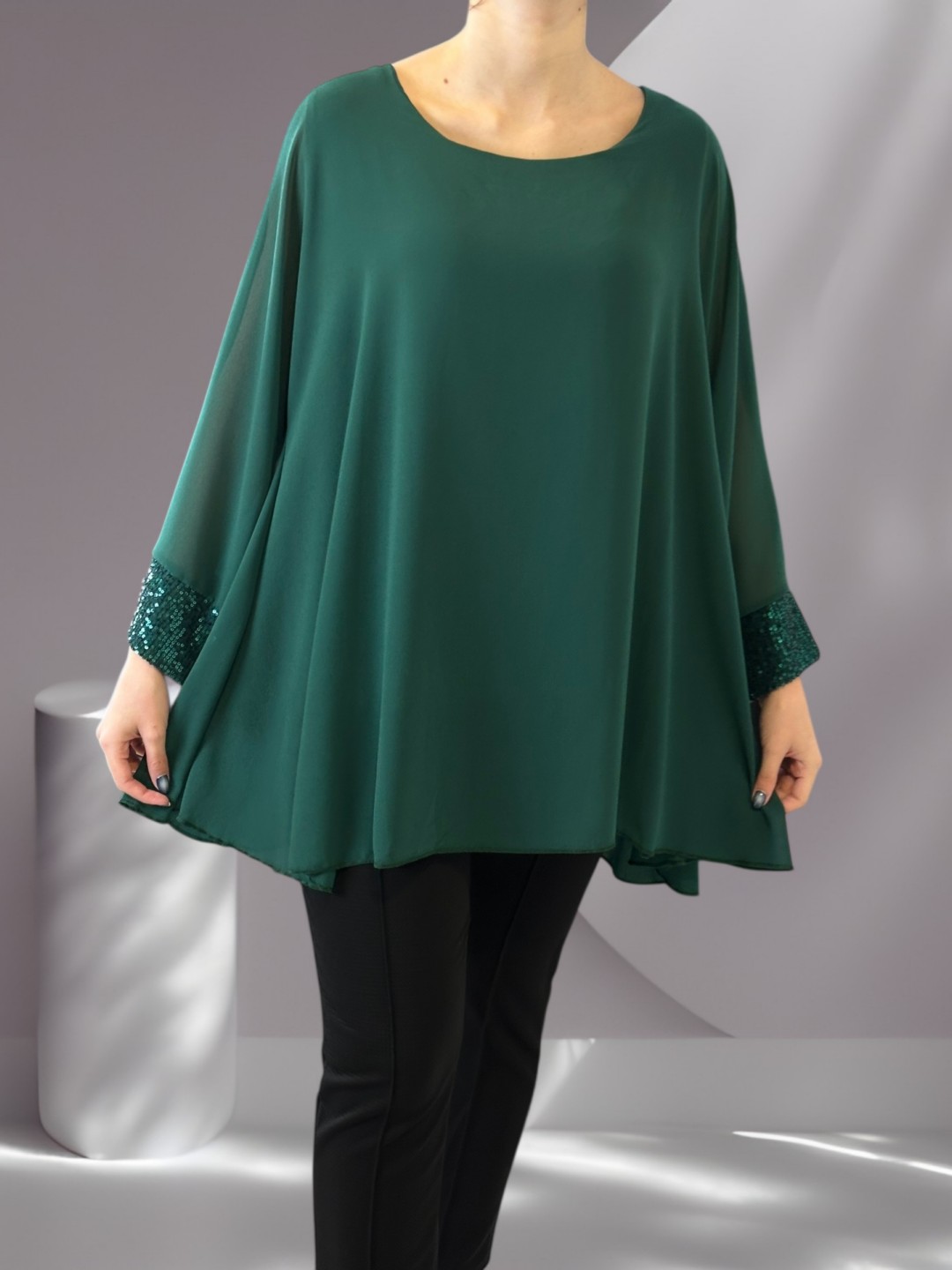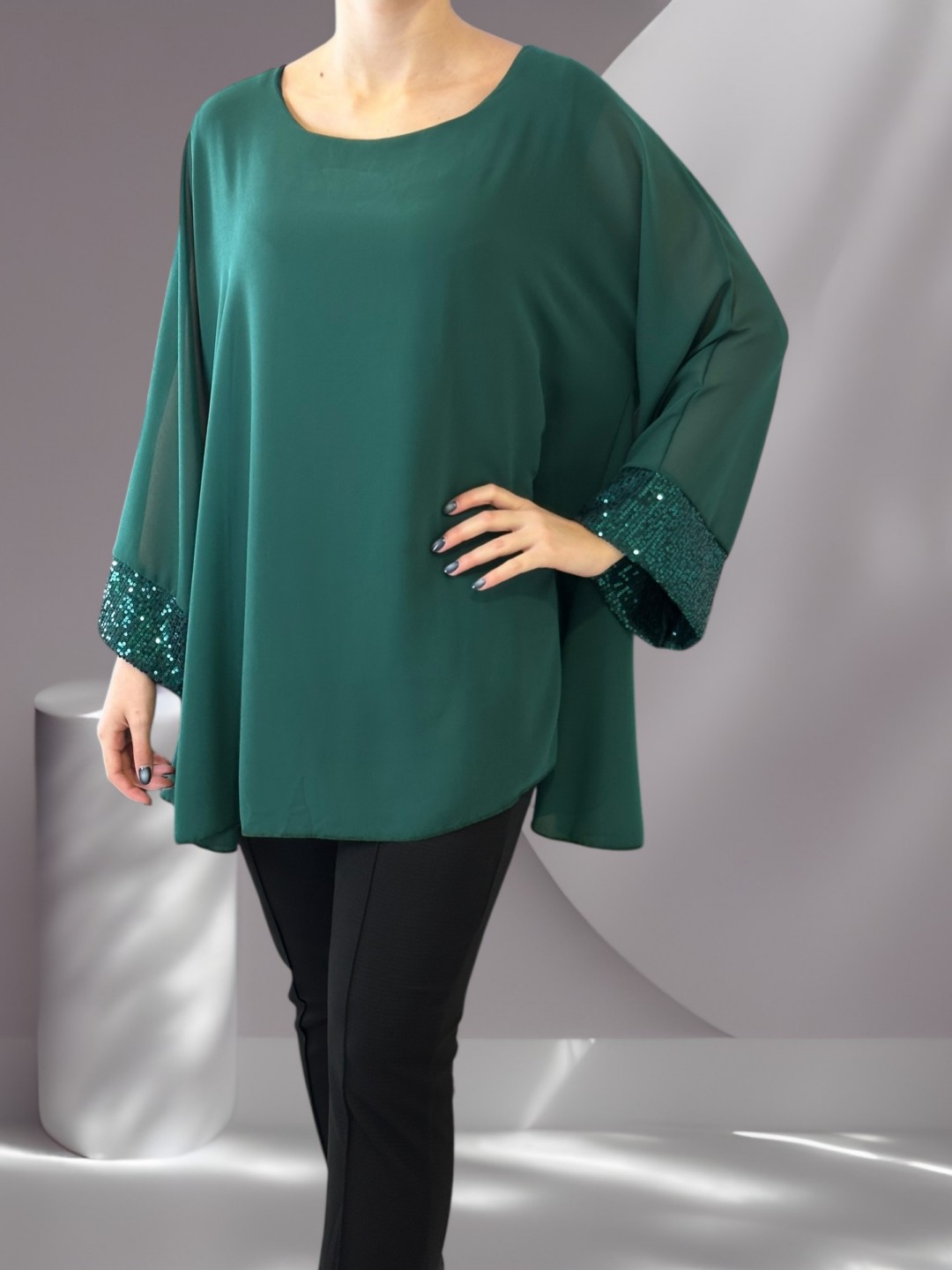 Απογείωσε την εμφάνισή σου με την elegant μπλούζα από μουσελίνα, διακοσμημένη με λαμπερές παγιέτες. Plus size, κατασκευασμένη από 50% viscoza και 50% poliester, προσφέρει απαράμιλλη άνεση και στυλ. Μεγέθη One size, εφαρμόζει τέλεια σε κάθε γυναικείο προφίλ.