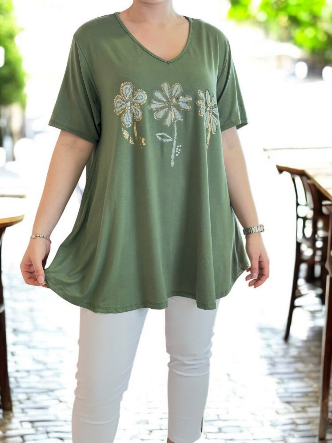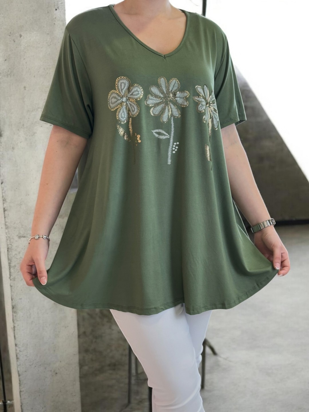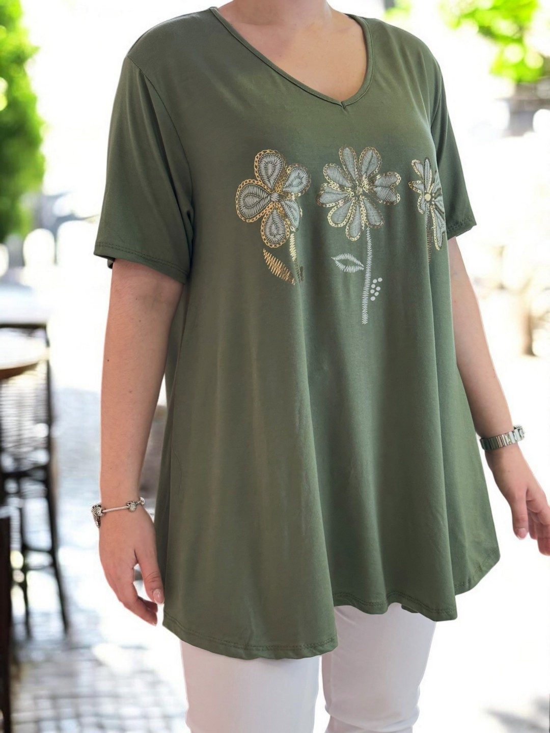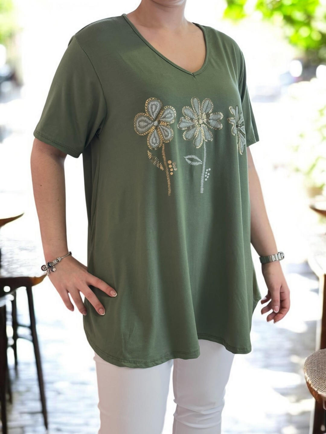 Fashion μπλούζα με V και τρισδιάστατα λουλούδια