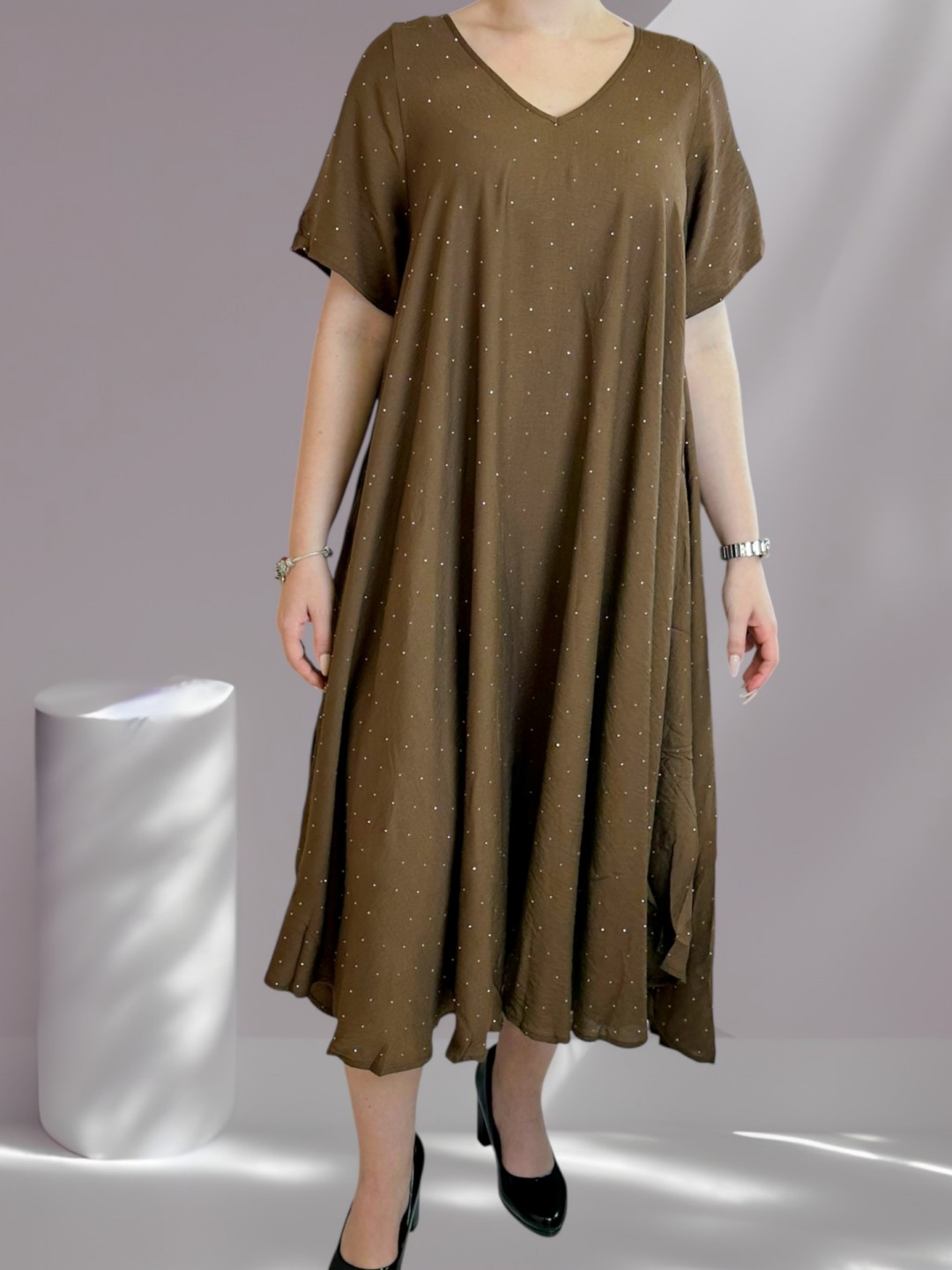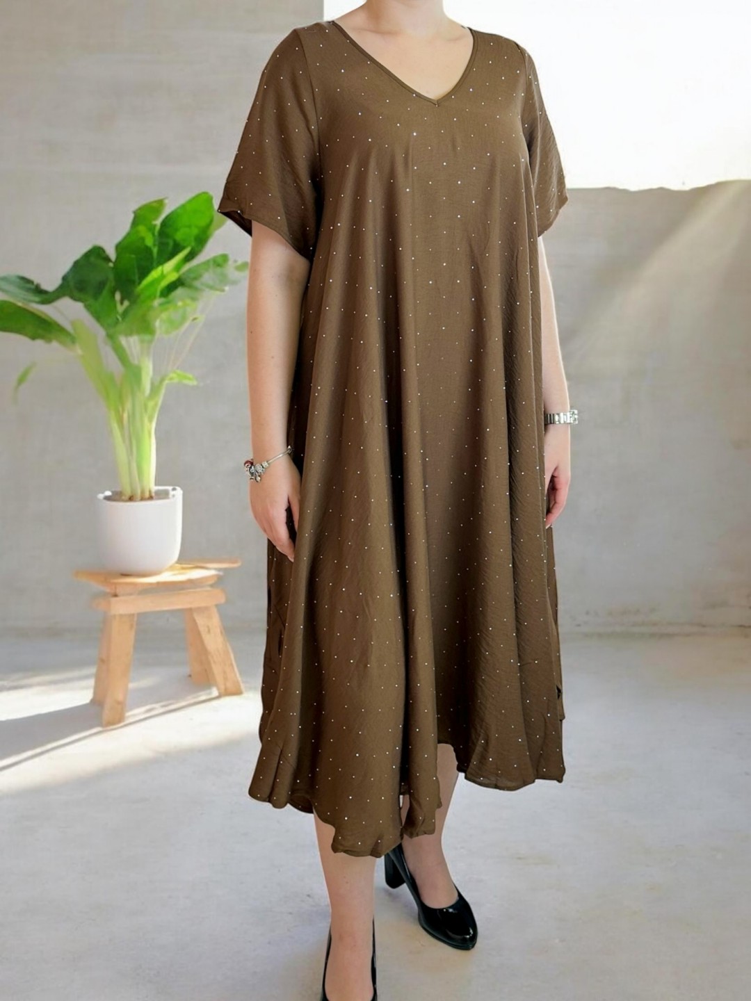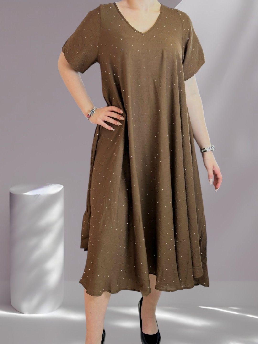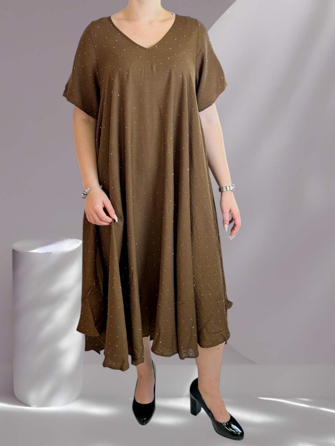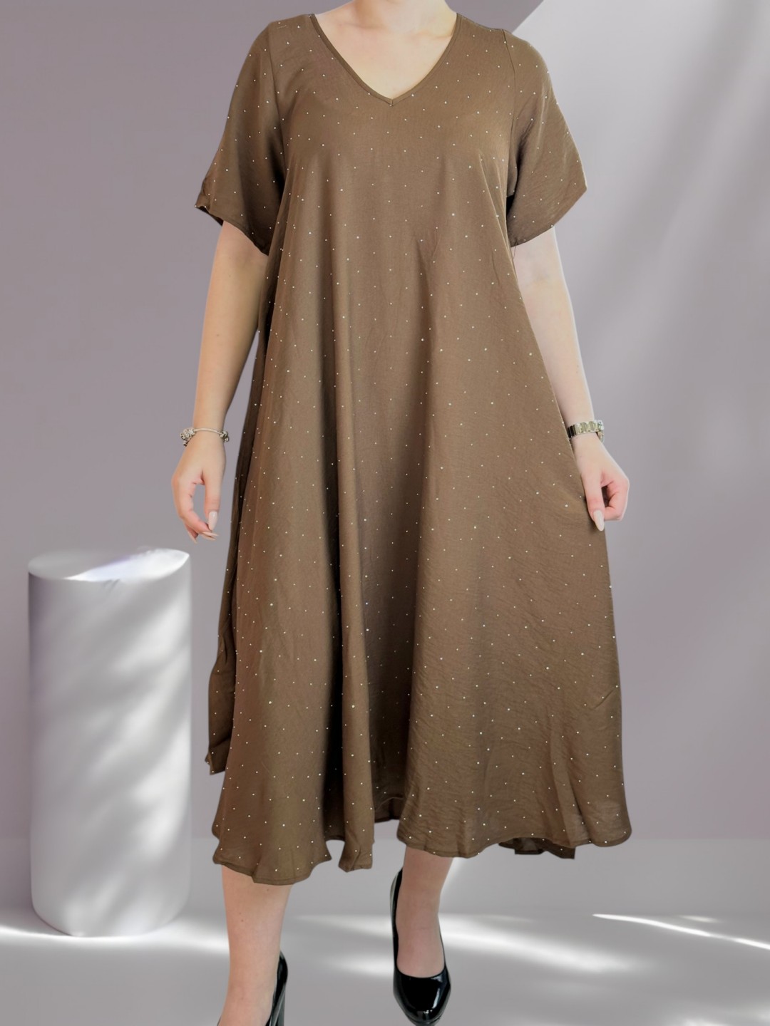 Αναδείξτε την καμπύλη σας με αυτό το κομψό plus size φόρεμα που κάνει statement. Το λαμπερό στρας φωτείνει σαν διαμάντια, ενώ ο συνδυασμός 88% βισκόζης και 12% πολυεστέρα εξασφαλίζει άνεση και εφαρμογή. Διαθέσιμο σε One size.