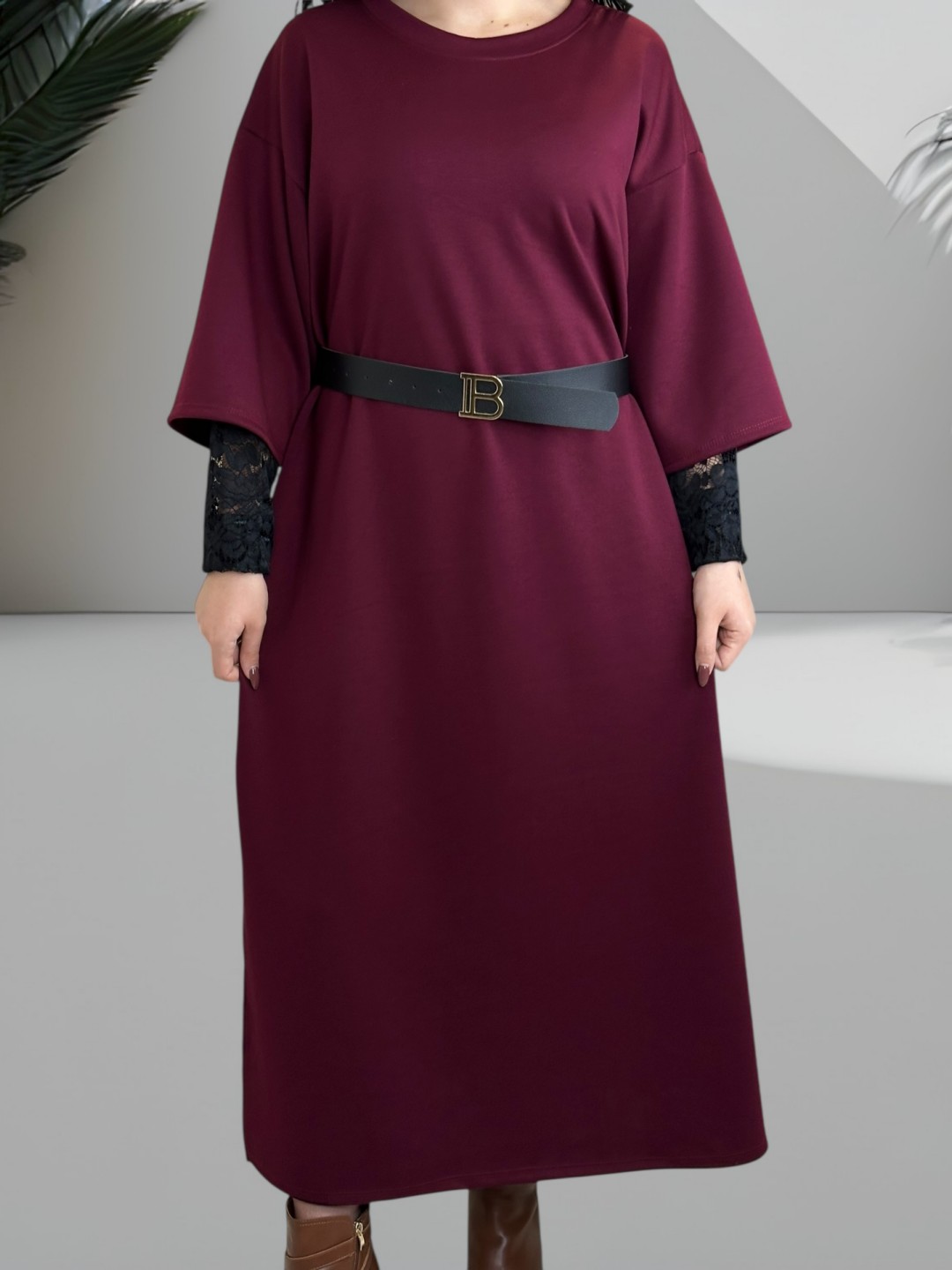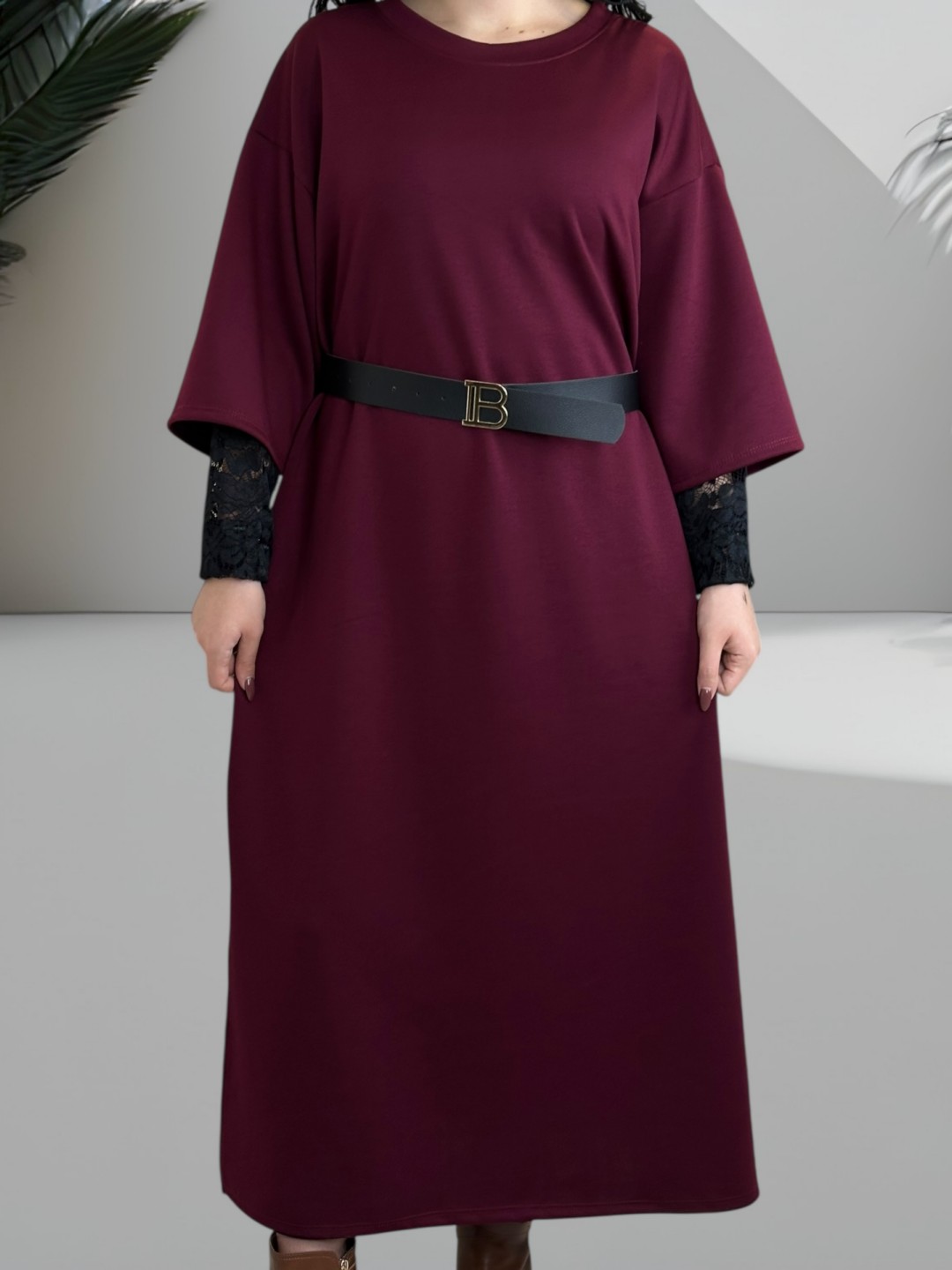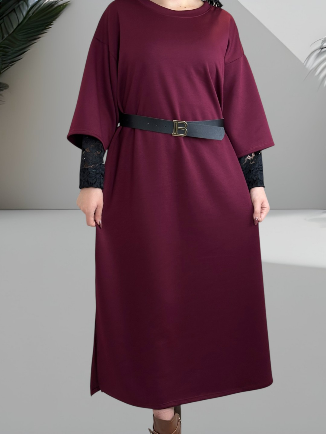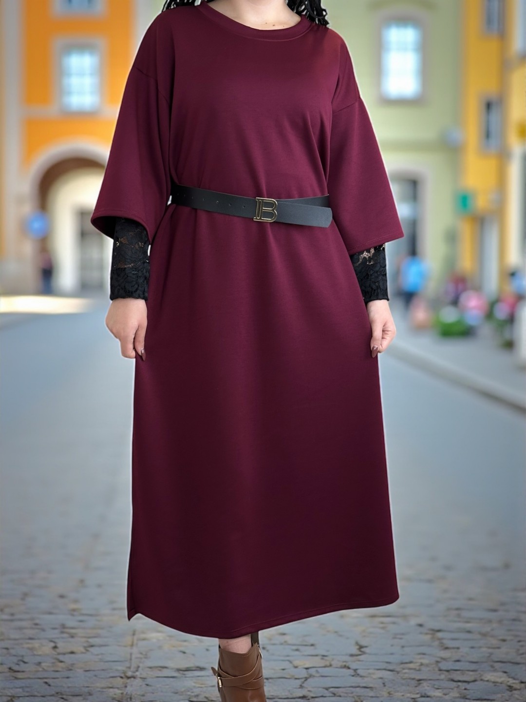 Κομψό φούτερ φόρεμα plus size, με υπέροχη δαντελένια λεπτομέρεια στα μανίκια που προσθέτει μια νότα πολυτέλειας. Ιδανικό για τις ημέρες που θέλετε να νιώθετε άνετα αλλά κομψά. One size.
