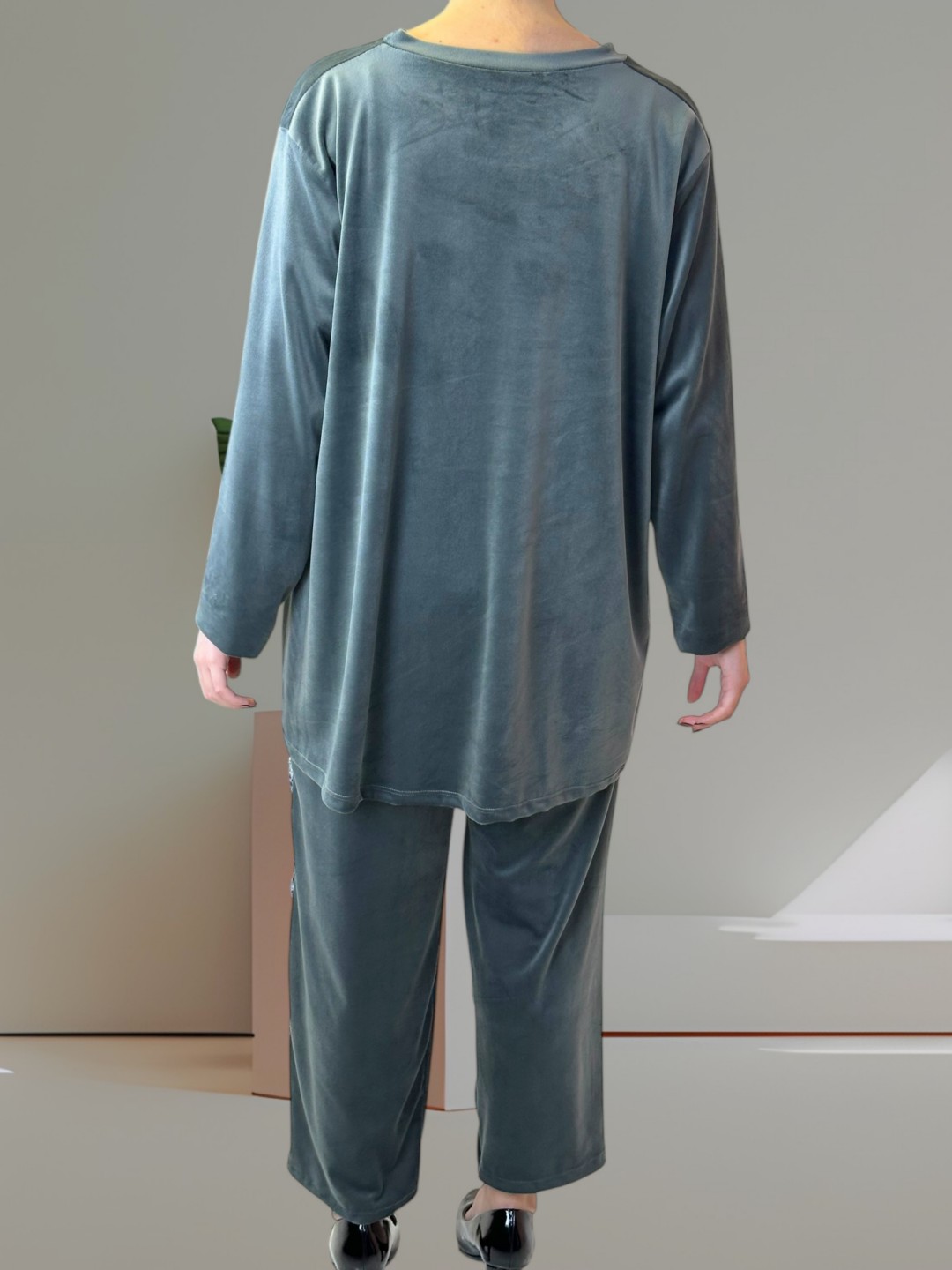Κάντε δικό σας αυτό το εκθαμβωτικό Glam Βελούδινο Σετ, με λάμψη παγιέτας, κατάλληλο για plus size. Με σύνθεση 65% viscoza, 30% poliester και 5% elastan, χαρίζει εξαιρετική εφαρμογή και άνεση. Μέγεθος One size.
