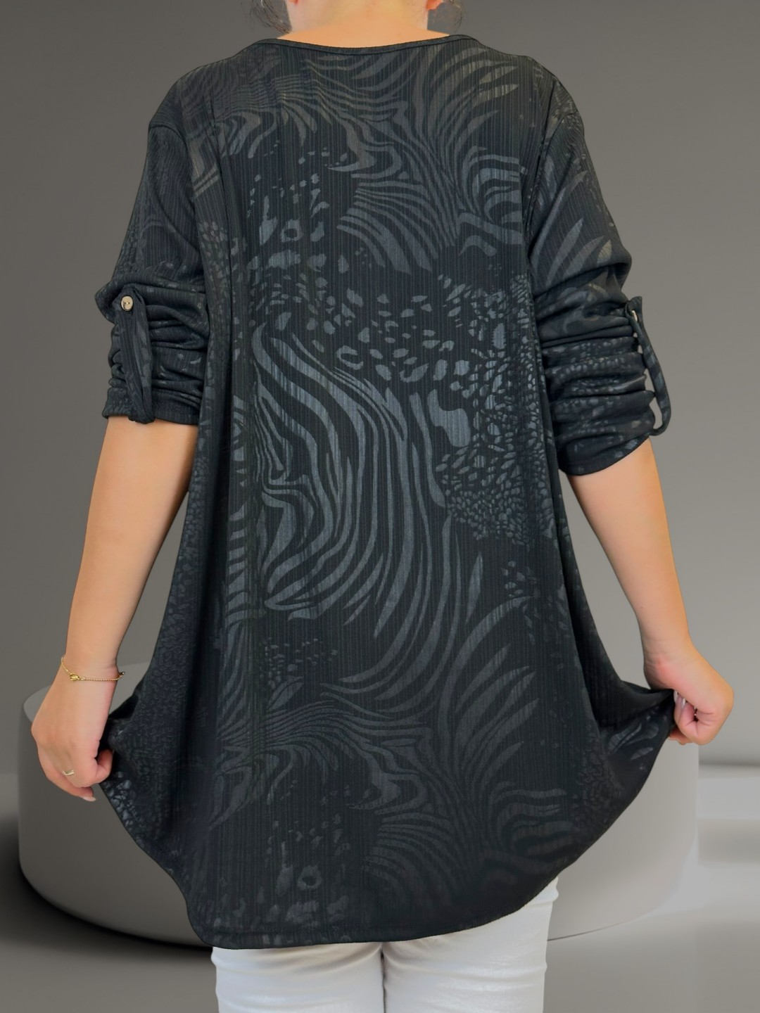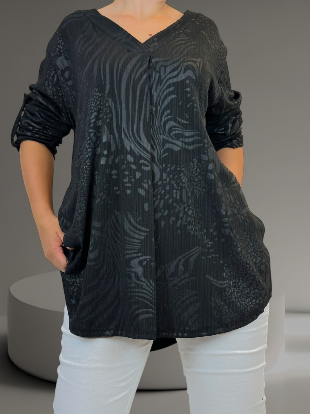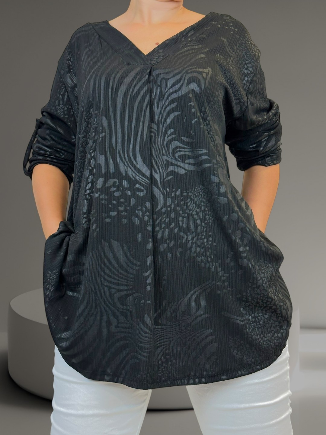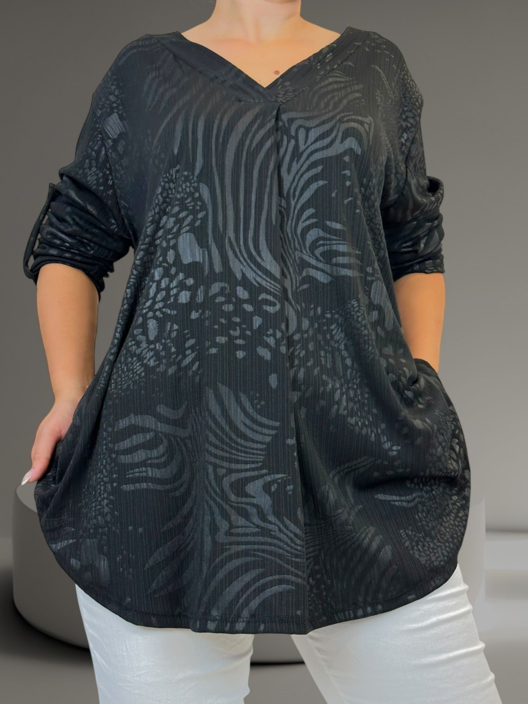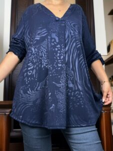 Αναδείξτε την κομψότητά σας με αυτή τη γυναικεία μπλούζα V σε plus size. Η ανάγλυφη υφή προσθέτει έναν μοντέρνο πινελιά, ενώ η σύνθεση της από 95% βισκόζη και 5% ελαστάν καθιστά το σσυγκεκριμένο κομμάτι άνετο και ανθεκτικό. Είναι διαθέσιμη σε One size για να ταιριάζει τέλεια σε κάθε σωματότυπο.