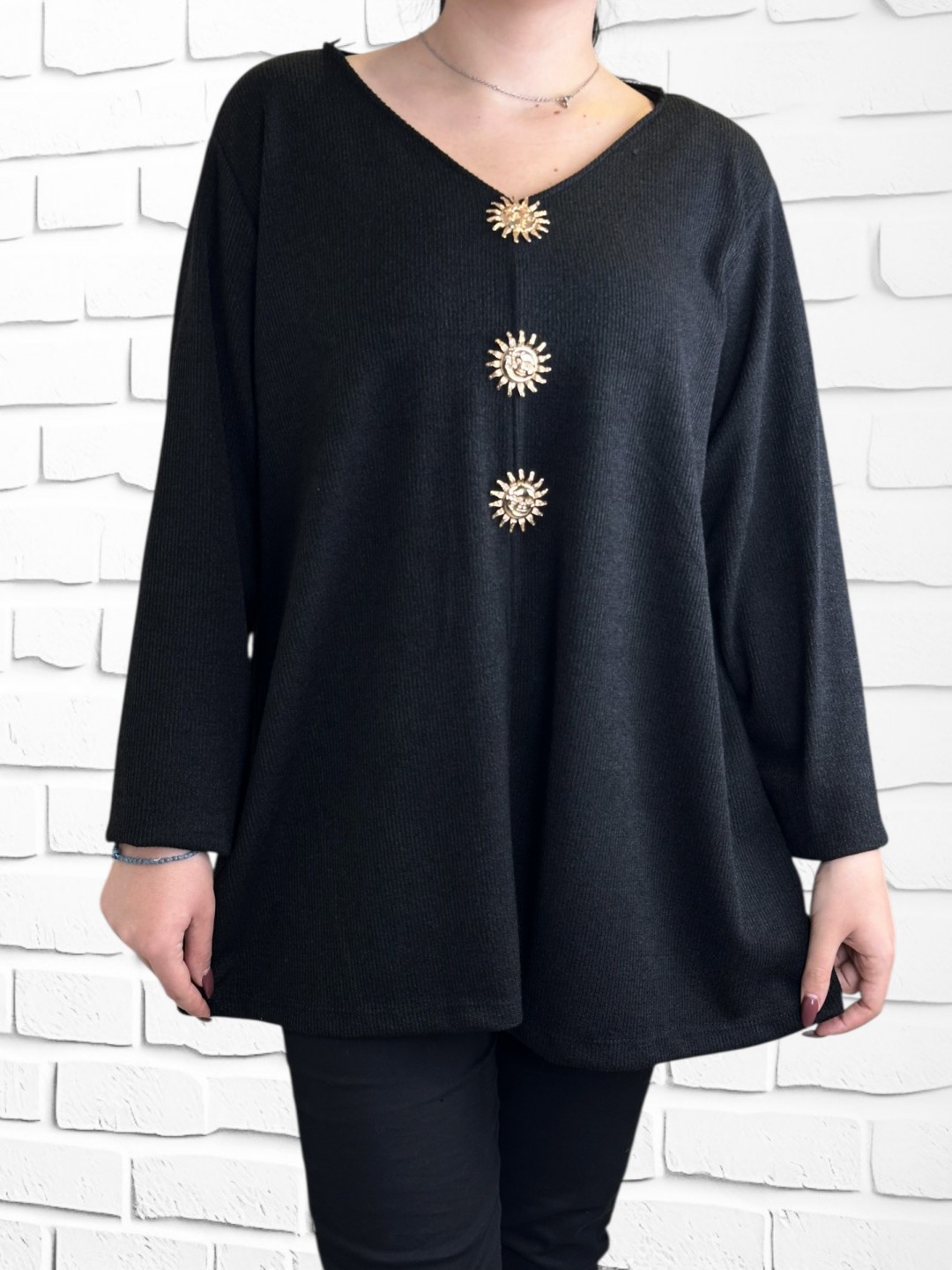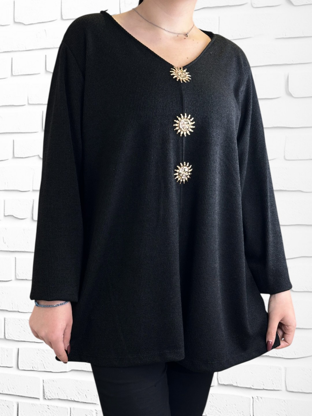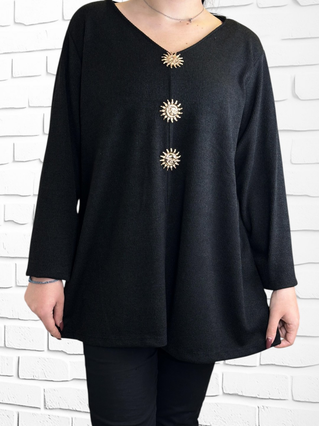 Αναβαθμίστε το στυλ σας με αυτήν την κομψή μπλούζα plus size, με λαμπερό μοτίβο ήλιου. Κατασκευασμένη από 95% βισκόζη και 5% ελαστάν, προσφέρει άνεση και ευκολία κίνησης. Διατίθεται σε one size, προσφέροντας ιδανική εφαρμογή για όλες τις σιλουέτες.