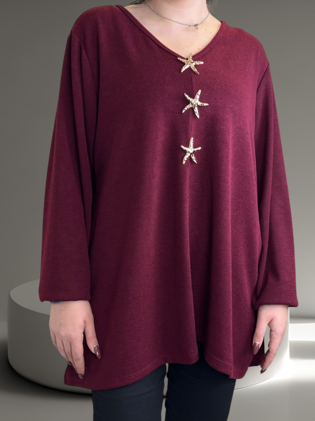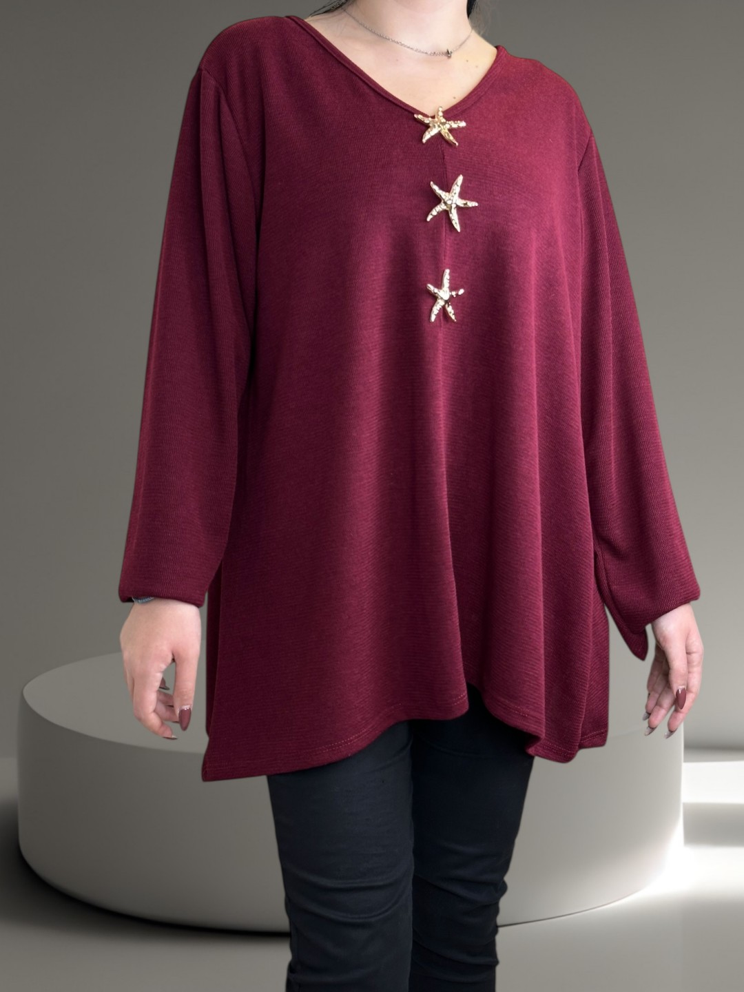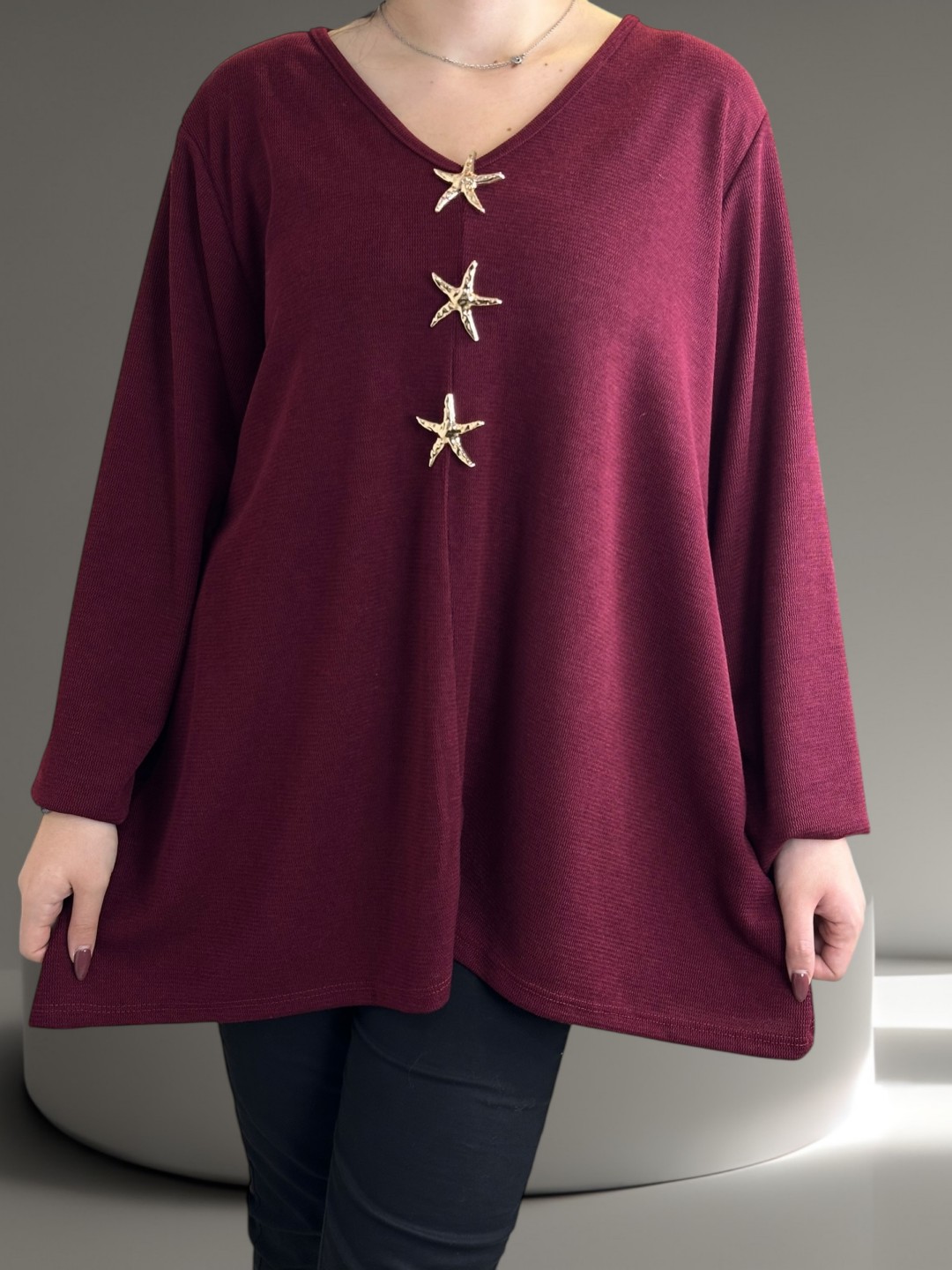 Κομψή μπλούζα plus size με τρεις καρφίτσες αστέρια, για να δώσει λάμψη στην εμφάνισή σας. Κατασκευασμένη από 50% viscose και 50% polyester, προσφέρει άνεση και εφαρμόζει τέλεια. Μεγέθη One size για απόλυτη ευκολία.