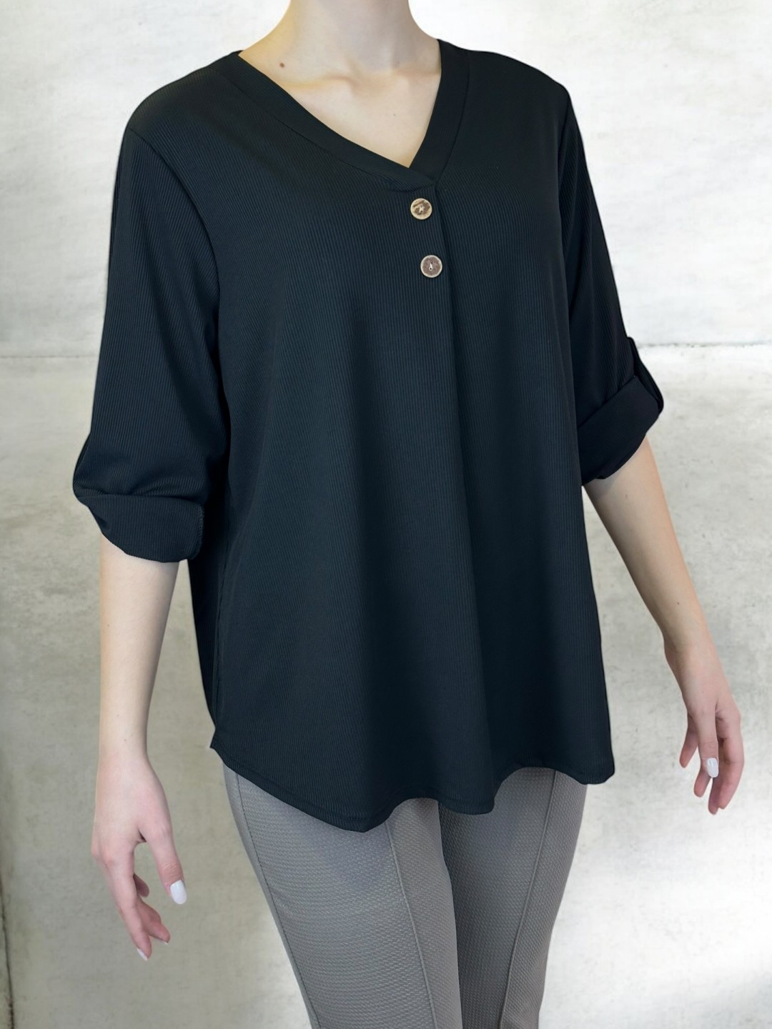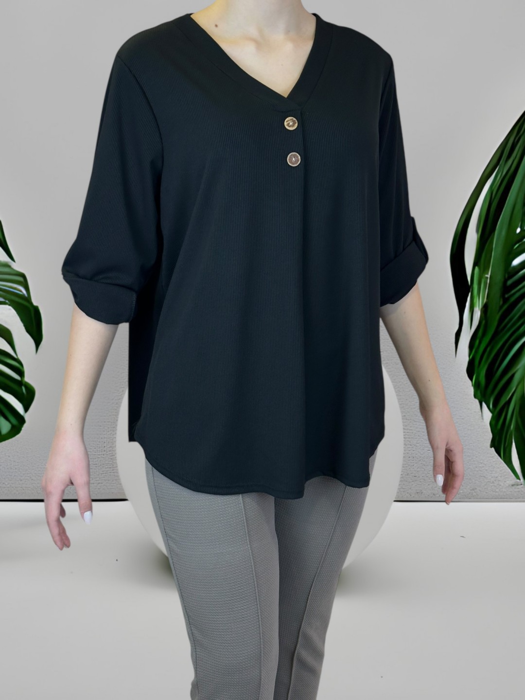 Αναδείξτε τη φινέτσα σας με αυτή τη γυναικεία μπλούζα plus size. Διαθέτει V λαιμόκοψη και διακοσμητικά κουμπιά, προσφέροντας στυλ και άνεση. Διαθέσιμο σε One size, αγκαλιάζει όλα τα σωματότυπα.
