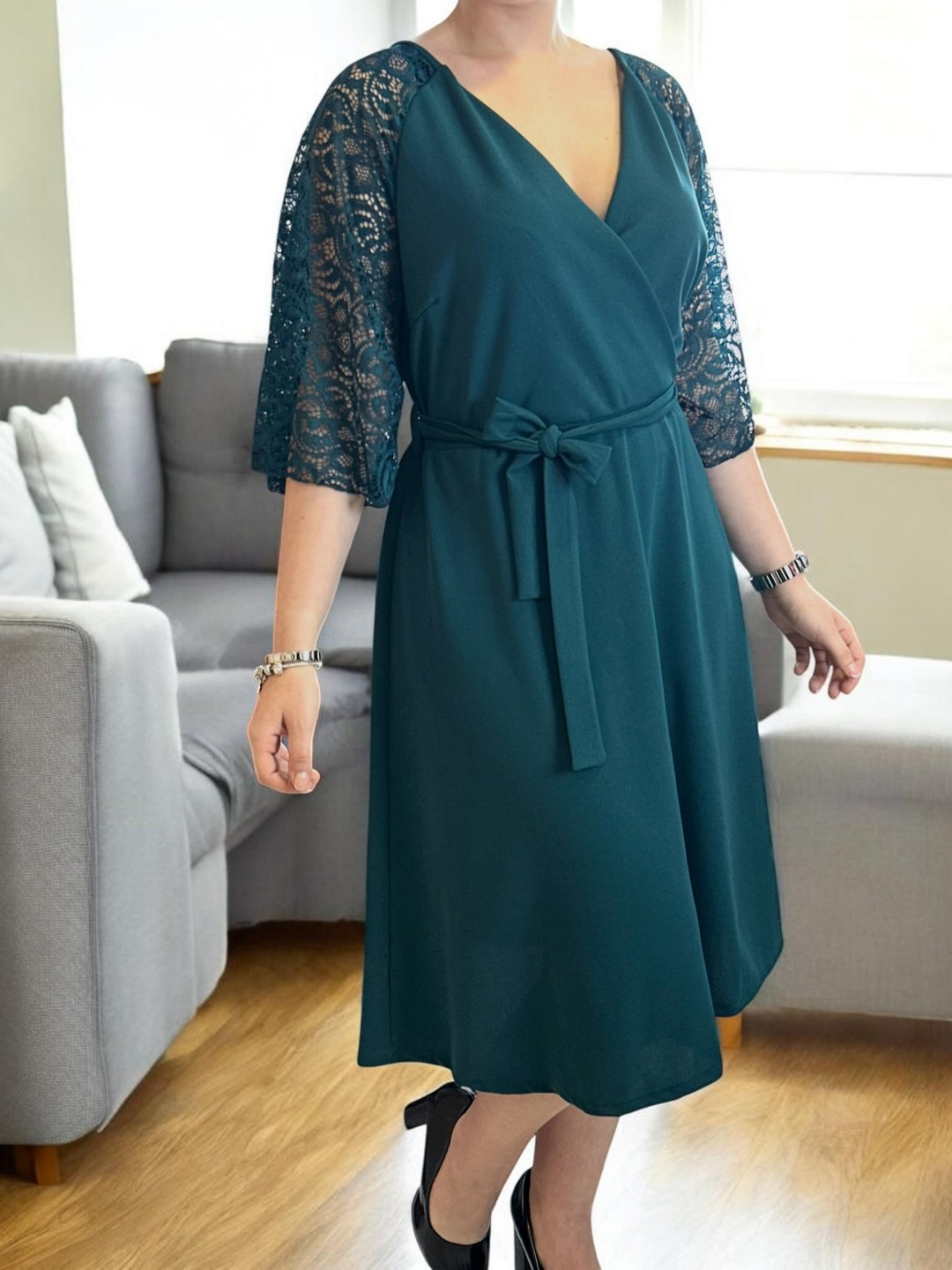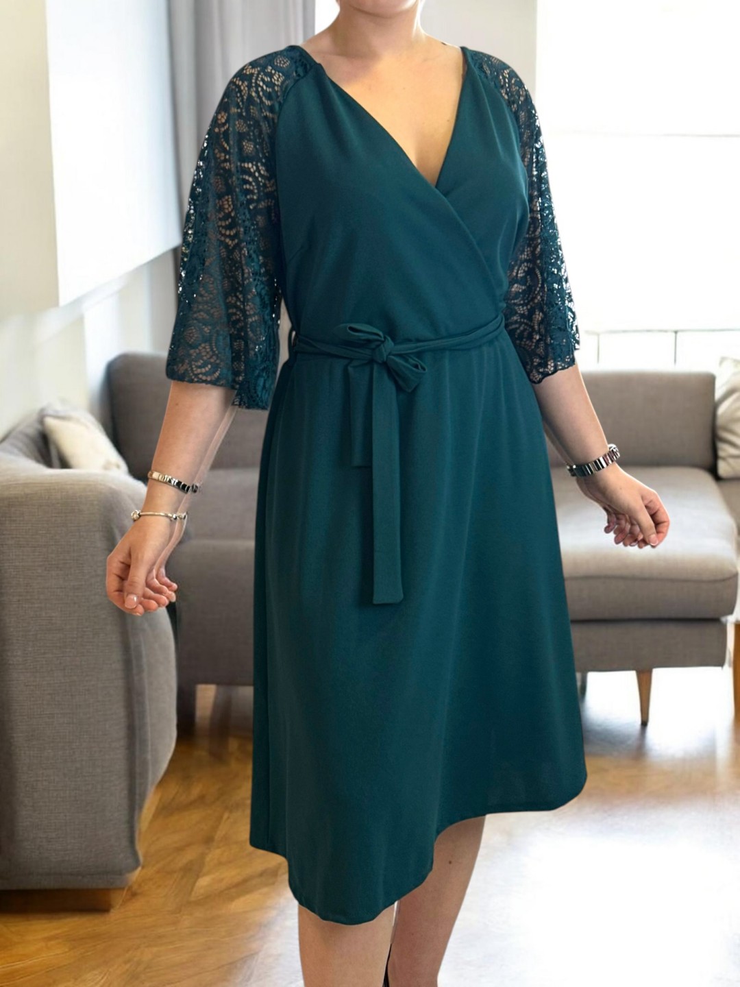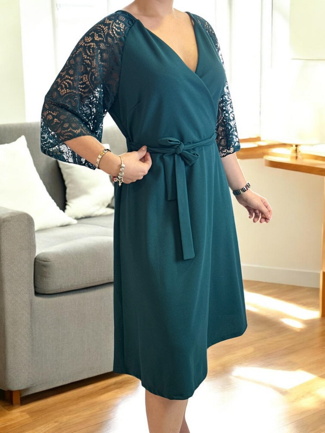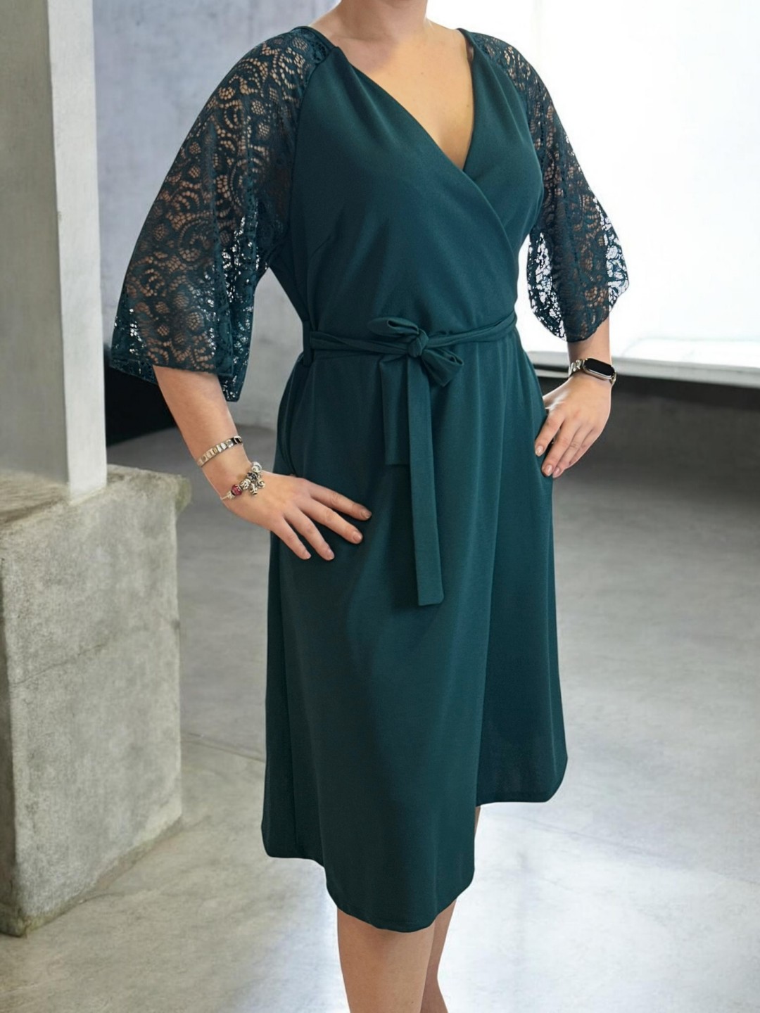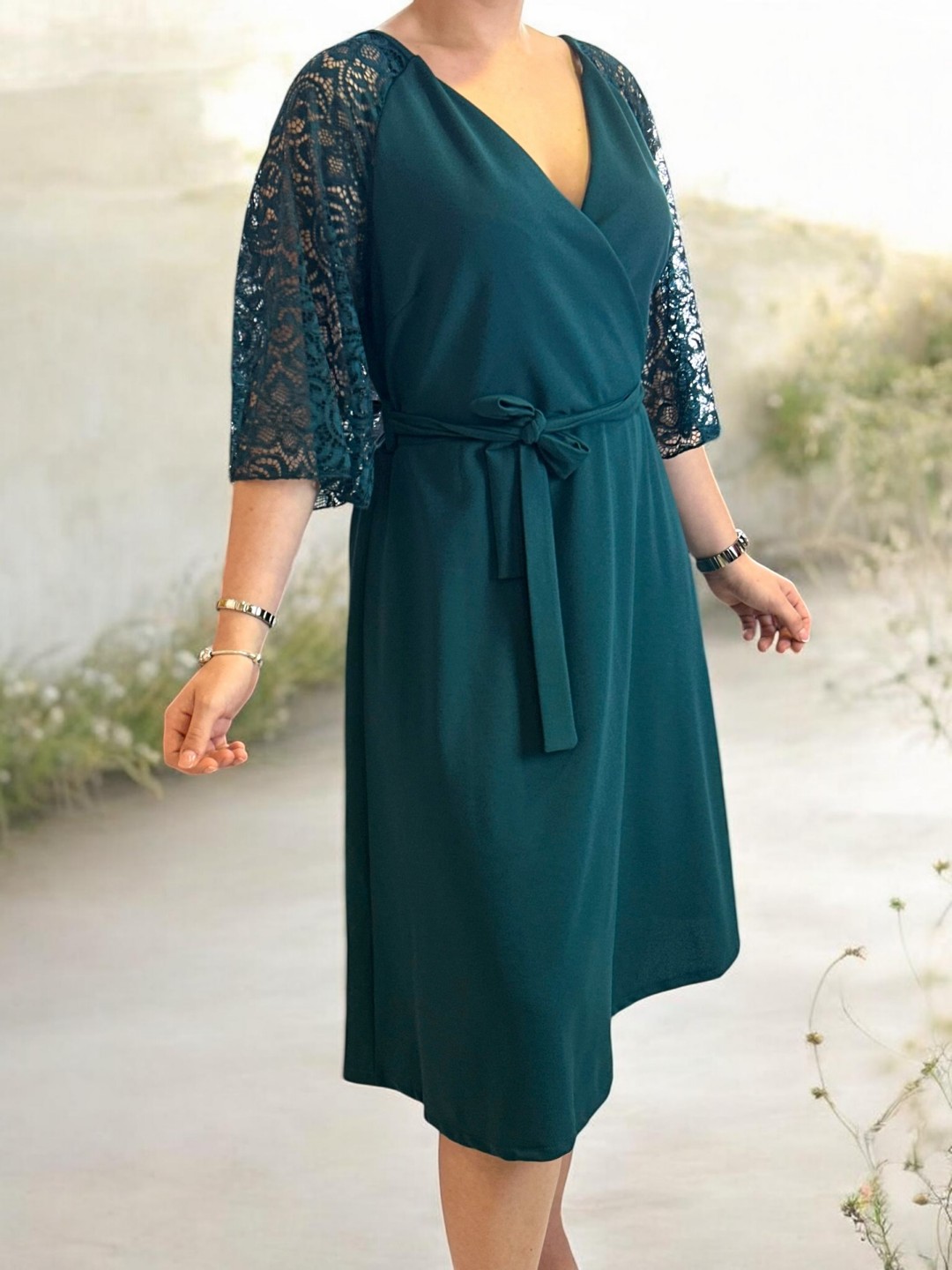 Κομψό κρουαζέ φόρεμα με δαντελένια μανίκια