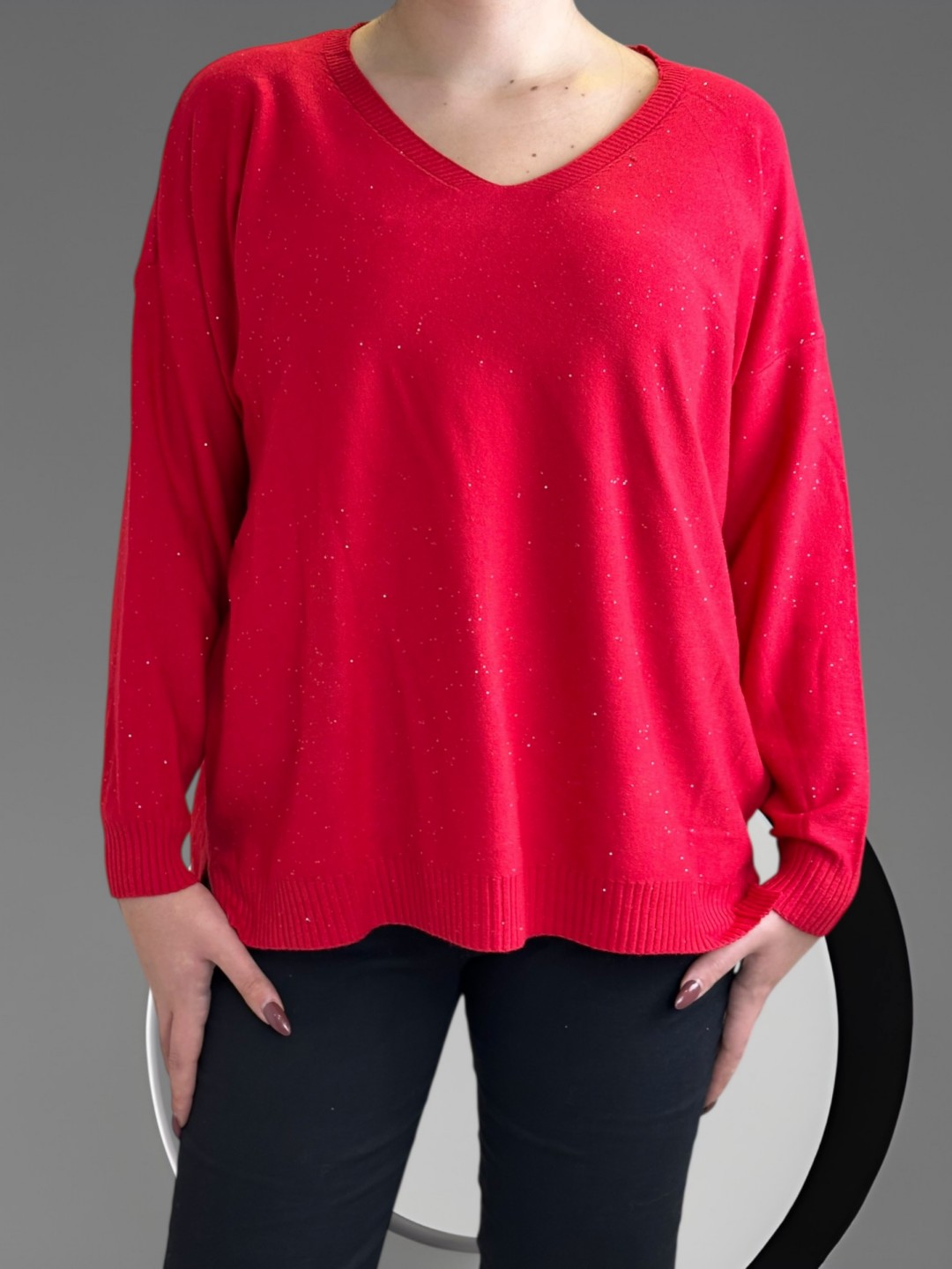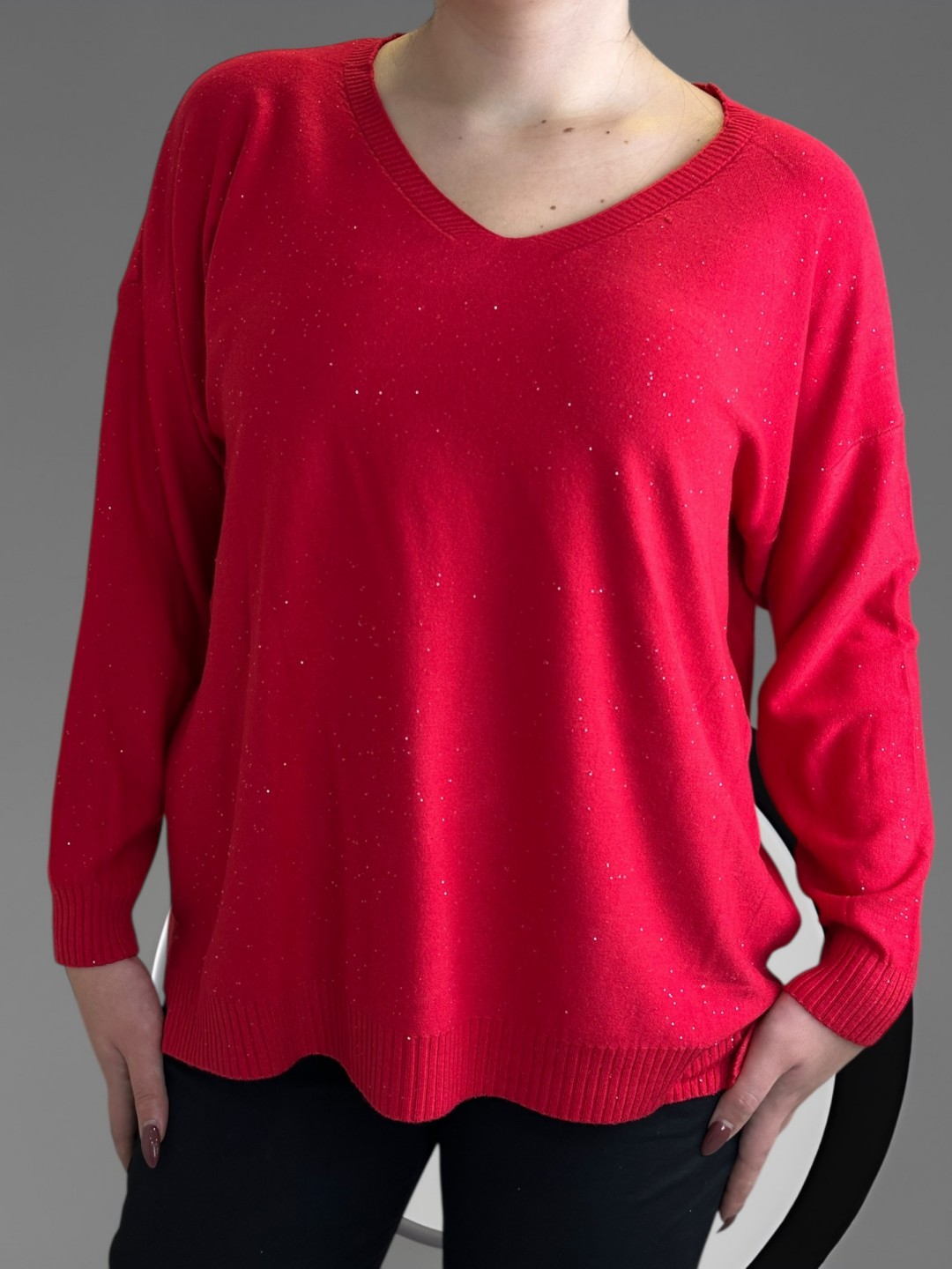 Κομψό plus size πουλόβερ με V neckline, για σίγουρη επιλογή. Συνδυάζει με μοναδικό τρόπο την απαλότητα της viscoza 45% και την ανθεκτικότητα του poliester 22%. Περιλαμβάνει 3% χαντρες για μία λεπτομέρεια που κάνει τη διαφορά. Διαθέσιμο σε One size!