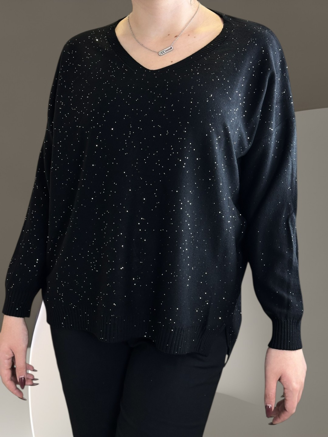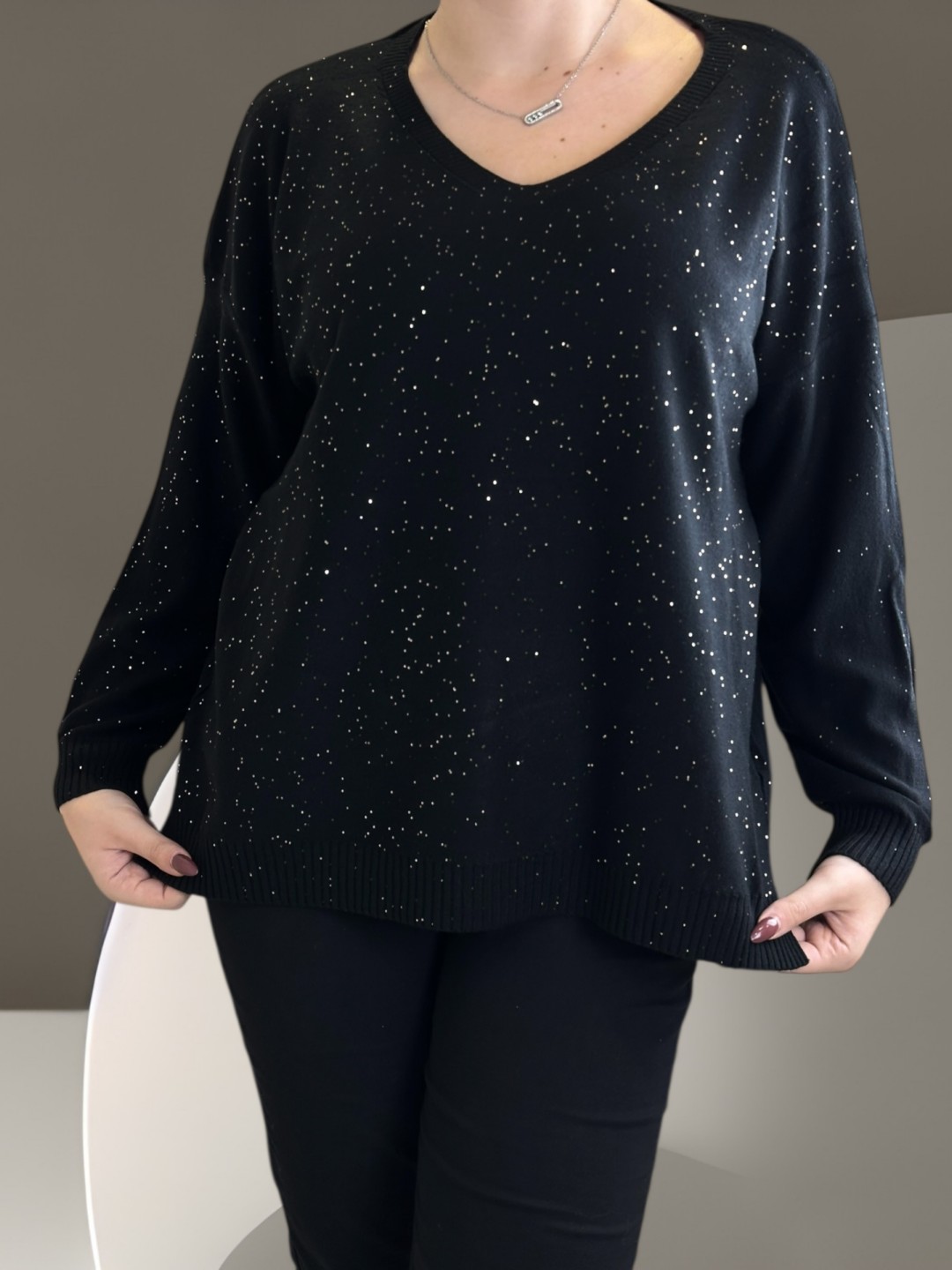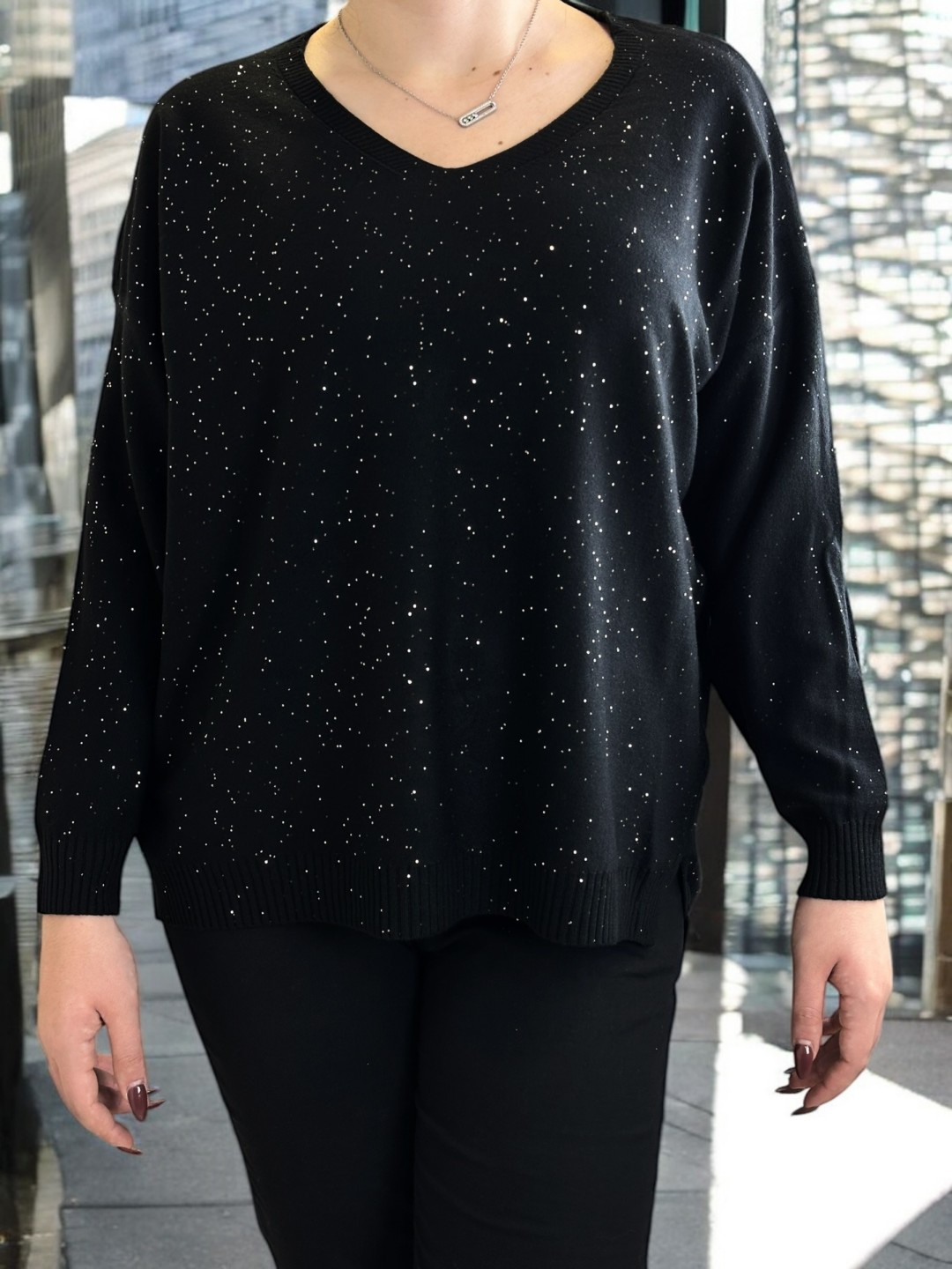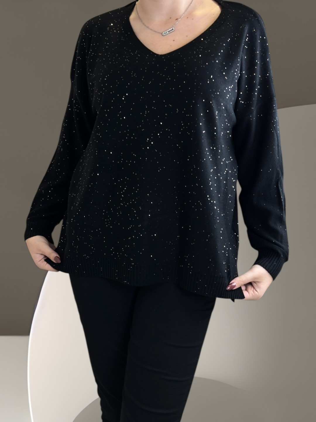 Προσθέστε μια δόση κομψότητας στο ντύσιμό σας με αυτόν τον υπέροχο πουλόβερ σε plus size. Διαθέτει στιλάτο V neckline, κατασκευασμένο από ανθεκτικό μείγμα 45% viscoza, 22% poliester και διακοσμημένο με μοντέρνες χάντρες. Σε universal μέγεθος για τέλεια εφαρμογή!