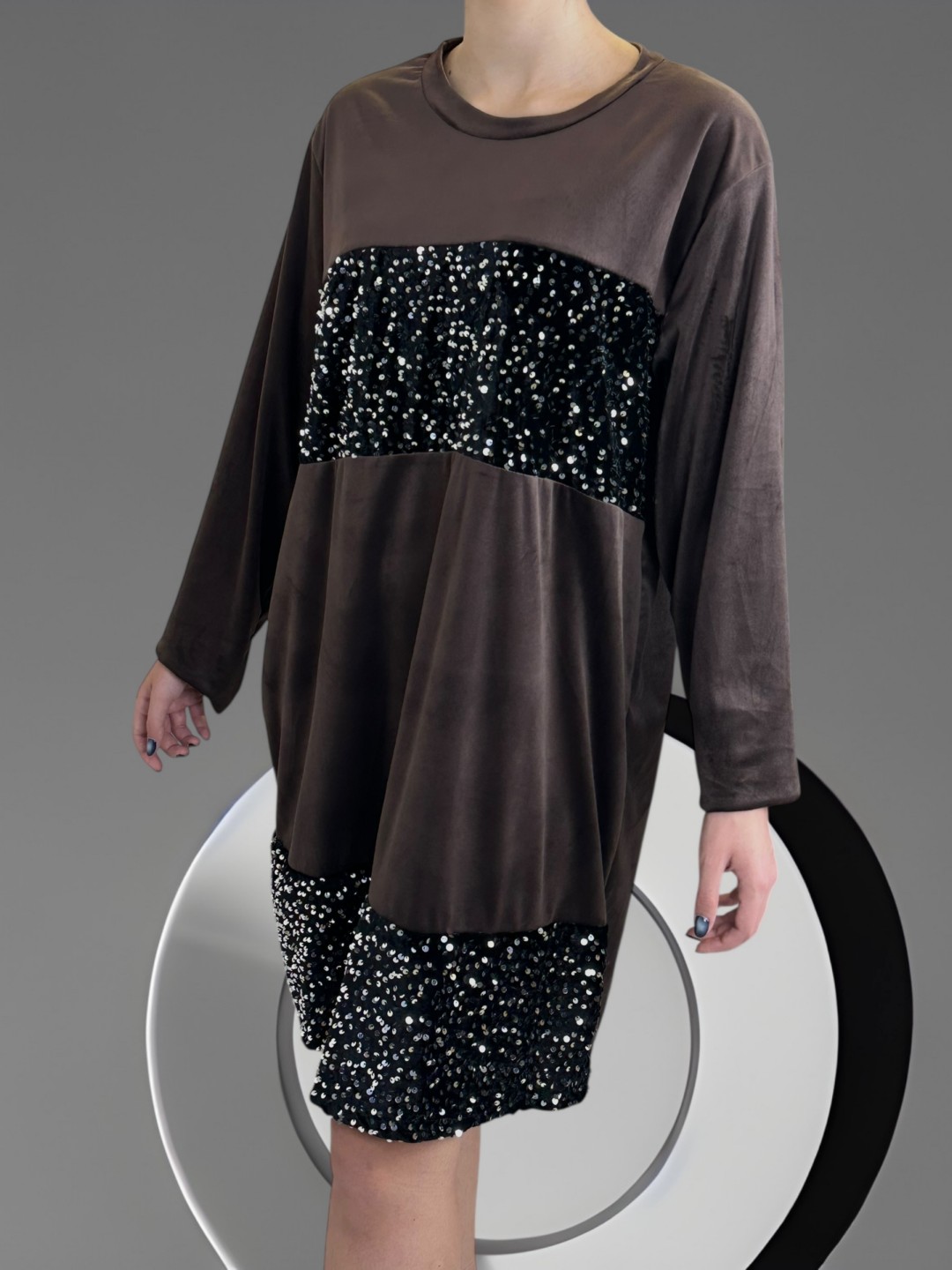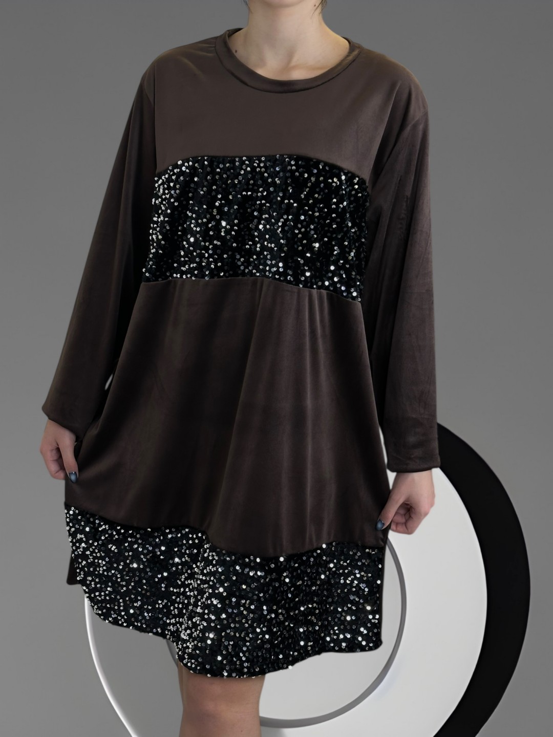 Αναδείξτε τη θηλυκότητά σας με αυτό το κομψό βελούδινο φόρεμα με λαμπερές παγιέτες. Plus size και από σύνθεση 30% poliester, 5% elastan, 60% viscoza, σας προσφέρει άνεση και στυλ σε κάθε σας εμφάνιση. One size, ταιριάζει σε κάθε σιλουέτα.