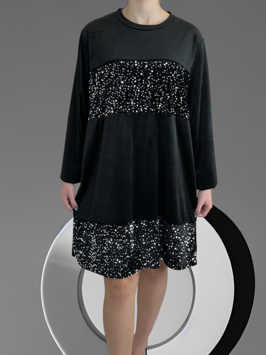 Εντυπωσιάστε με το κομψό βελούδινο φόρεμα με λαμπερές παγιέτες. Σε plus size μεγέθη για να αγκαλιάσει τις καμπύλες σας, είναι κατασκευασμένο από άνετο υλικό (30% πολυεστέρας, 5% ελαστάν, 60% βισκόζη). One size για άψογη εφαρμογή.
