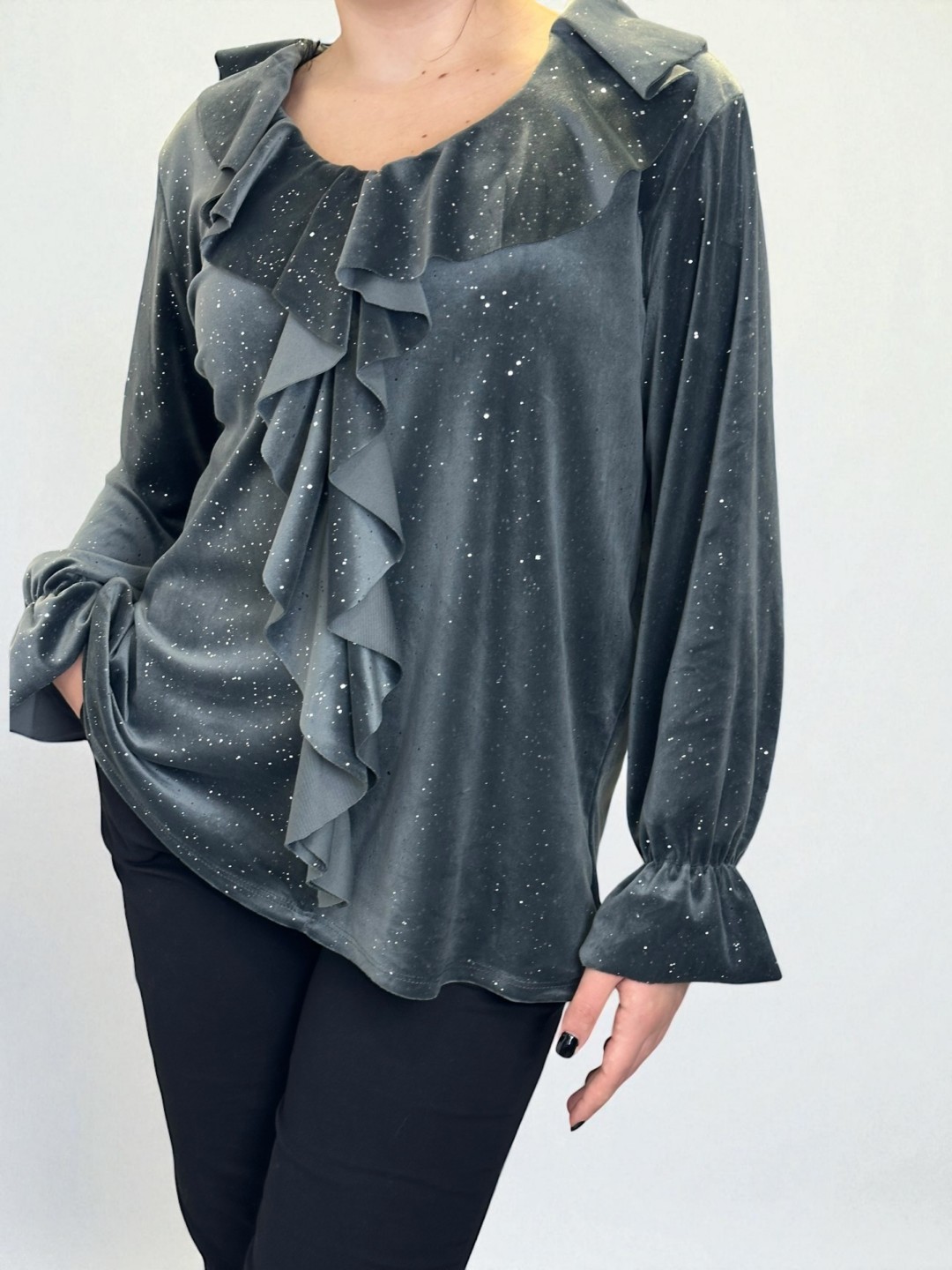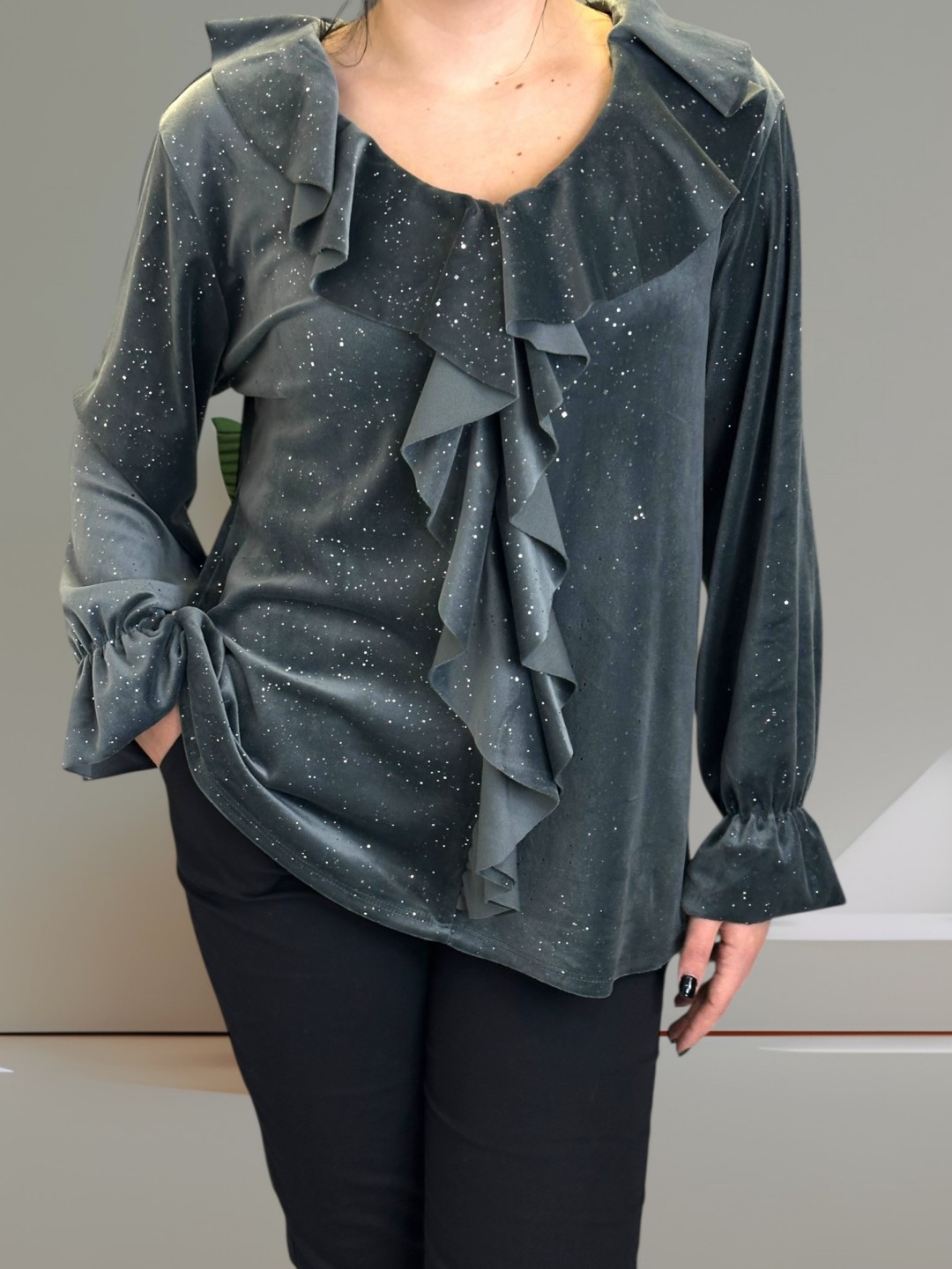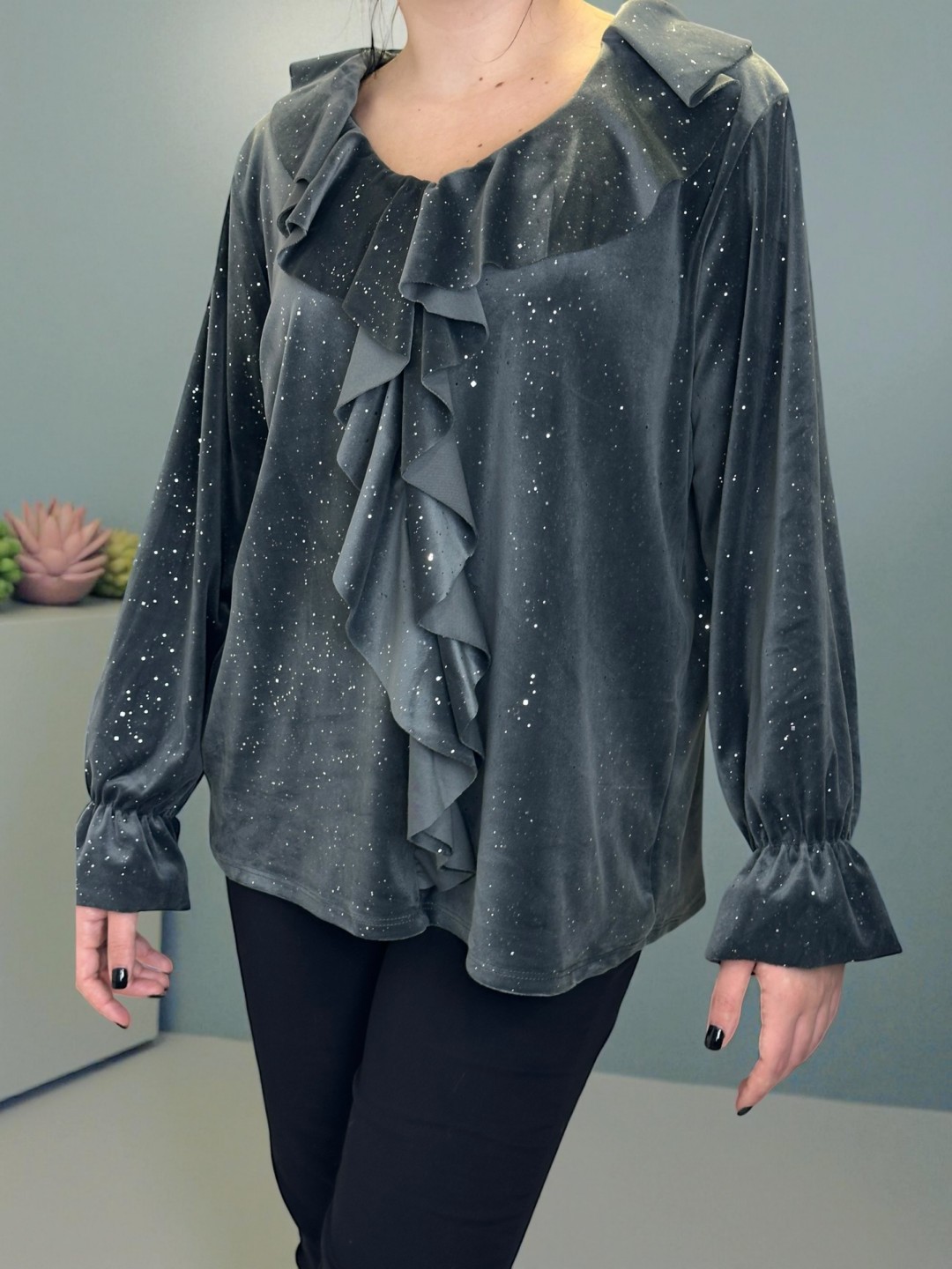 Λαμπερή μπλούζα με ρομαντικά βολάν