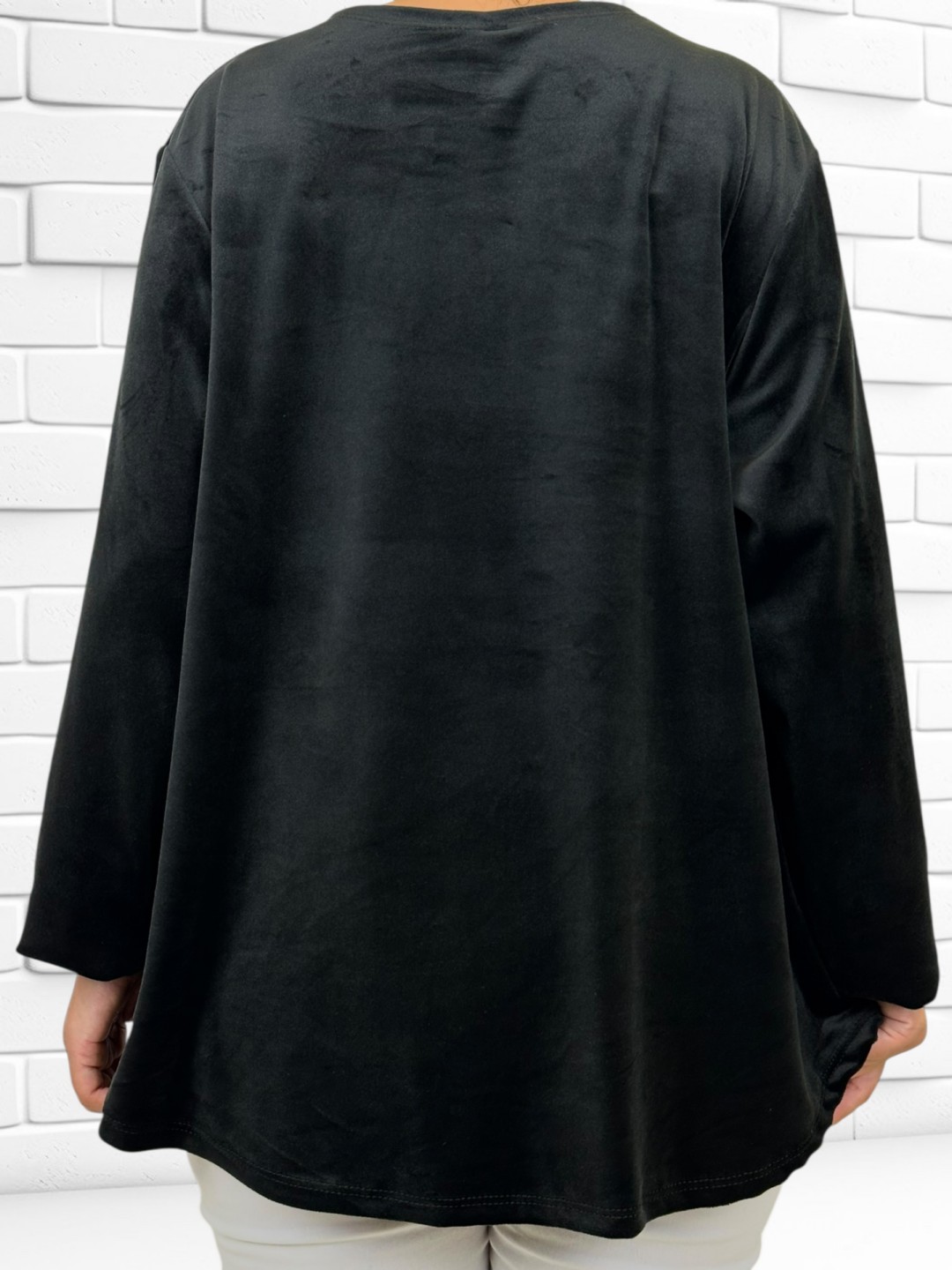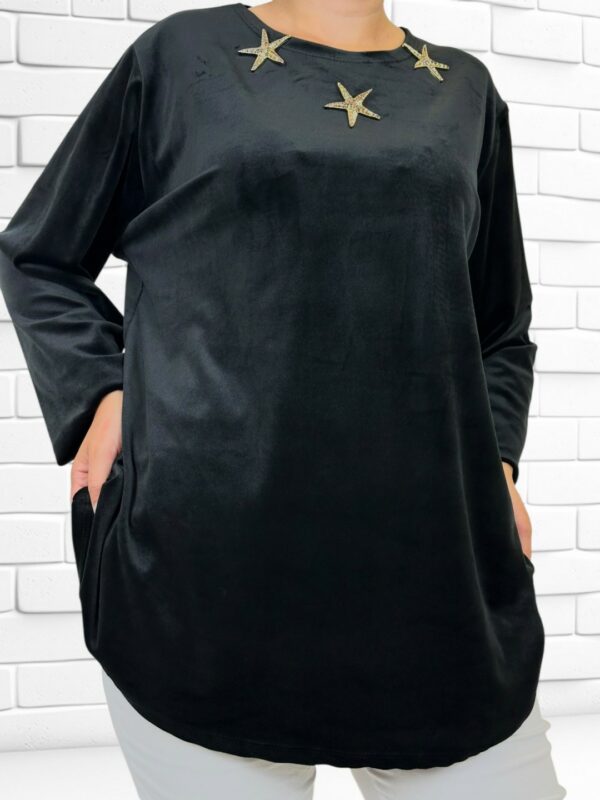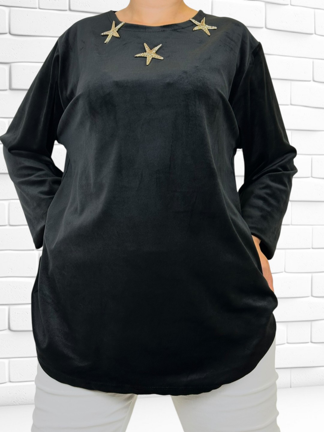 Αναδείξτε τη στιλιστική σας πλευρά με αυτή τη λαμπερή velvet μπλούζα με σχέδιο αστέρια. Είναι άνετη, με χαρακτηριστικό plus size fit, για ελαφρώς φαρδύτερη αίσθηση. Μέγεθος Οne size, ταιριάζει σε όλα τα σώματα!