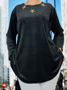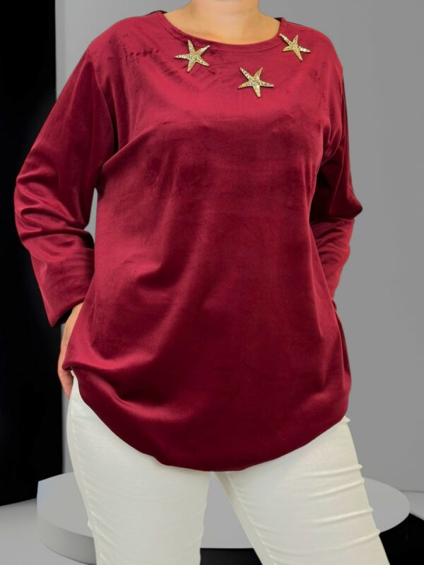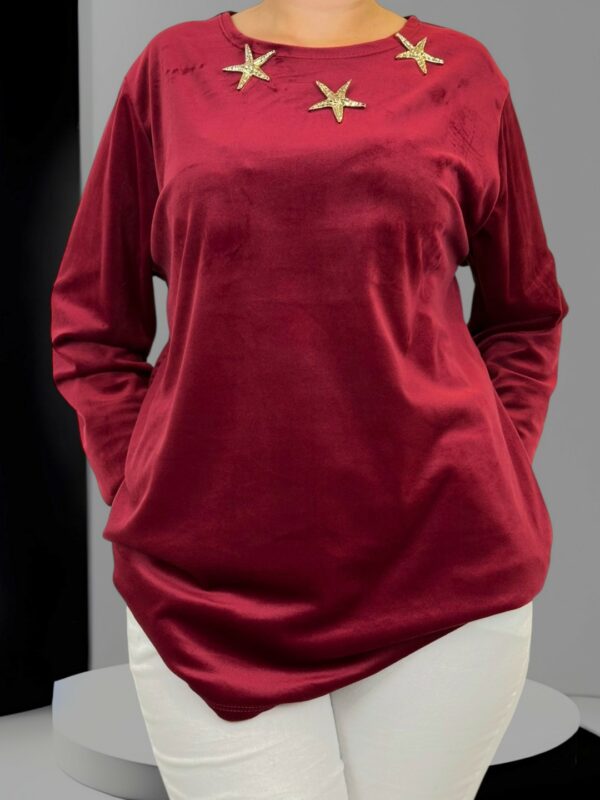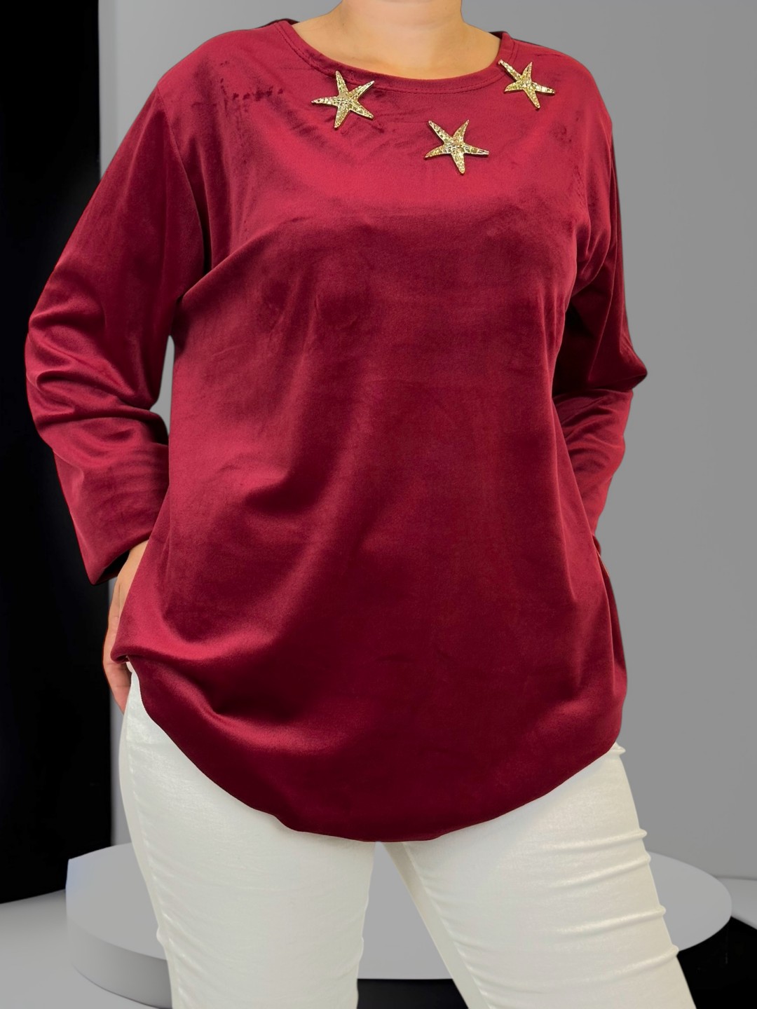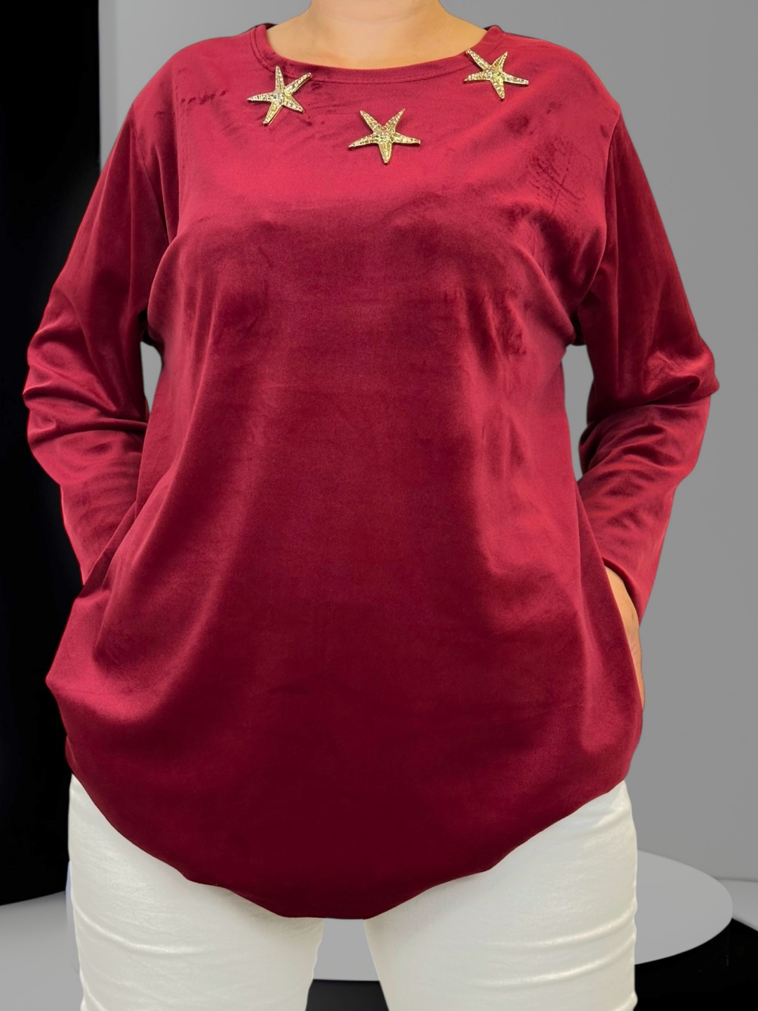 Ξεχωρίστε με αυτή τη λαμπερή Velvet μπλούζα με σχέδιο αστέρια. Κατασκευασμένη για plus size πρόσωπα, αυτή η one size μπλούζα είναι η τέλεια προσθήκη στη ντουλάπα σας για λαμπερές εμφανίσεις.