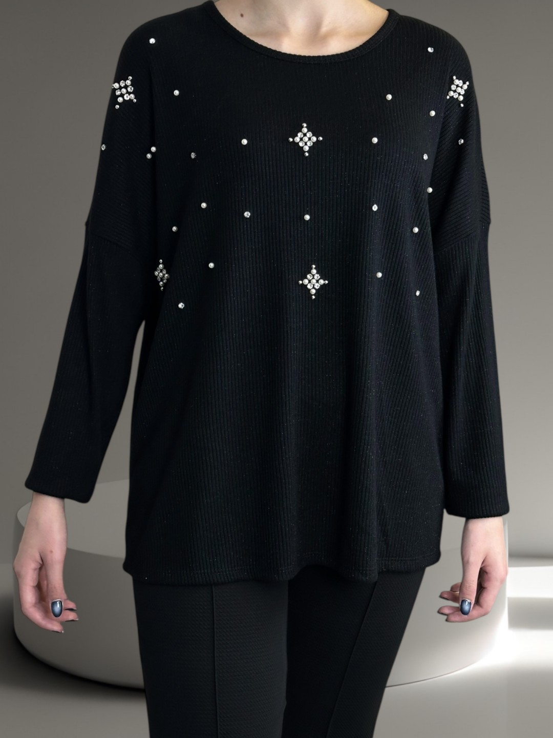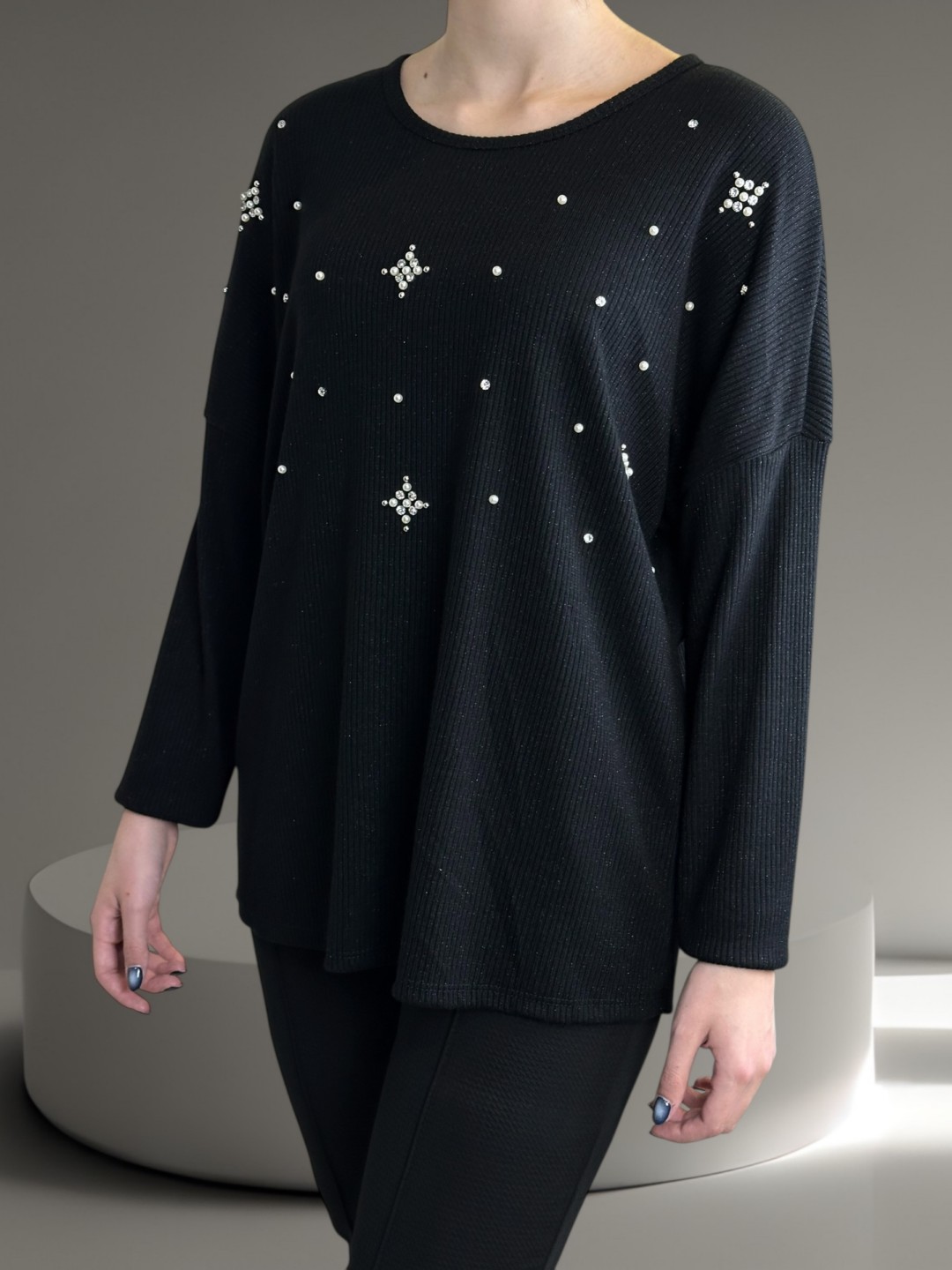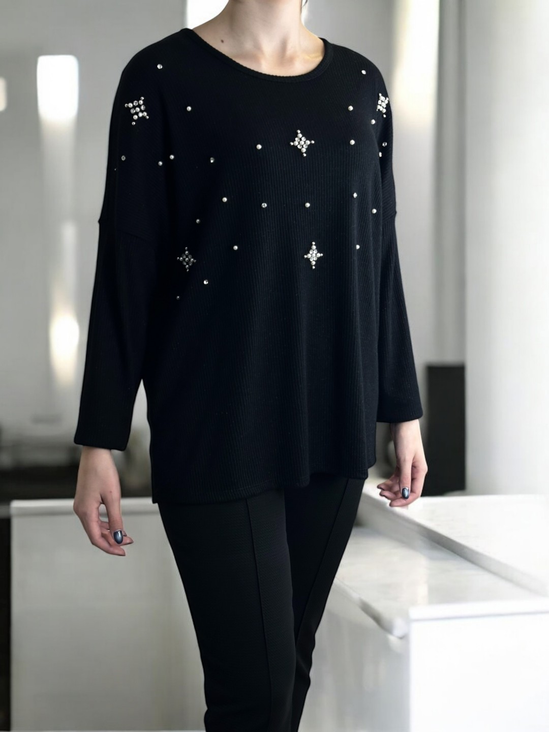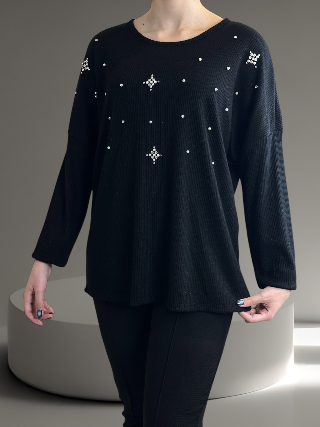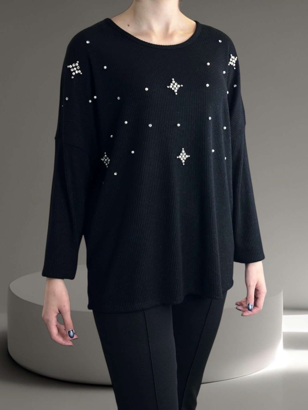 Μαύρη Μπλούζα Διακοσμημένη με Πέρλες & Στρας