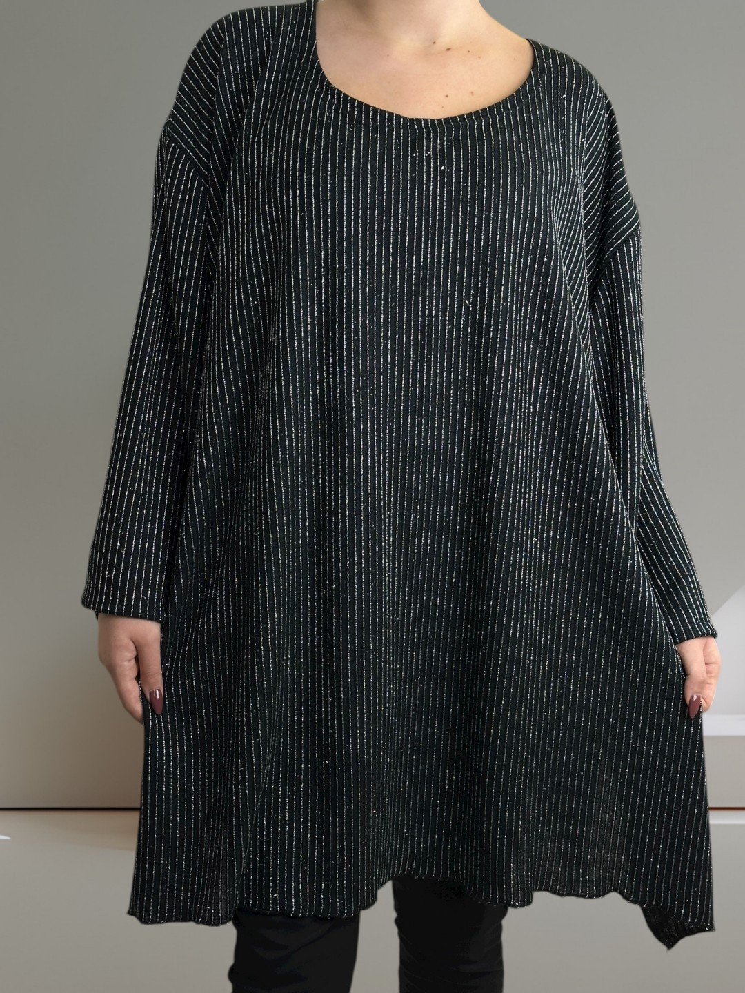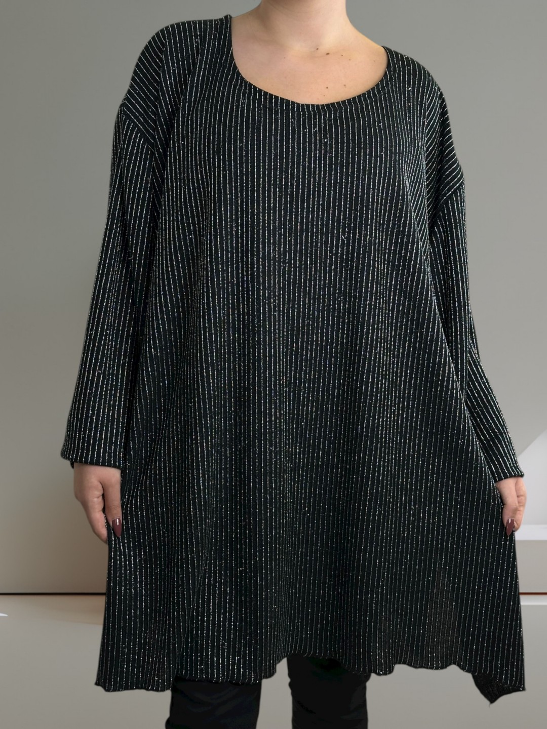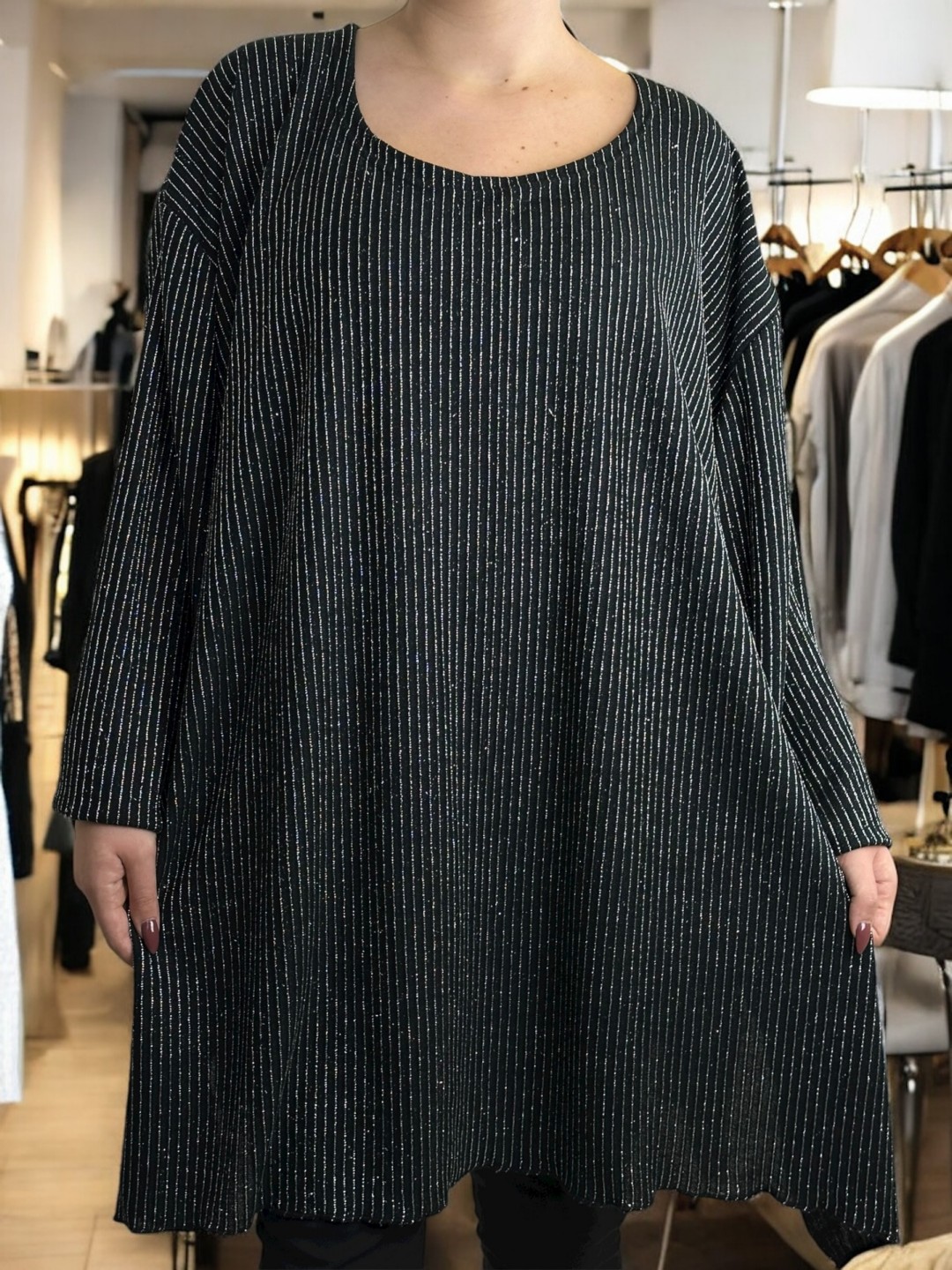 Μαύρο μπλουζοφόρεμα για μεγάλα μεγέθη. Πολυτελής γυαλίστερη χρυσοκλωστή που προσδίδει λάμψη και χαρίζει στυλάτη διάθεση. Ιδανικό για να δημιουργήσετε μοναδικά λαμπερές εμφανίσεις. One size για τέλεια εφαρμογή! Διαμορφώστε μια βραδινή εμφάνιση που ξεχωρίζει!