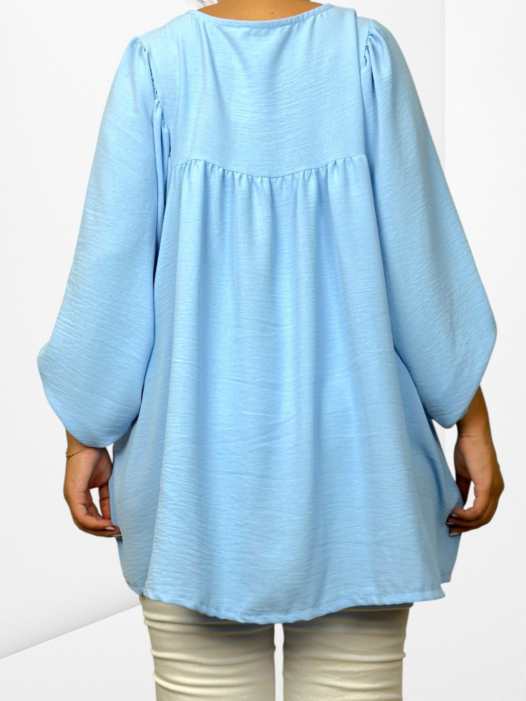 Αναβαθμίστε την γυναικεία γκαρνταρόμπα σας με την μονόχρωμη βισκόζ μπλούζα Plus Size. Με V δέσιμο για βελτιωμένη εφαρμογή, αυτό το κομμάτι είναι κατασκευασμένο από τον τέλειο συνδυασμό 50% βισκόζ, 45% πολυεστέρα και 5% ελαστάν για απόλυτη άνεση και ελαστικότητα. Διατίθεται σε One Size.