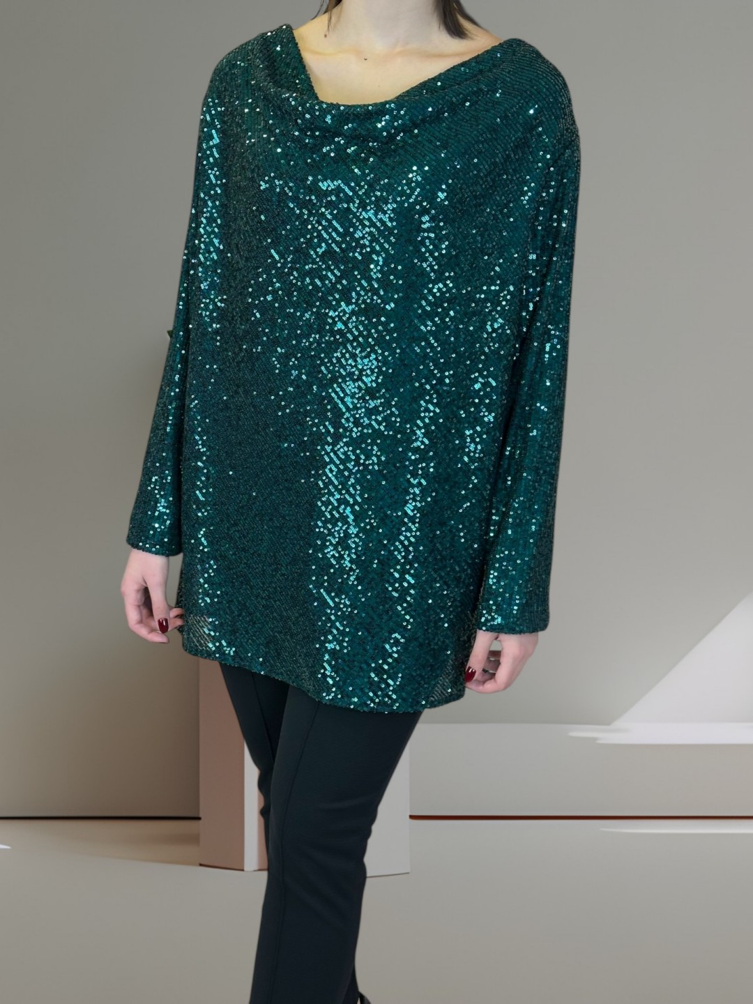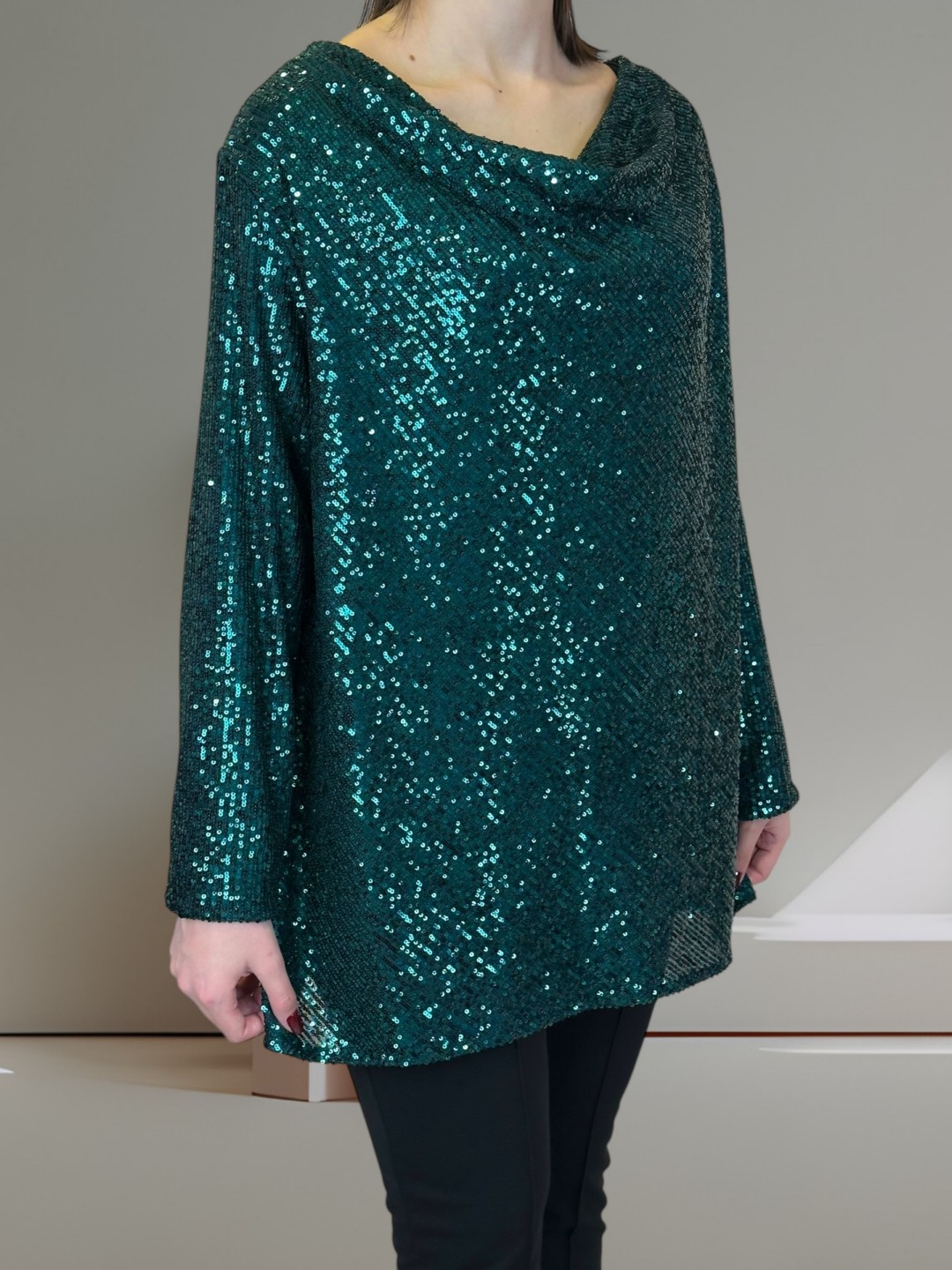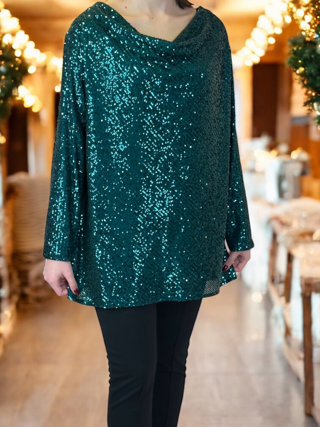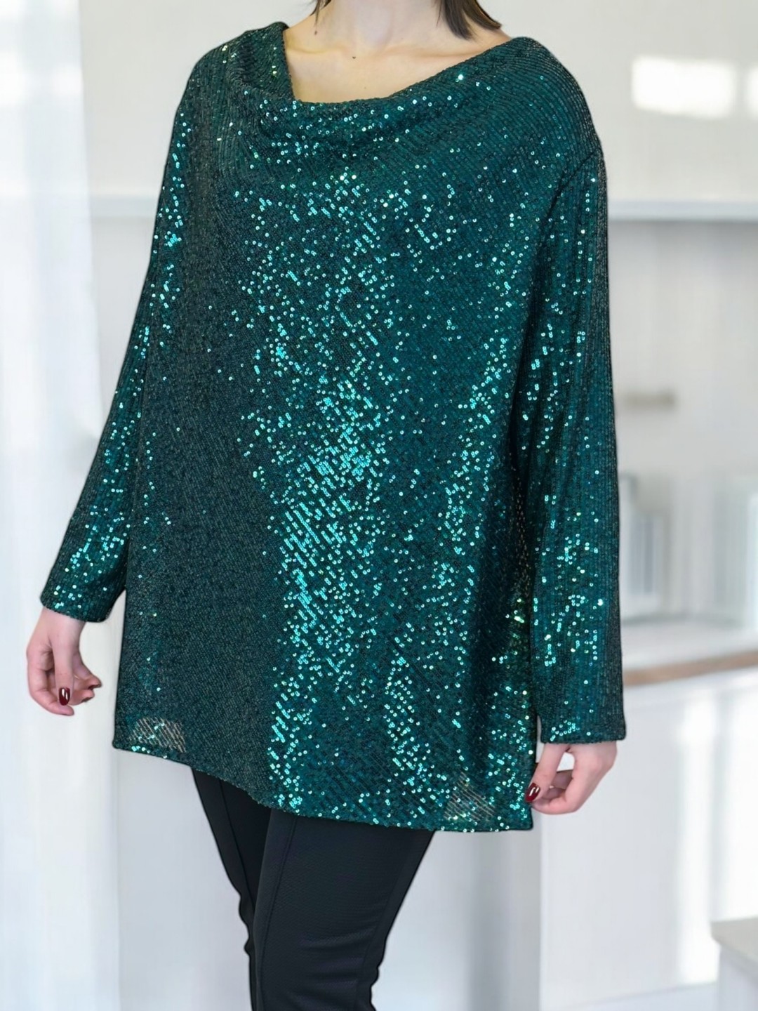 Ζωντανέψτε τις βραδινές σας εμφανίσεις με αυτήν την ντραπέ μπλούζα plus size! Διακοσμημένη με εντυπωσιακές παγιέτες, προσθέτει πολυτέλεια στο στυλ σας. Διατίθεται σε one size, προσφέροντας σας άνεση και κολακεύοντας τις καμπύλες σας.