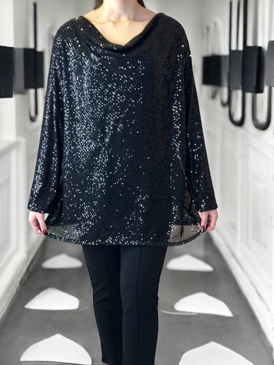 Αναβαθμίστε το στυλ σας με αυτήν την εντυπωσιακή ντραπέ μπλούζα plus size! Παγιέτες που αστράφτουν προσθέτουν λάμψη στην όλη εμφάνιση. Εφαρμόζει τέλεια, με μεγέθη One size για τη μαγεία της διαφορετικότητας. Αποκτήστε την τώρα!