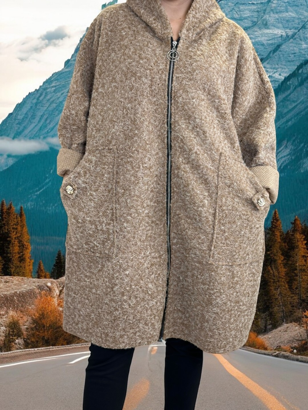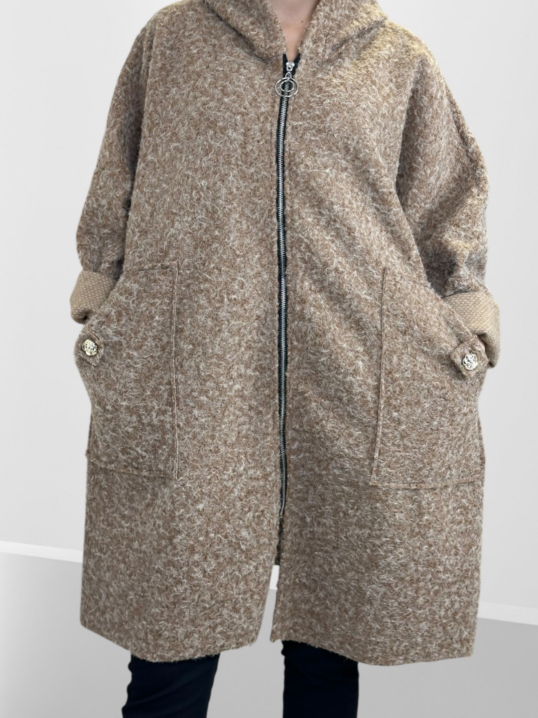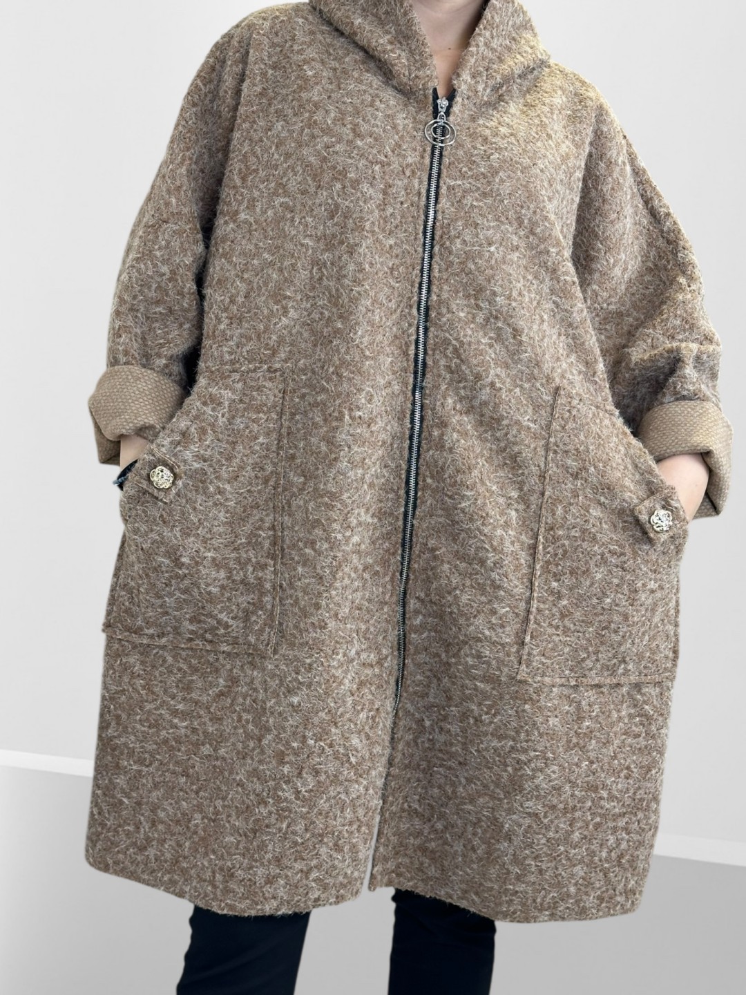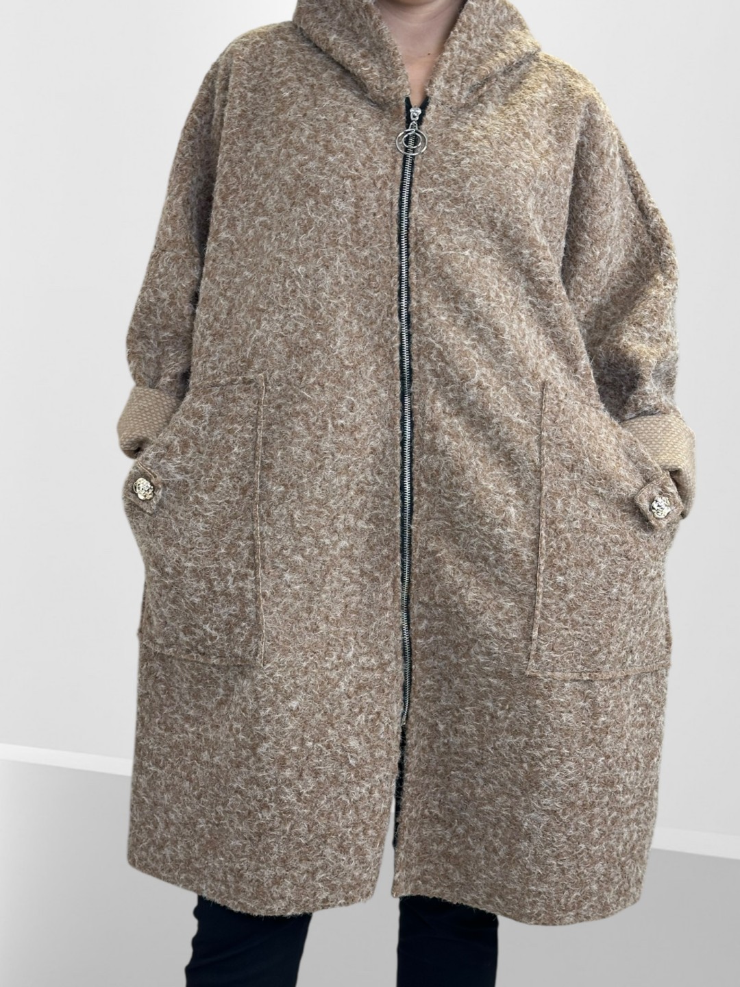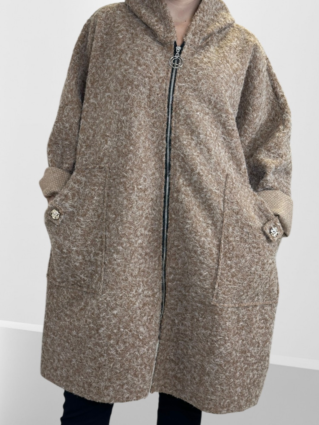 Κάντε δική σας αυτή την παλτοζακέτα plus size με απαλή υφή και λουλουδάτη λεπτομέρεια που ενισχύει την θηλυκότητά σας. Κατασκευασμένη από 35% μαλλί, 45% ακρυλικό και 20% πολυεστέρας, υπόσχεται ζεστασιά και άνεση σε κάθε σας εμφάνιση. Είναι One size, αλλά ιδανική για plus size διαστάσεις!