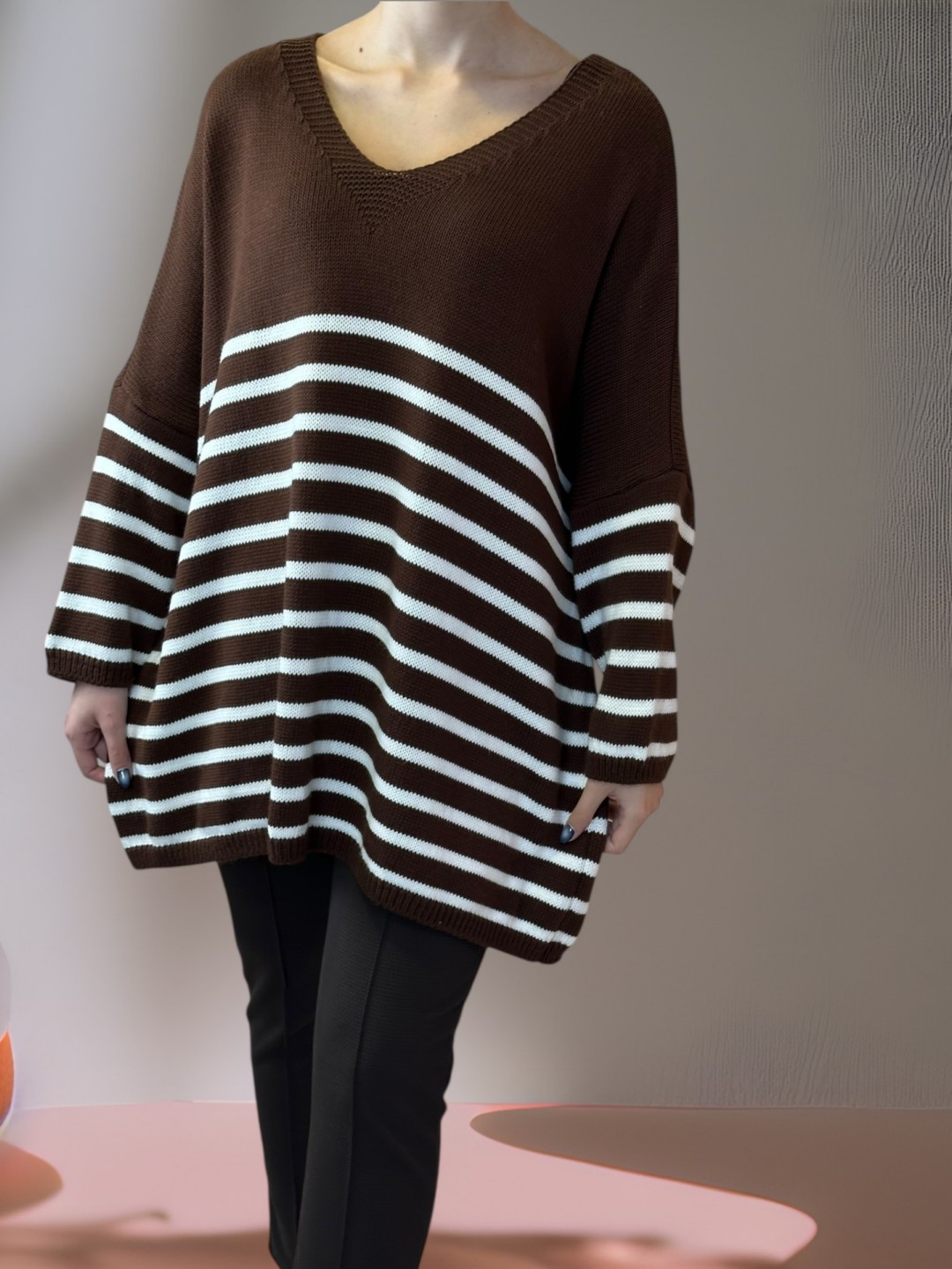 Ανανεώστε τη ντουλάπα σας με αυτό το γυναικείο πλεκτό πουλόβερ με ρίγες. Είναι chic, στυλάτο και ιδανικό για οποιαδήποτε περίσταση. Είναι διαθέσιμο σε plus size, κατασκευασμένο από 100% ακρυλικό για μέγιστη άνεση. Μην χάσετε την ευκαιρία αυτή!