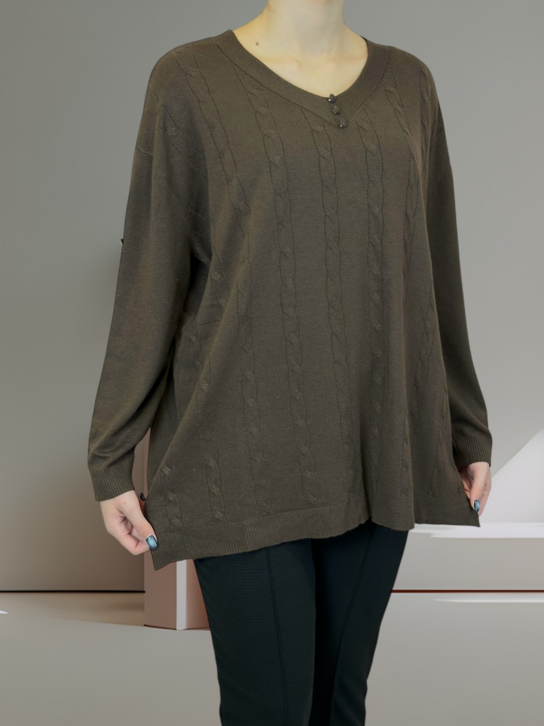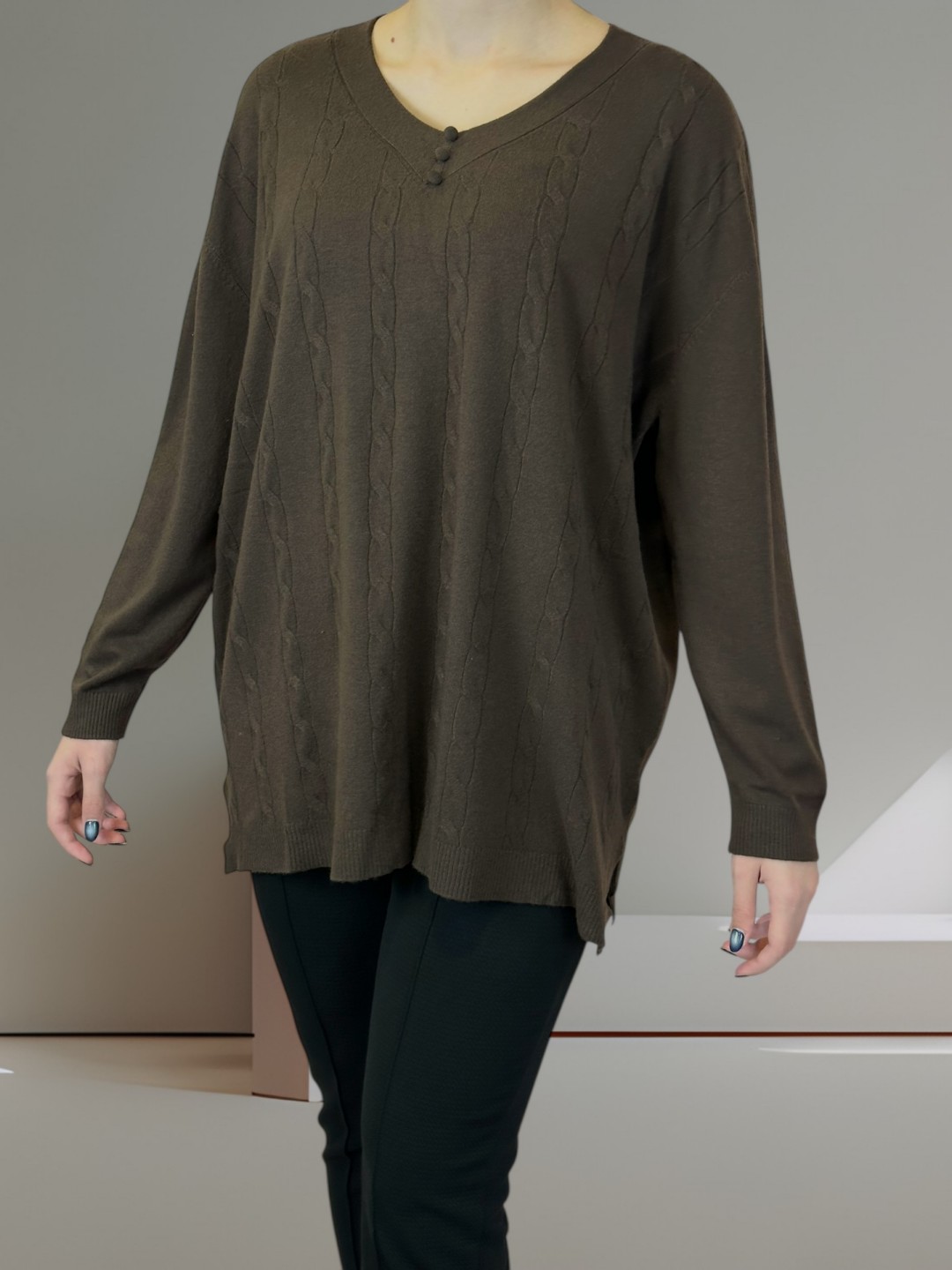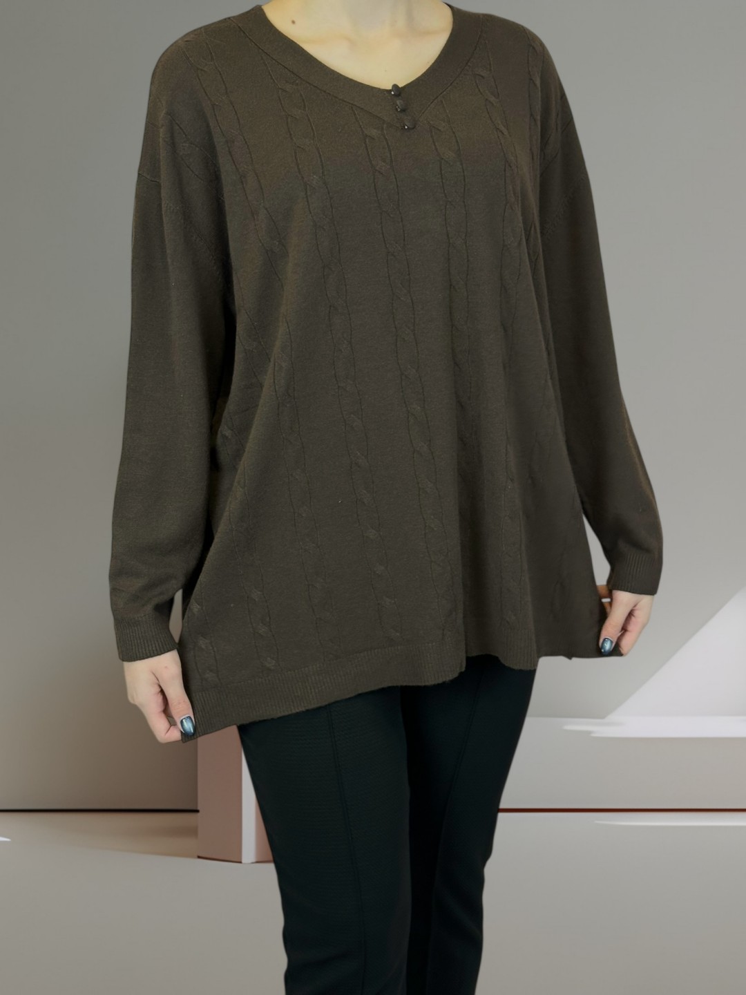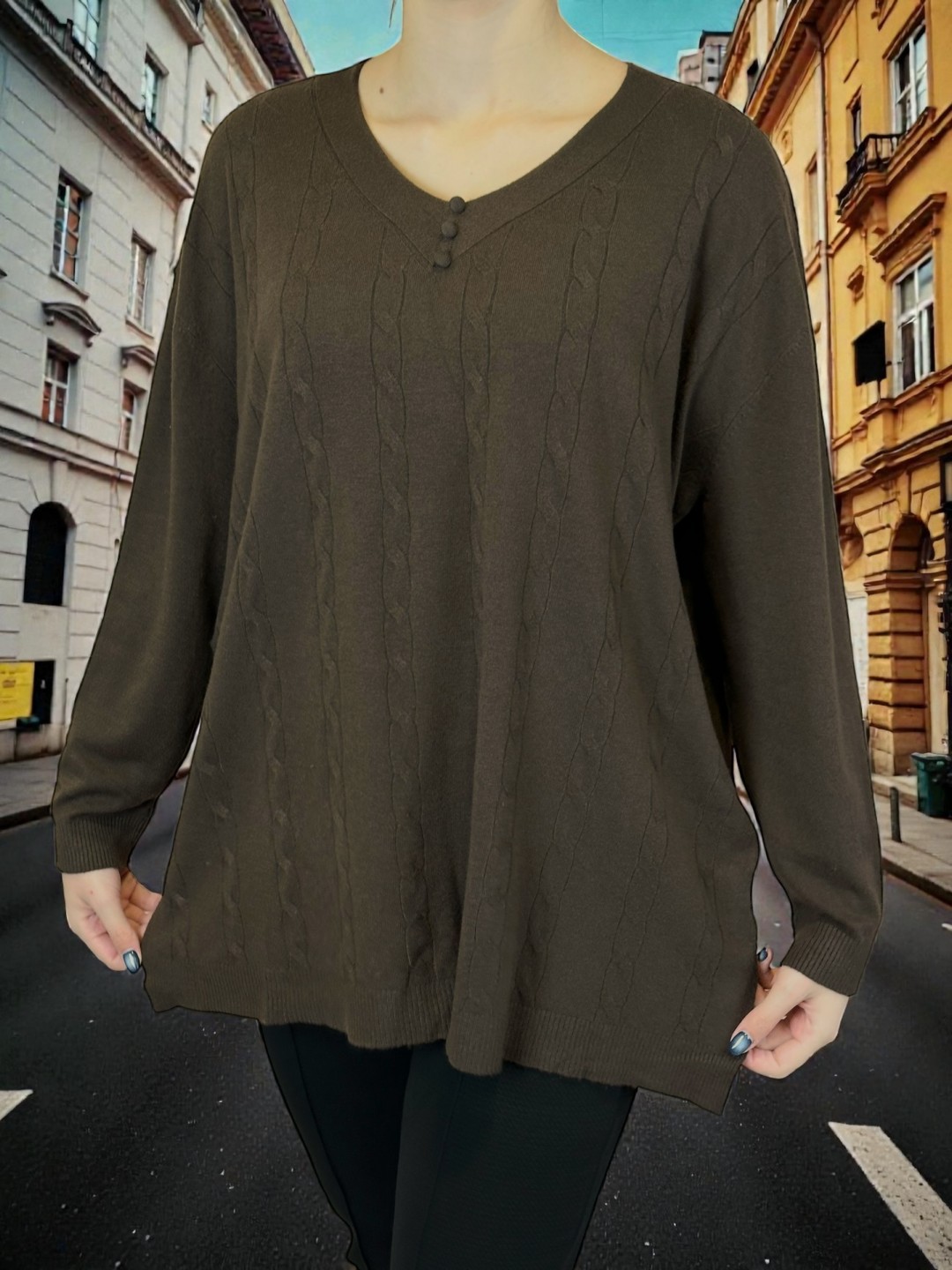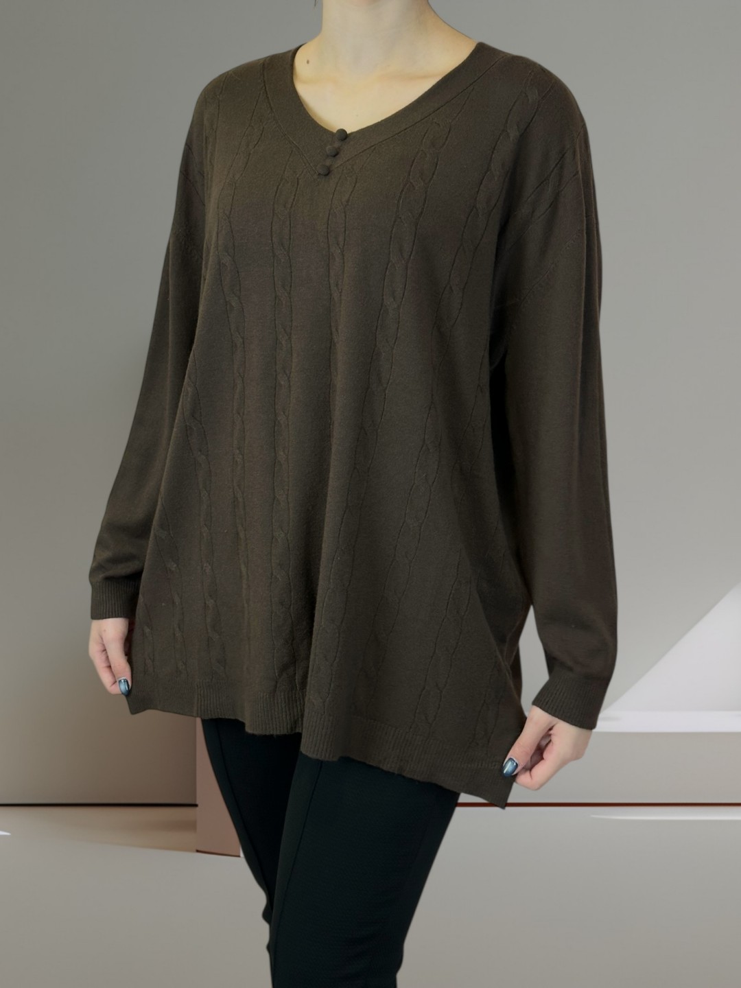 Κάνε δικό σου αυτό το πλεκτό top σε plus size! Με μοτίβο πλέξης και τριπλή λεπτομέρεια κουμπιών, θα διακρίνεται σε κάθε σύνολο. Σύνθεση από 40% poliamide, 20% modal, 20% viscoza, 10% elastan και 10% poliester, προσφέρει άνεση και ελαστικότητα. Ιδανικό για κάθε σωματότυπο.