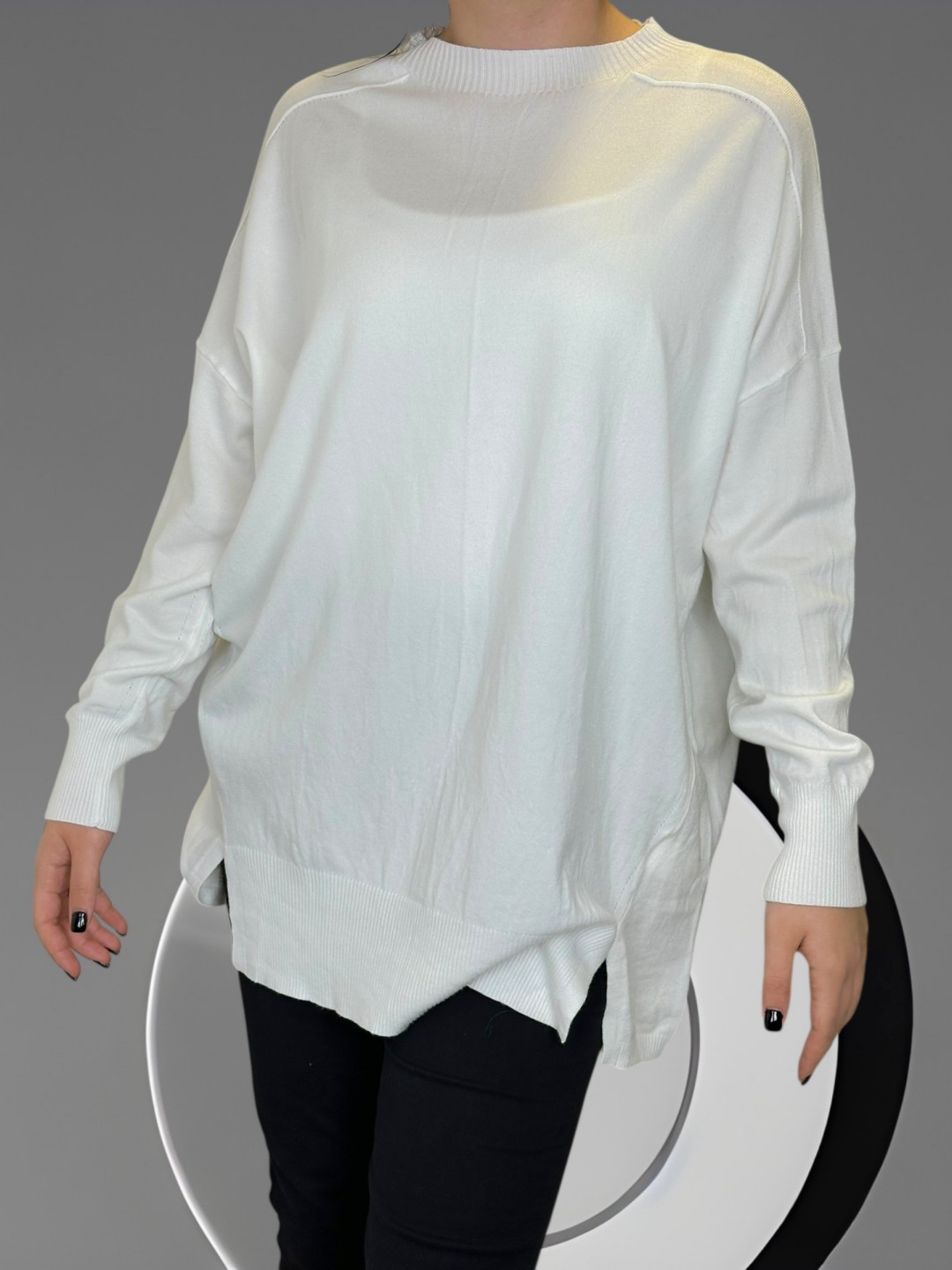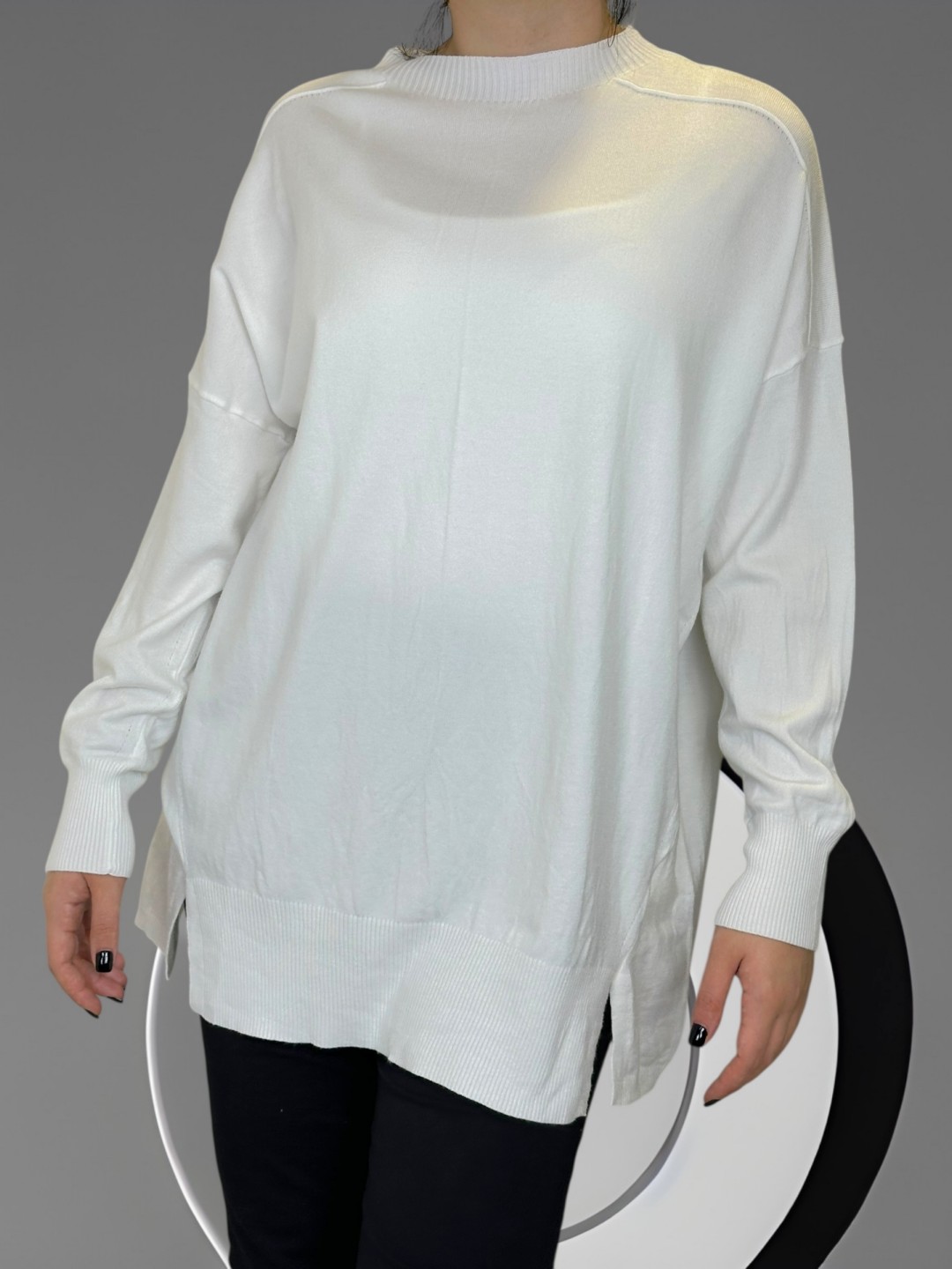 Απαλό, καθημερινό πουλόβερ plus size, κατασκευασμένο από ανθεκτικό και ευχάριστο στην υφή μείγμα 53% viscoza, 19% nylon και 28% πολυεστέρα. Προσφέρεται στο διαχρονικό one size, καλύπτοντας άνετα κάθε σωματότυπο.