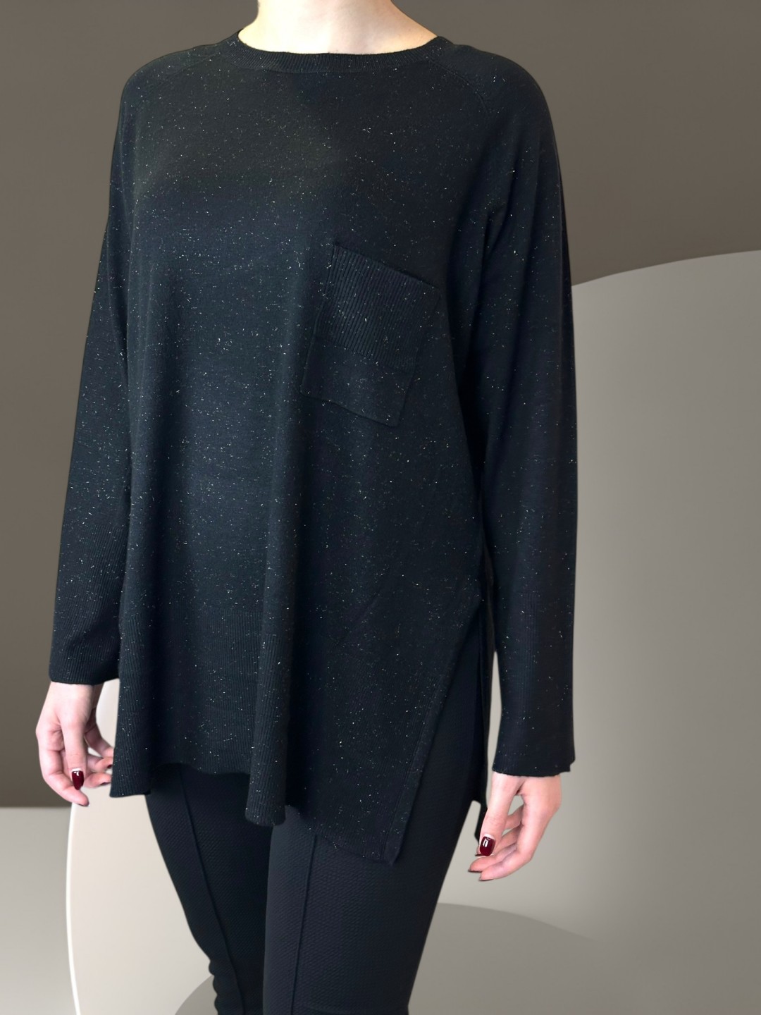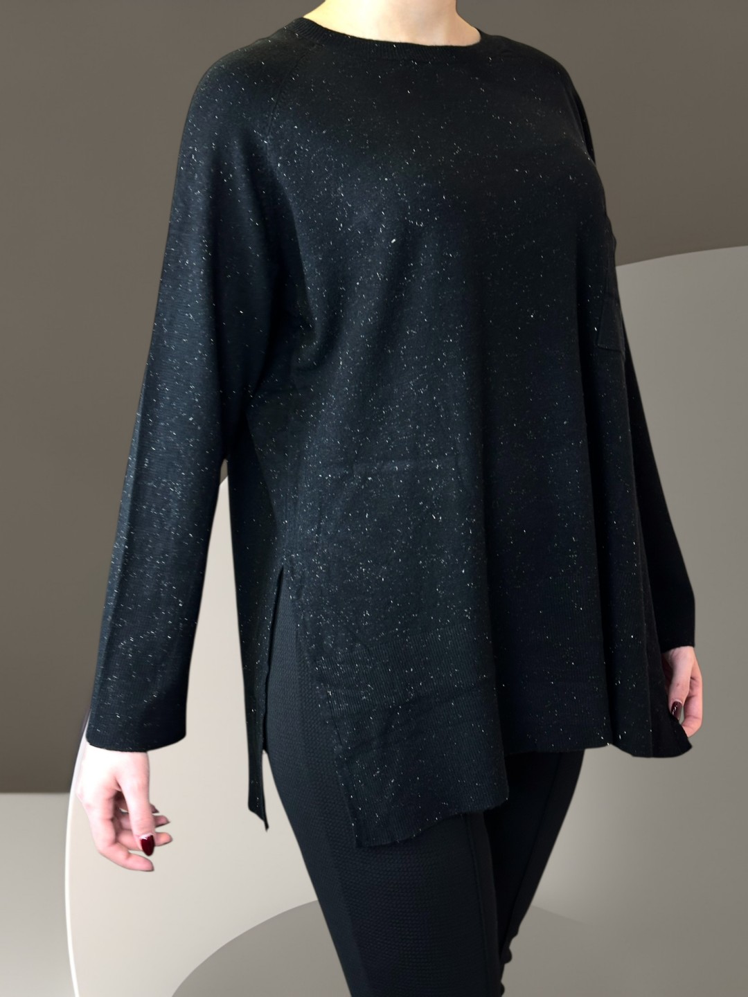 Αναβαθμίστε την χειμερινή σας γκαρνταρόμπα με το πρεμιουμ πουλόβερ V σε plus size, με λαμπερή ασημί κλωστή. Ιδανικό για κάθε περίσταση, προσφέρει άνεση και αρχοντική αίσθηση. Μοναδικό μέγεθος.