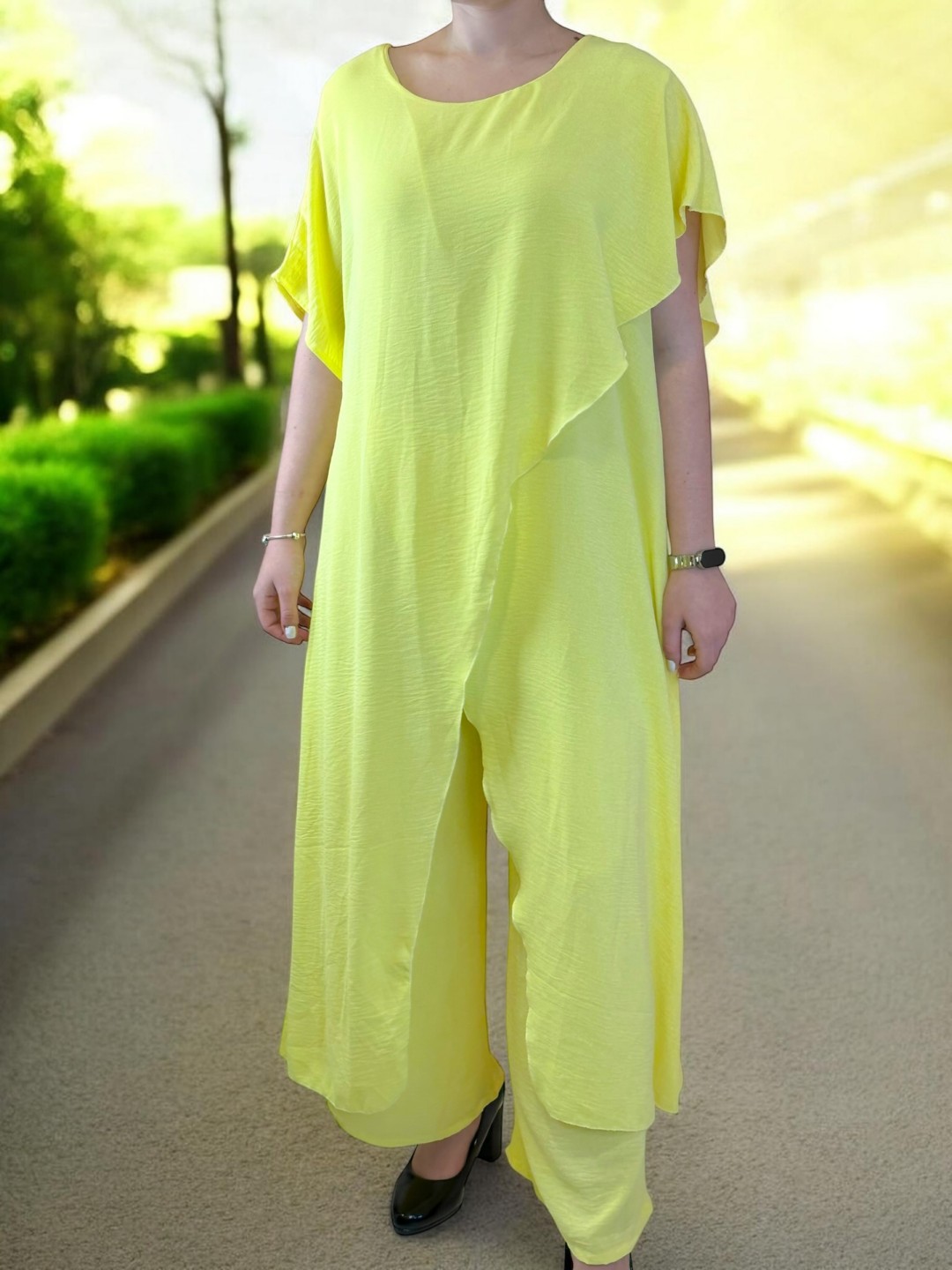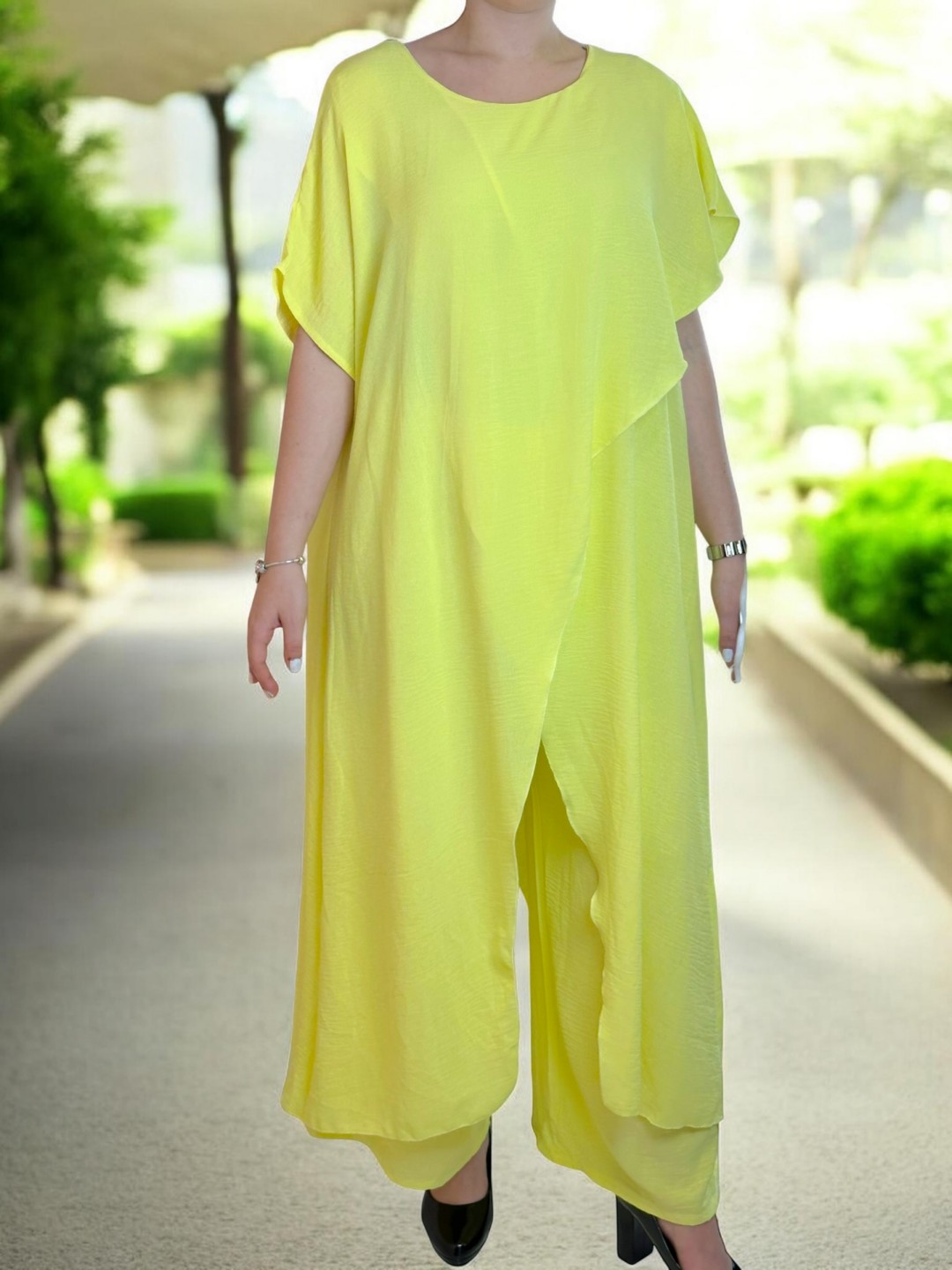 Αναδείξτε την κομψότητα σας με αυτό το chic σετ plus size, που περιλαμβάνει long μπλούζα. Κατασκευασμένο από 40% βισκόζη, 55% πολυεστέρα και 5% ελαστάν, είναι άνετο, ανθεκτικό και ταυτόχρονα εντυπωσιακό. Διατίθεται στο μέγεθος One size.