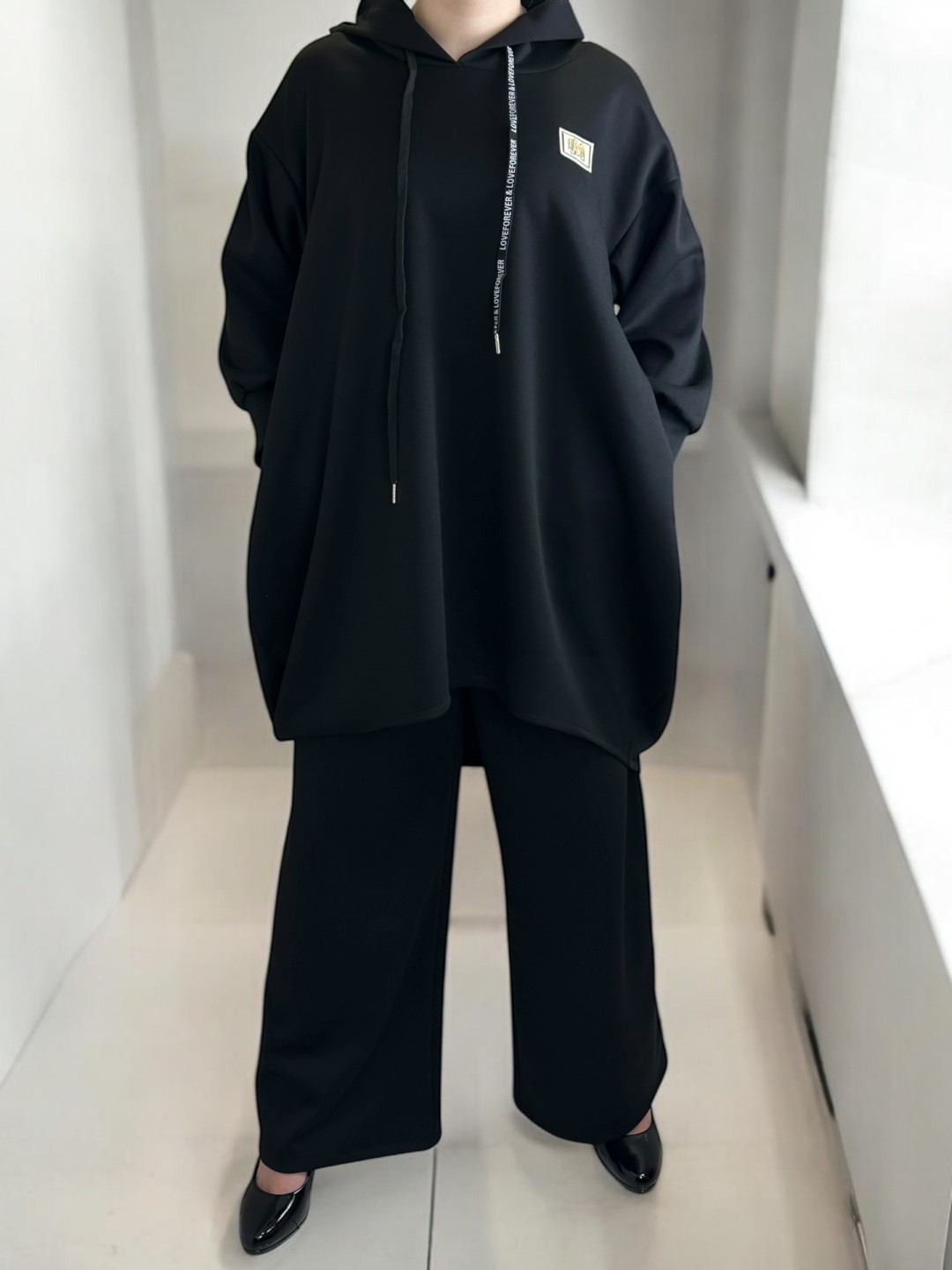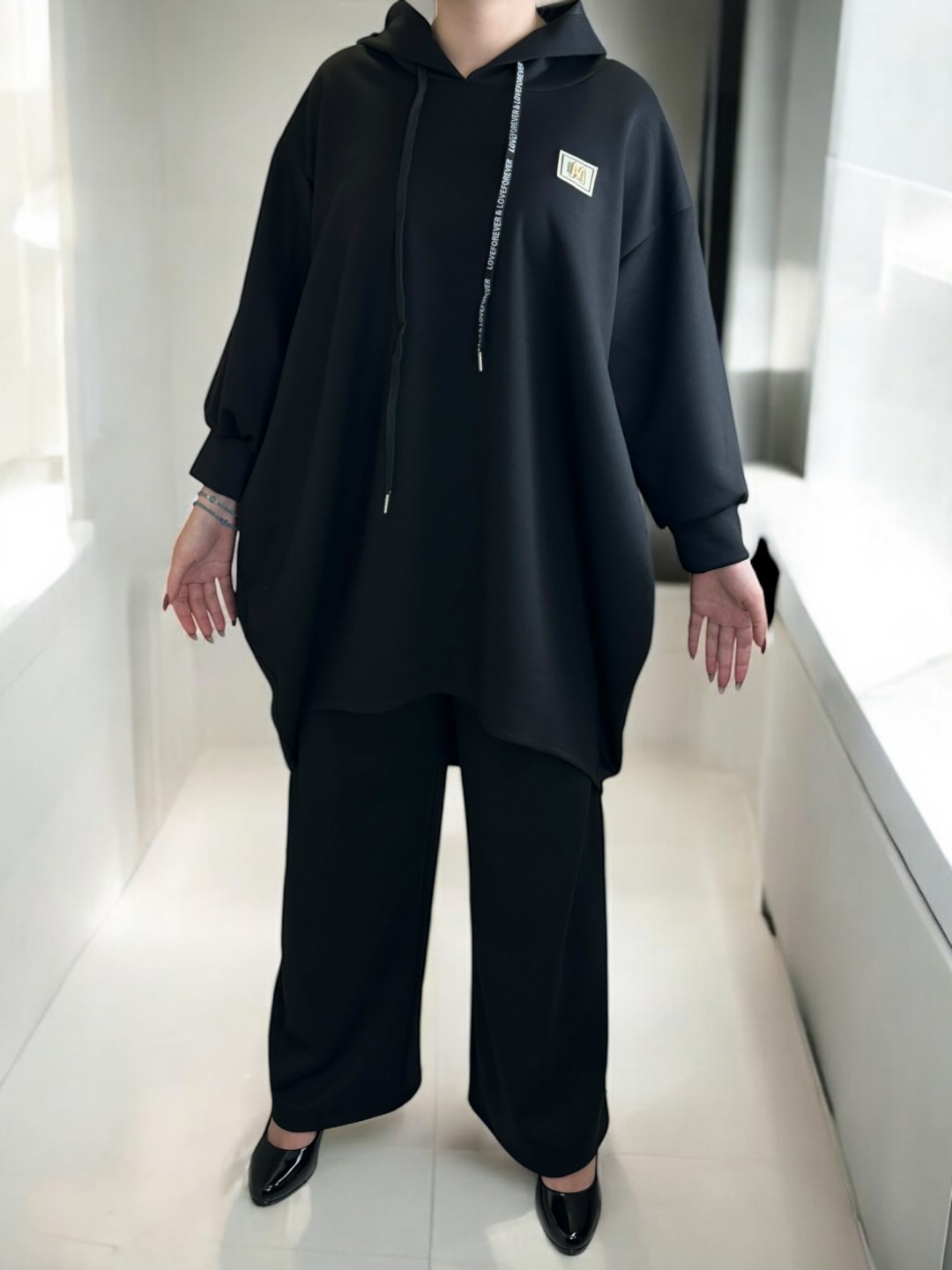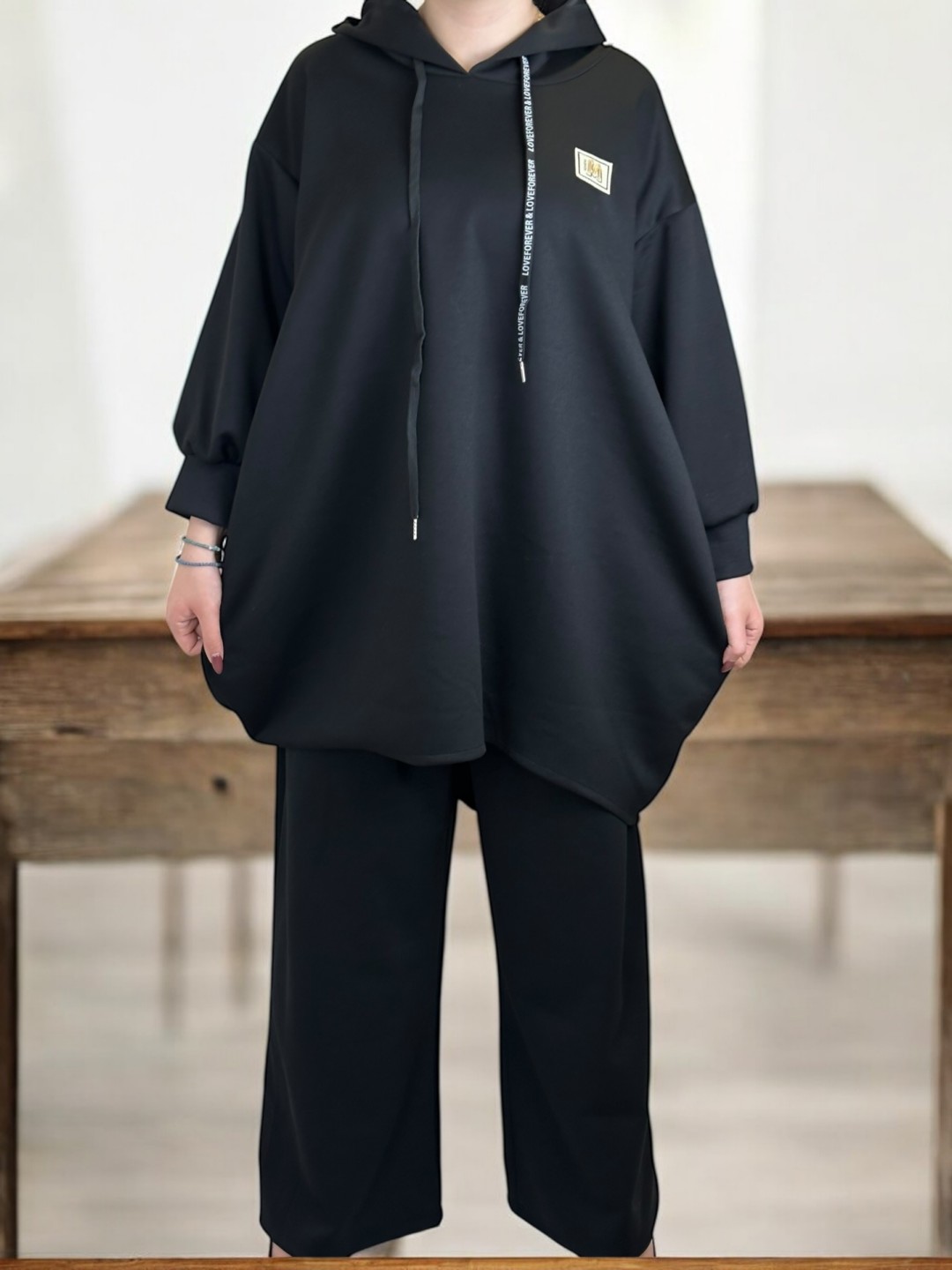 Αγκαλιάστε την απόλυτη άνεση με αυτό το σετ φούτερ, αποτελούμενο από μακριά μπλούζα, κατάλληλο για τις καθημερινές σας εμφανίσεις. Σχεδιασμένο για plus size εφαρμογή, με σύνθεση 40% viscoza, 8% ελασταν και 52% poliester, εξασφαλίζει μέγιστη άνεση. Διαθέσιμο σε One size μέγεθος.
