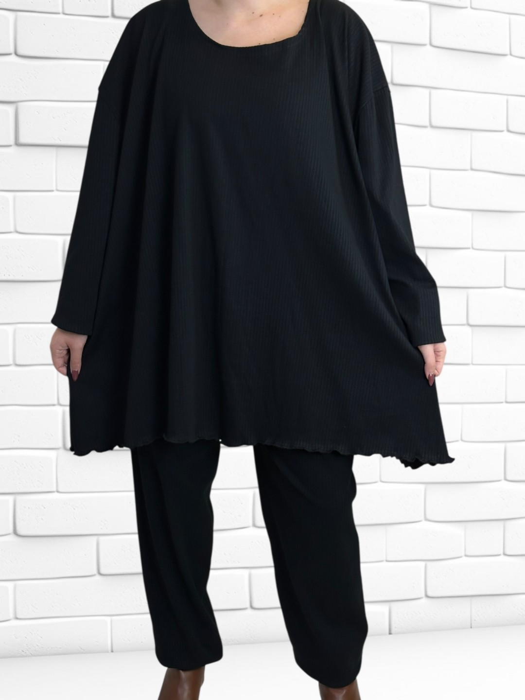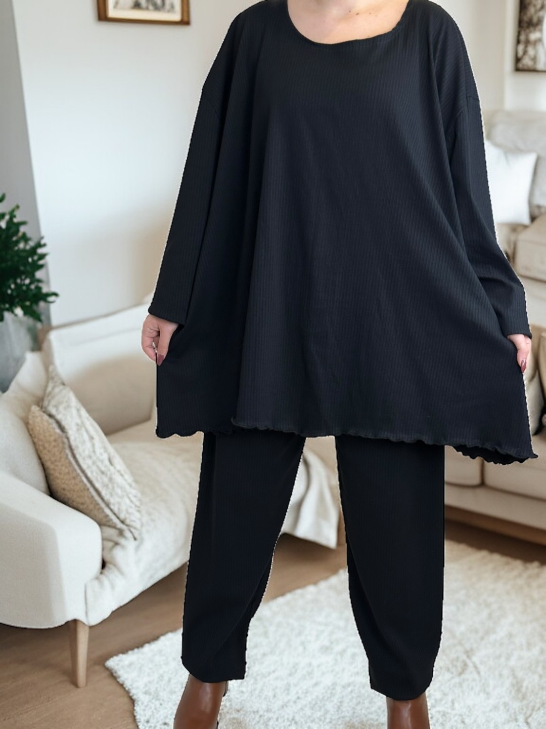 Ανανεώστε την γκαρνταρόμπα σας με αυτό το σετ plus size με λεπτές ρίγες για μοντέρνο look. Κατασκευασμένο από 95% βισκόζη και 5% ελαστάν, προσφέρει άνεση και εφαρμογή για όλα τα μεγέθη. One size ταιριάζει σε όλες!