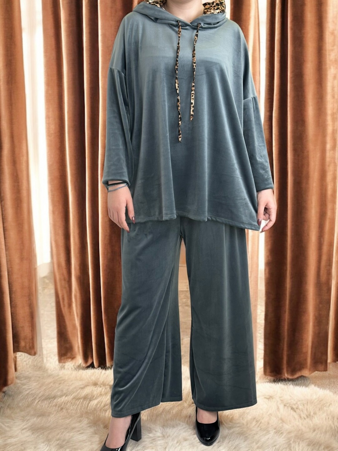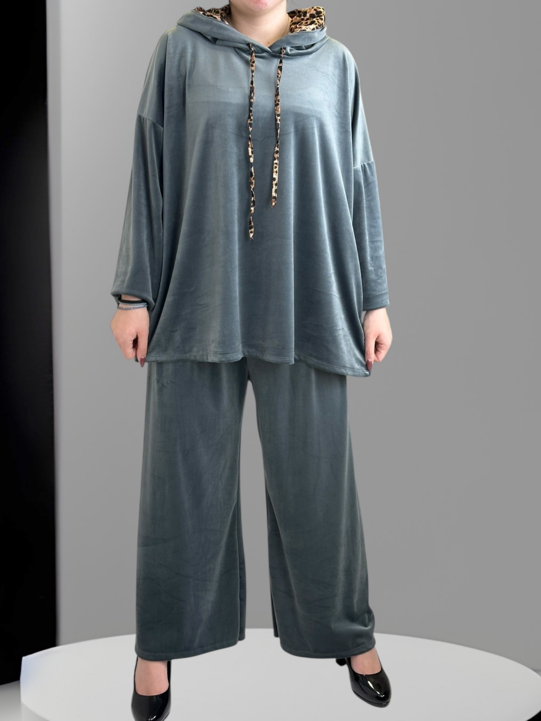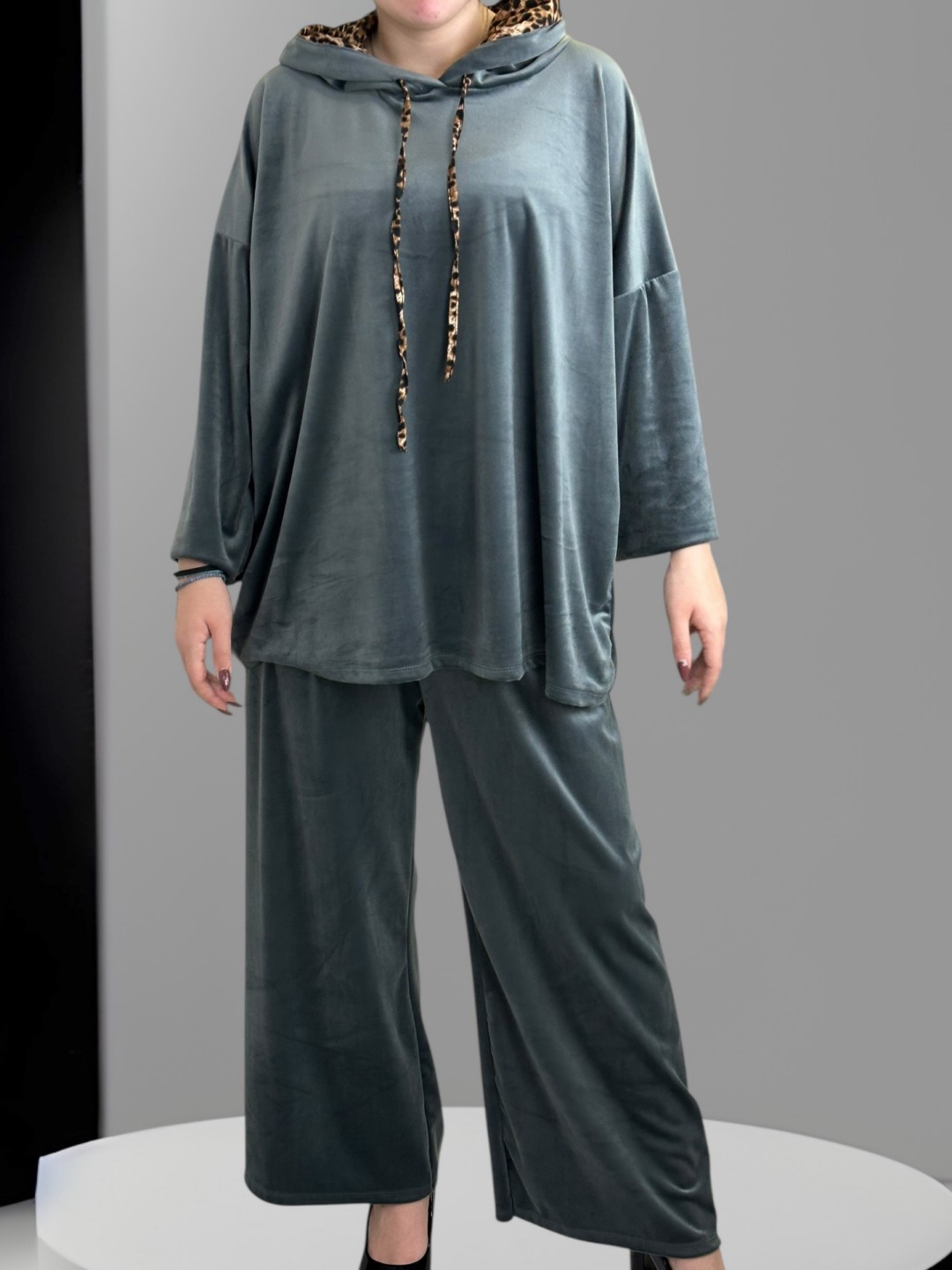 Πολυτελές σετ βελούδινο plus size, με λεπτομέρειες λεοπάρ που τραβούν την προσοχή. Έχει σύνθεση 95% πολυεστέρα και 5% ελαστάν για άνεση και εφαρμογή. Διαθέσιμο σε One size.